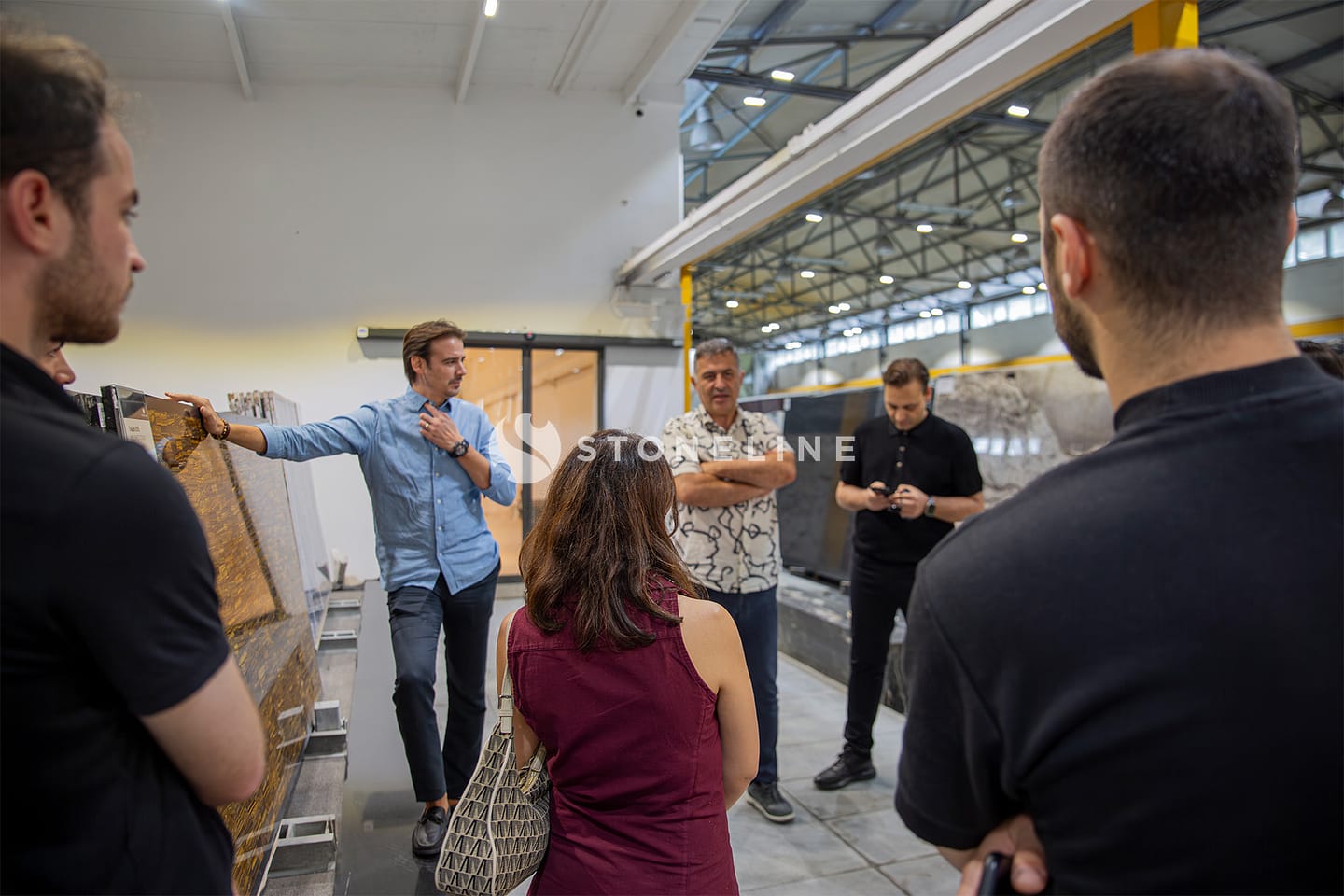 Following this presentation, which invited viewers to touch not just a surface but the very soul of the stone, our showroom tour commenced, featuring over 600 varieties of natural stone. Our guests experienced the stones they had discovered in the presentation in a physical space, closely observing their textures, colour transitions, and unique relationship with light.