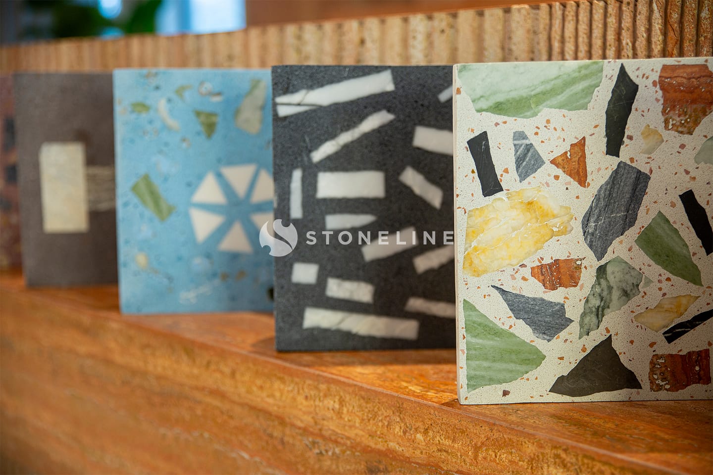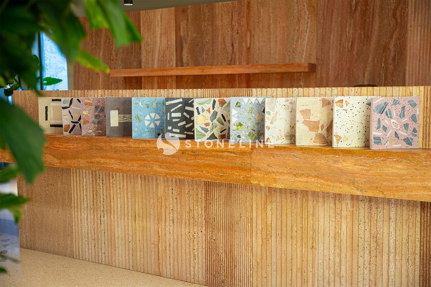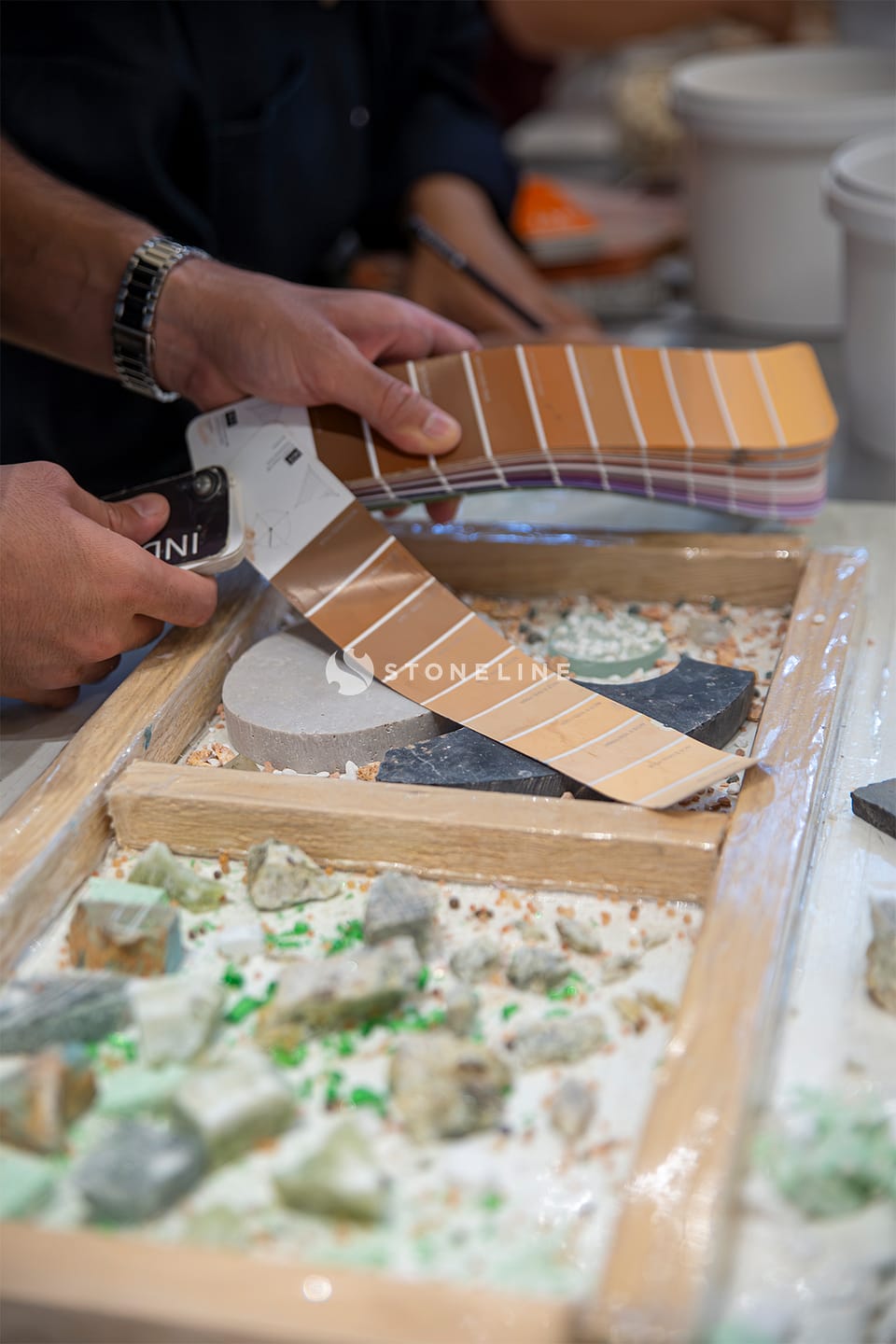 Depending on design preferences and stone thickness, we now also produce epoxy terrazzo with the Stoneline difference. We then continued with the ‘Palezzo’ workshop, born from an artisan approach that combines classic terrazzo aesthetics with the Palladian tradition.