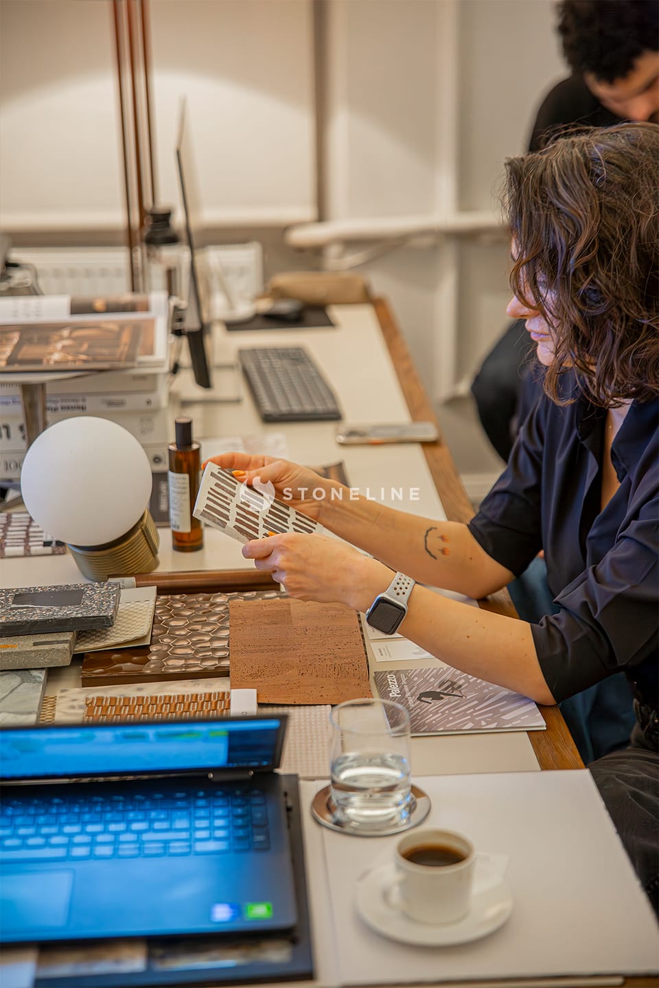 Following this presentation, which invited viewers to touch not just a surface but the very soul of the stone, our showroom tour commenced, featuring over 600 varieties of natural stone. Our guests experienced the stones they had discovered in the presentation in a physical space, closely observing their textures, colour transitions, and unique relationship with light.