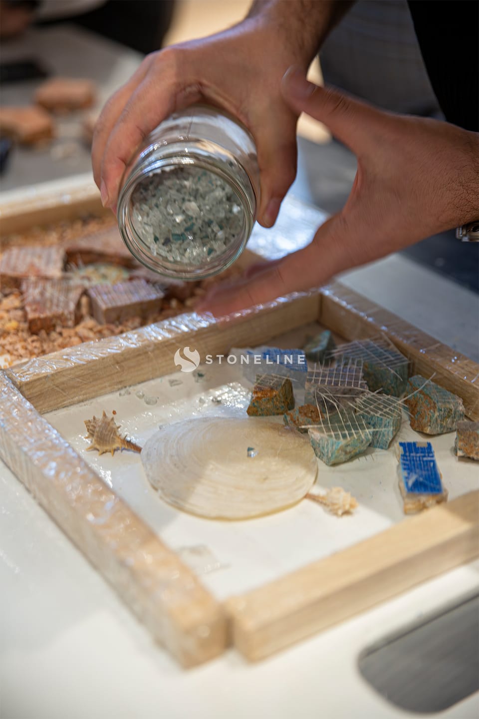 Depending on design preferences and stone thickness, we now also produce epoxy terrazzo with the Stoneline difference. We then continued with the ‘Palezzo’ workshop, born from an artisan approach that combines classic terrazzo aesthetics with the Palladian tradition.