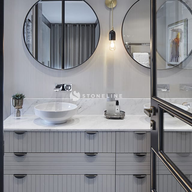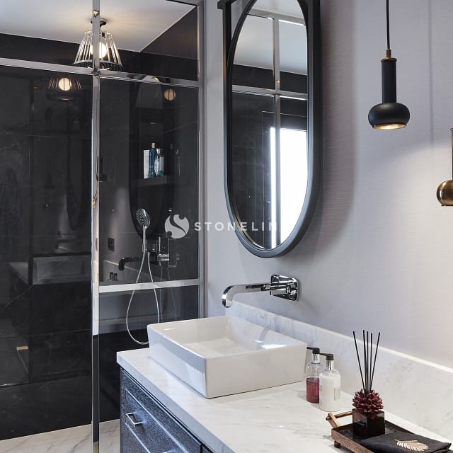 Elegance and functionality come together in this private residence. Interiors are decorated with Bianco Fantastico marble in the bathroom and kitchen, while King Black is used as curb. Green&Grey enriches the bar, and Beldere stands out on the dinner table for timeless design.