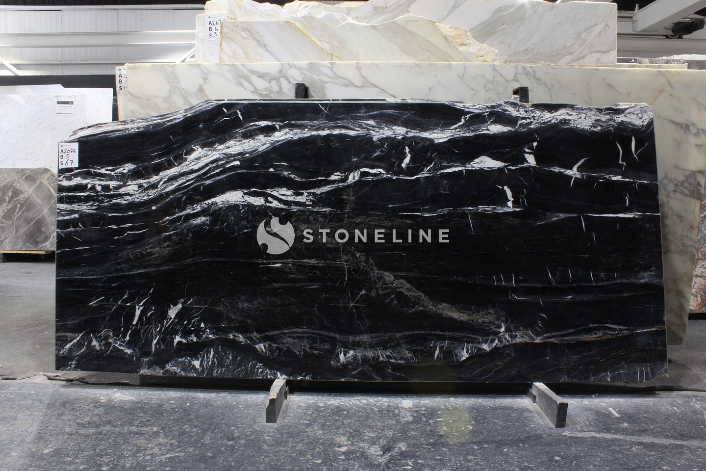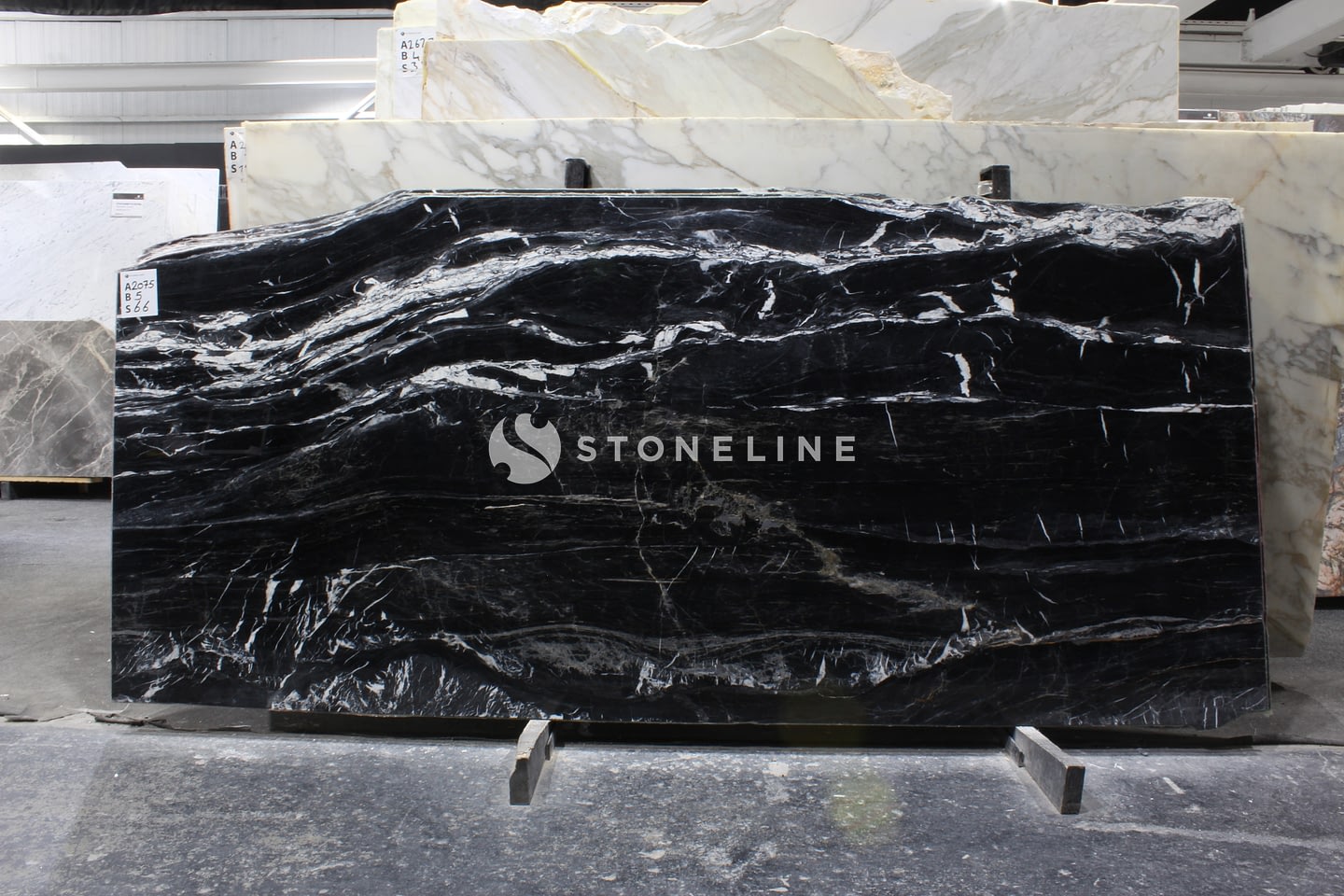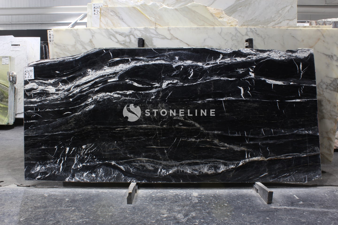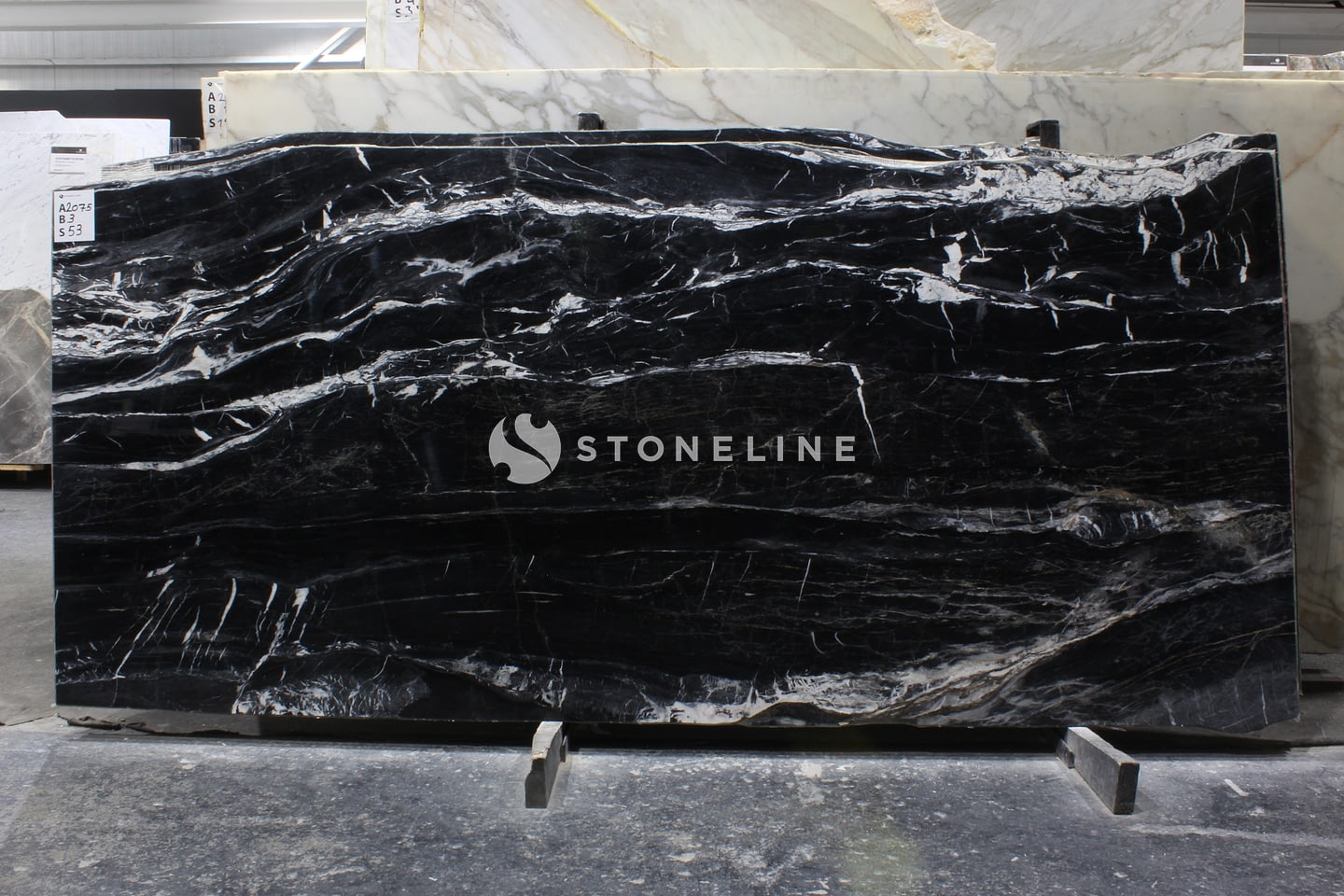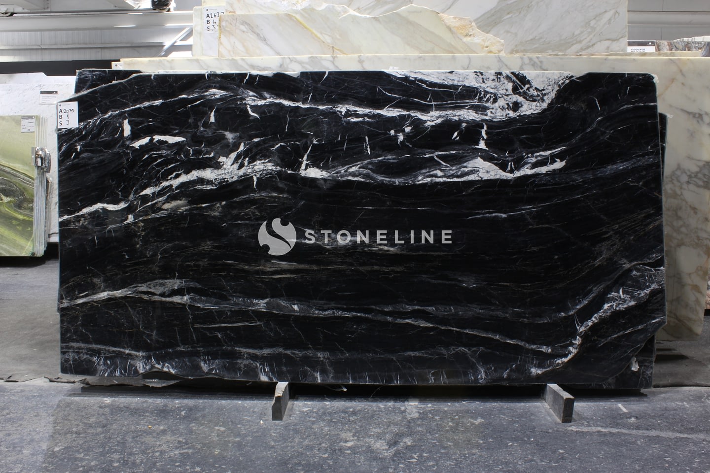 ARTIC BLACK marble slabs are available with a surface thickness of 2 cm, suitable for various architectural and design applications.