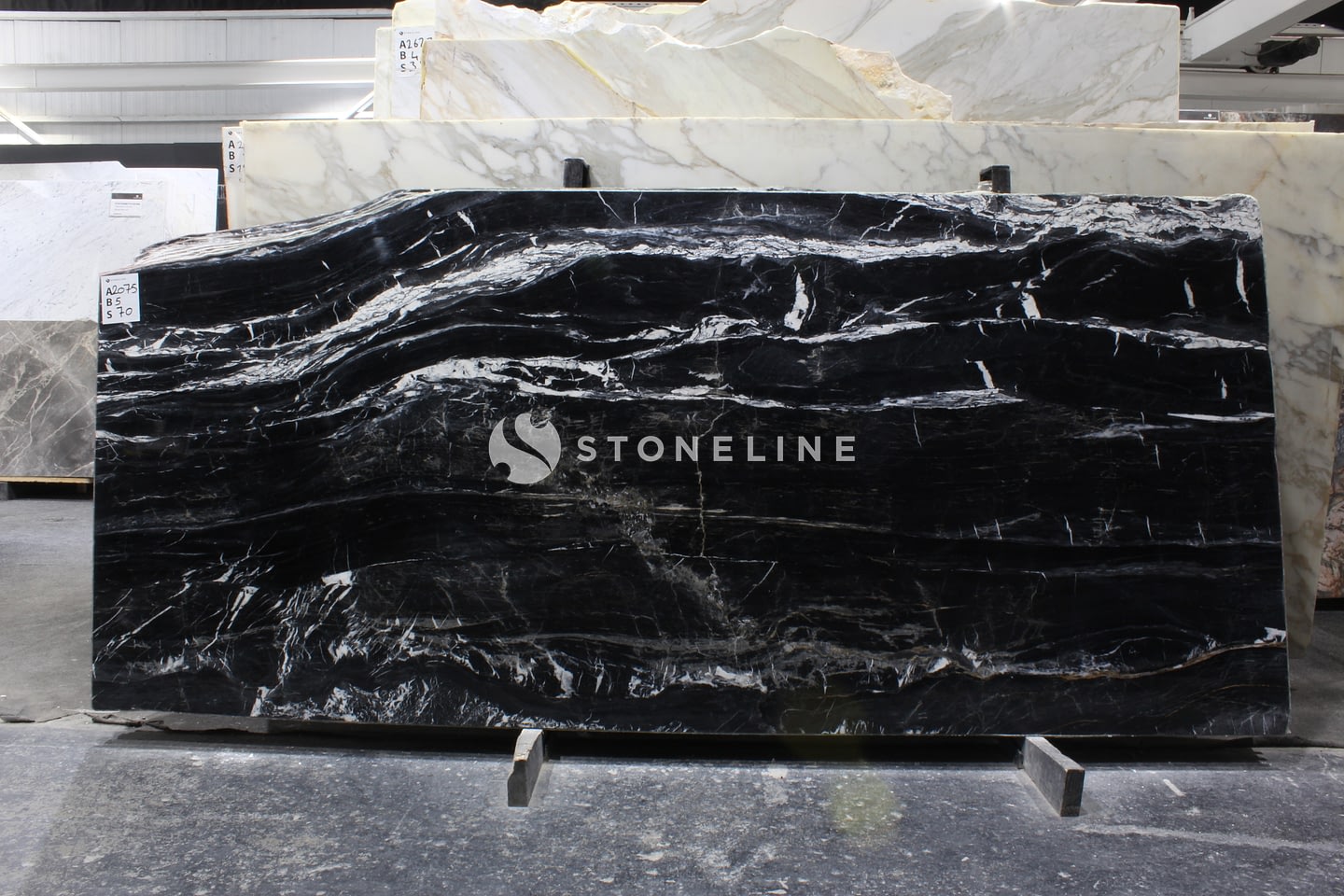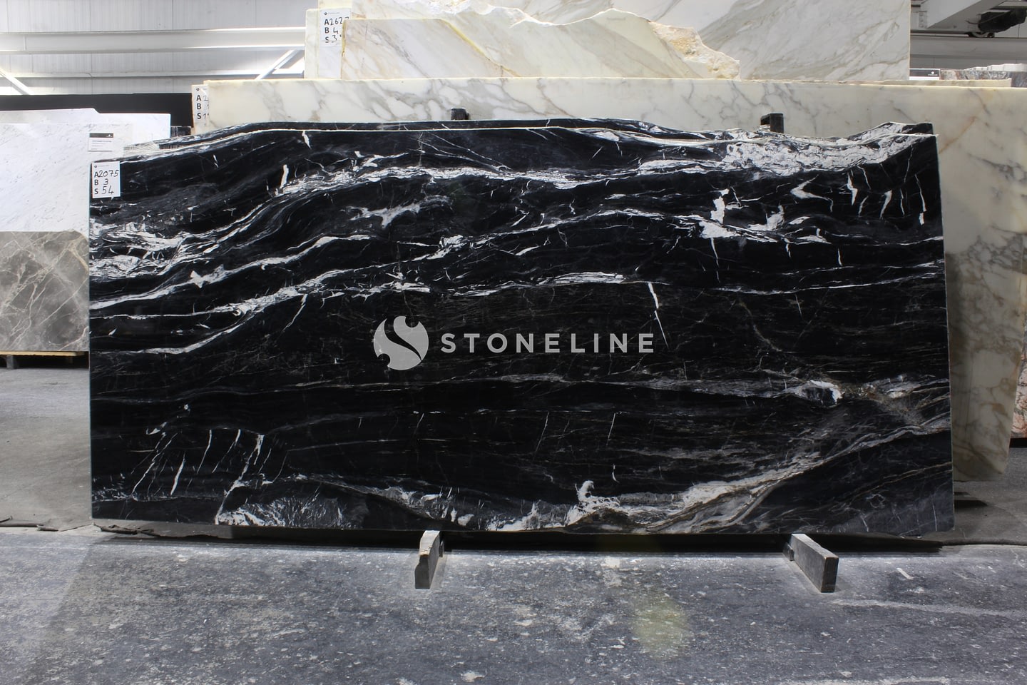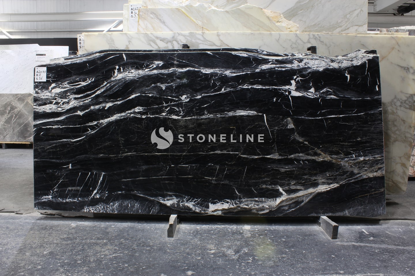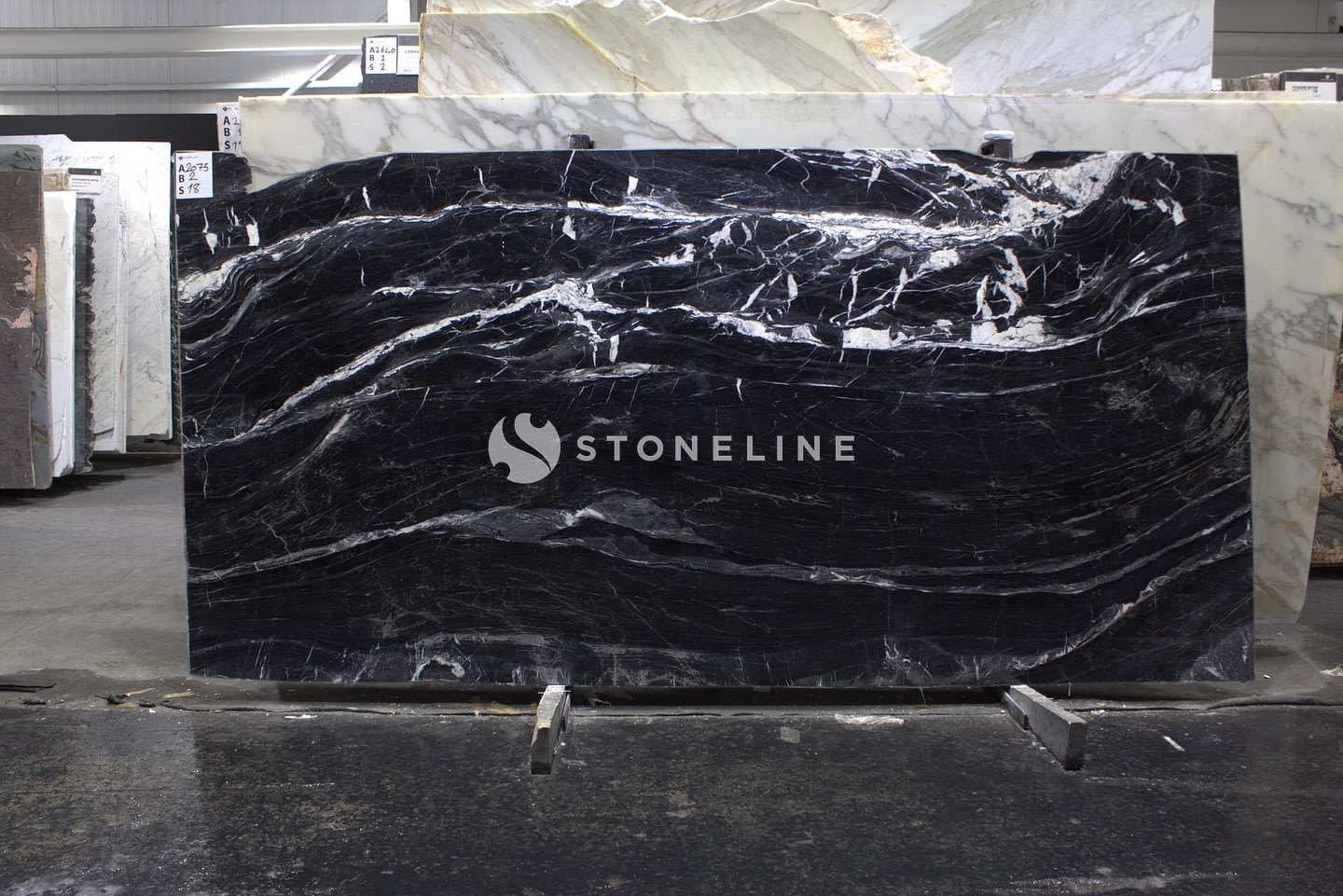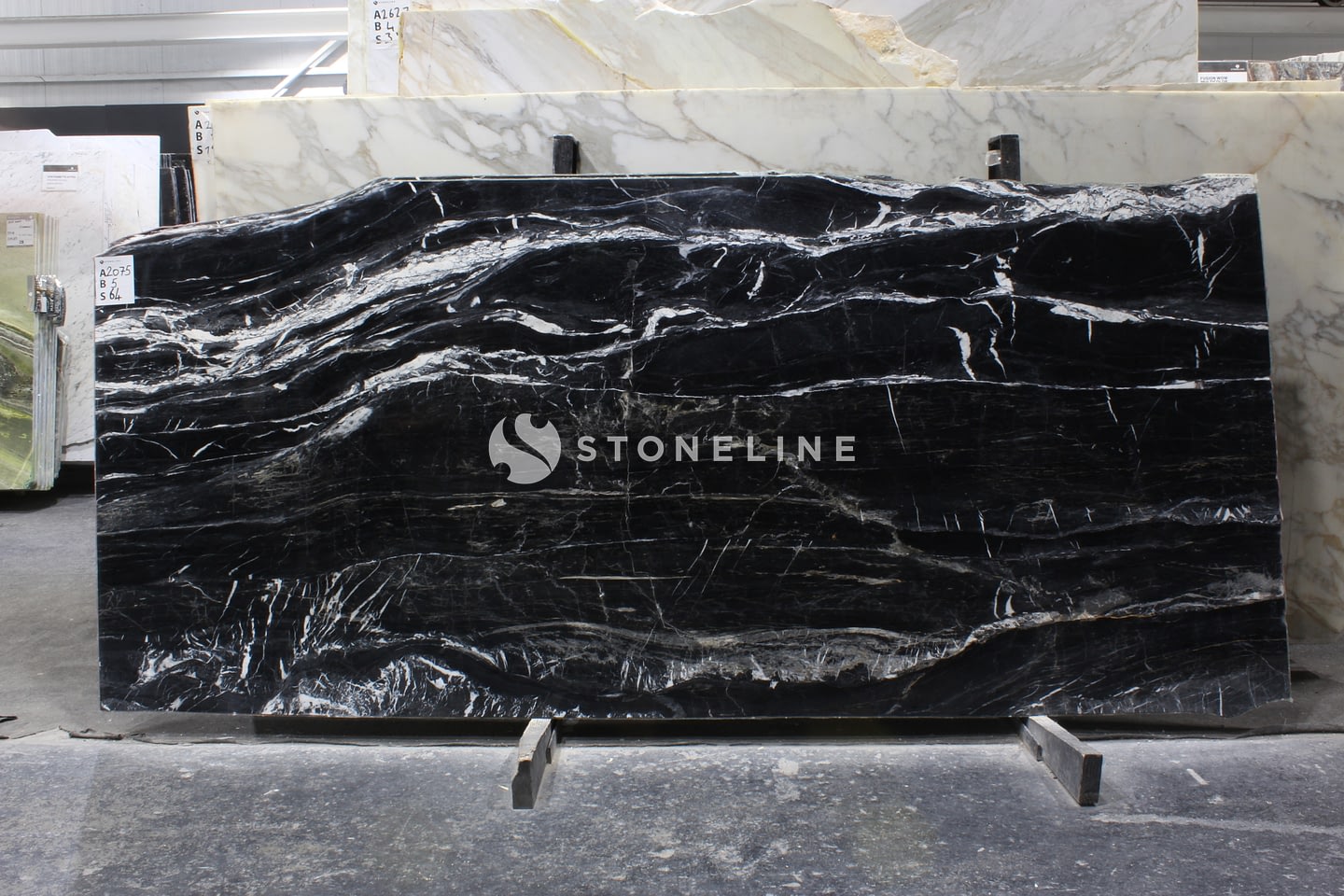 ARTIC BLACK marble slabs are available with a surface thickness of 2 cm, suitable for various architectural and design applications.
