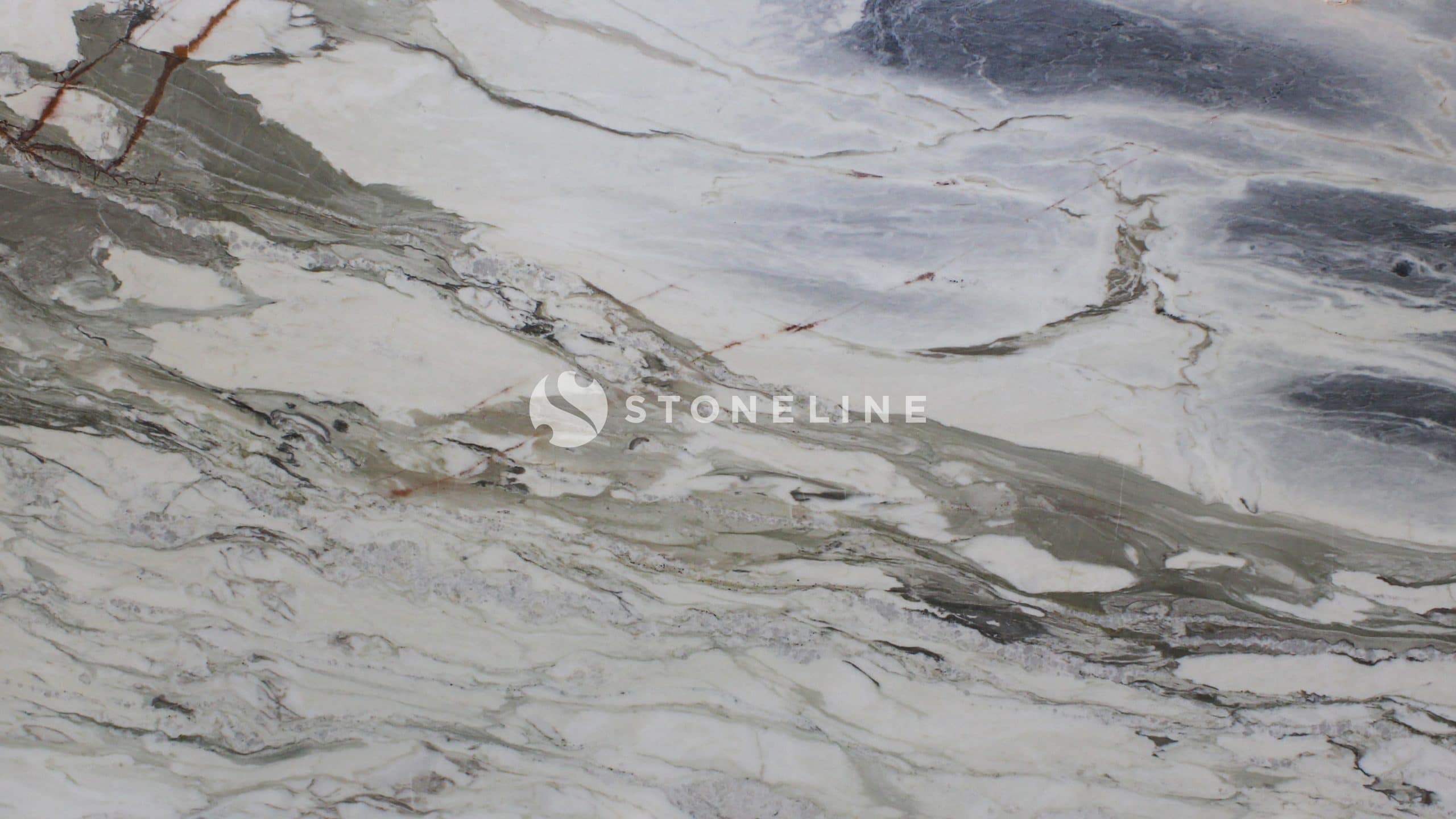 This marble displays a harmonious blend of gray, grayish-green, and brown tones on a white background, creating a natural and elegant veining pattern ideal for various design styles.