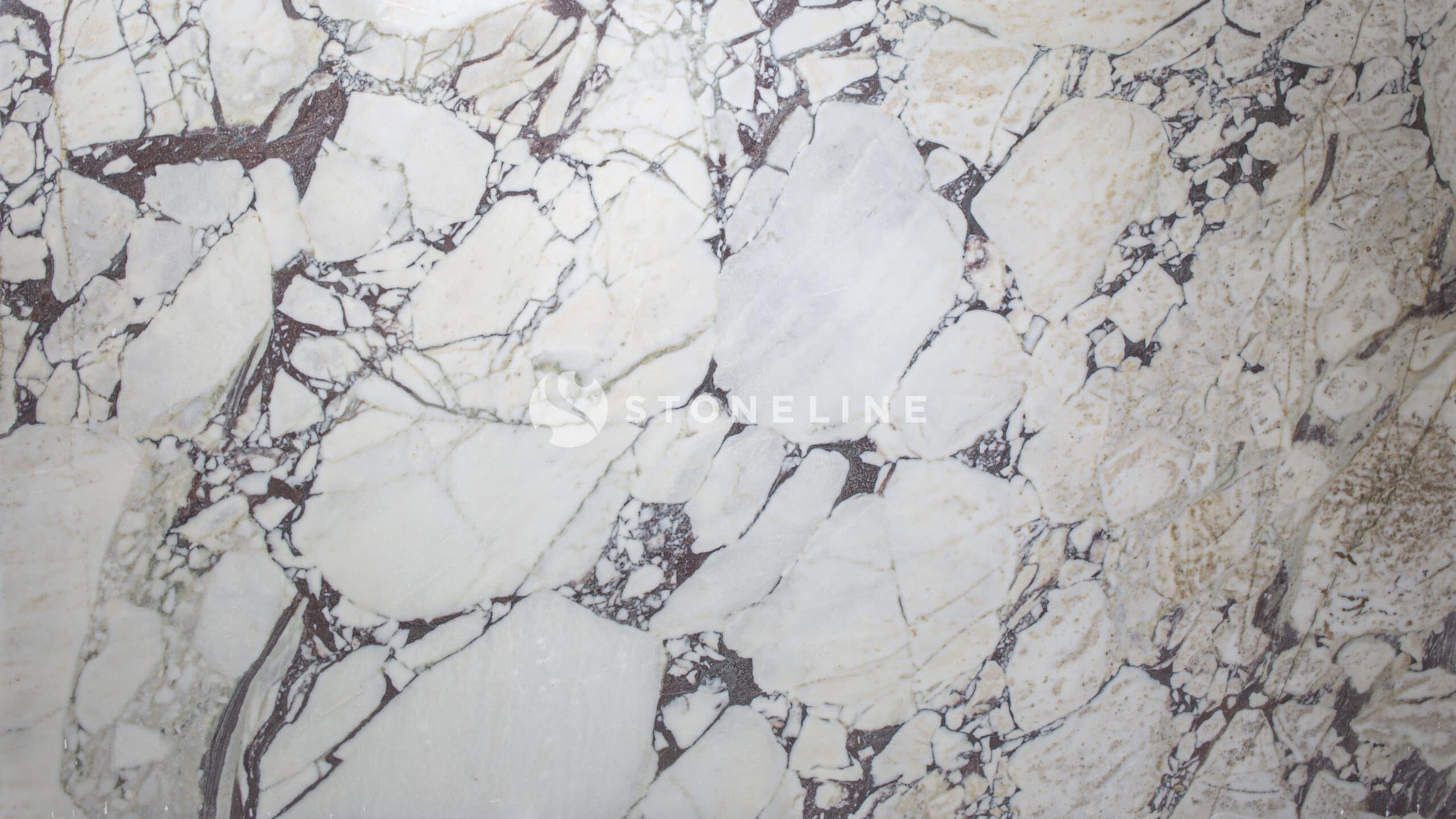 CALACATTA VIOLA typically features a white background with beige and brown hues, complemented by grey and occasional yellow tones in varying diagonal, mixed, or linear vein structures, creating dynamic and unique surface aesthetics.
