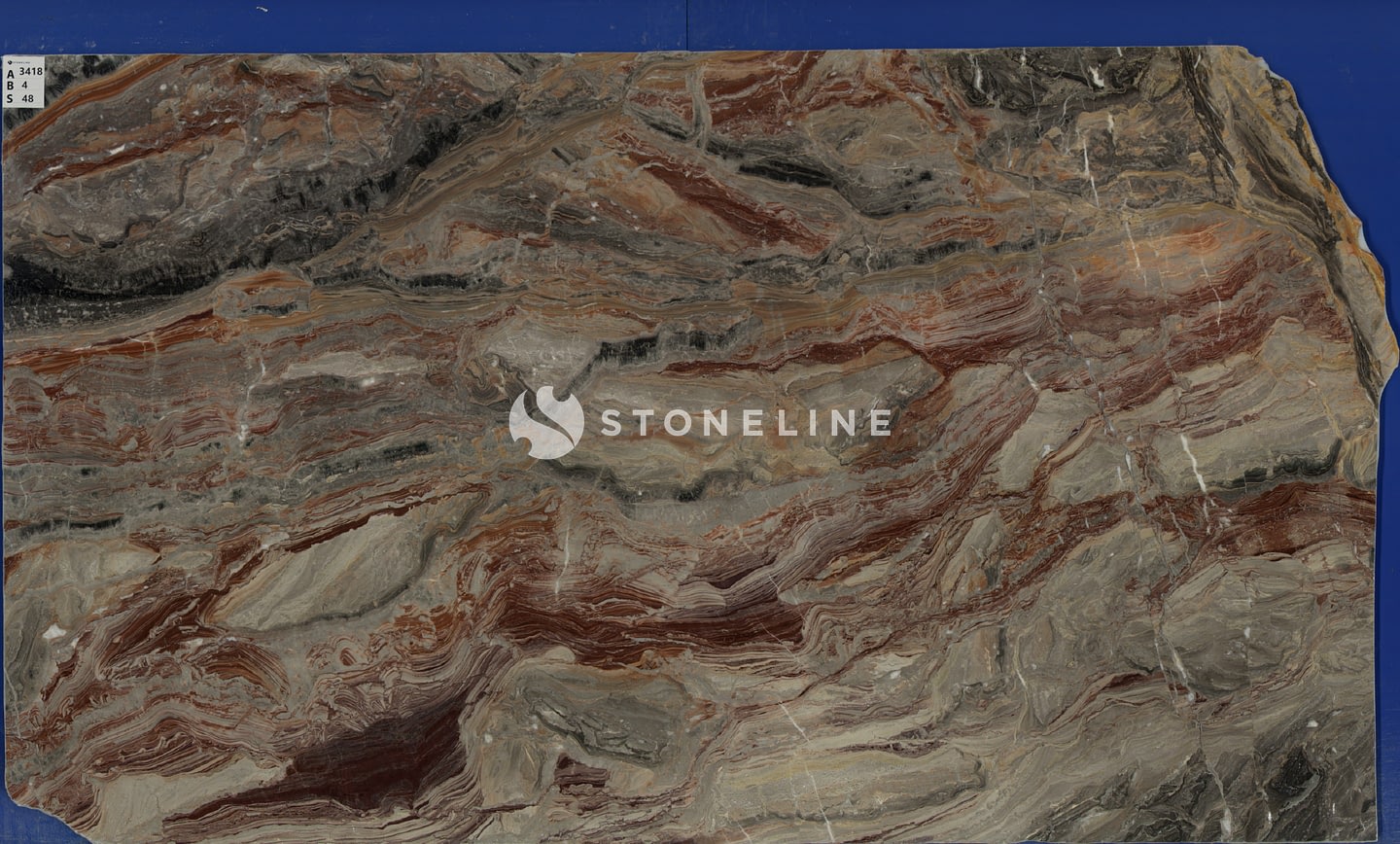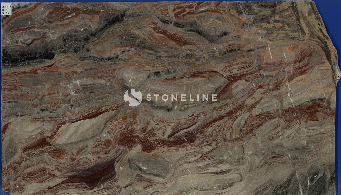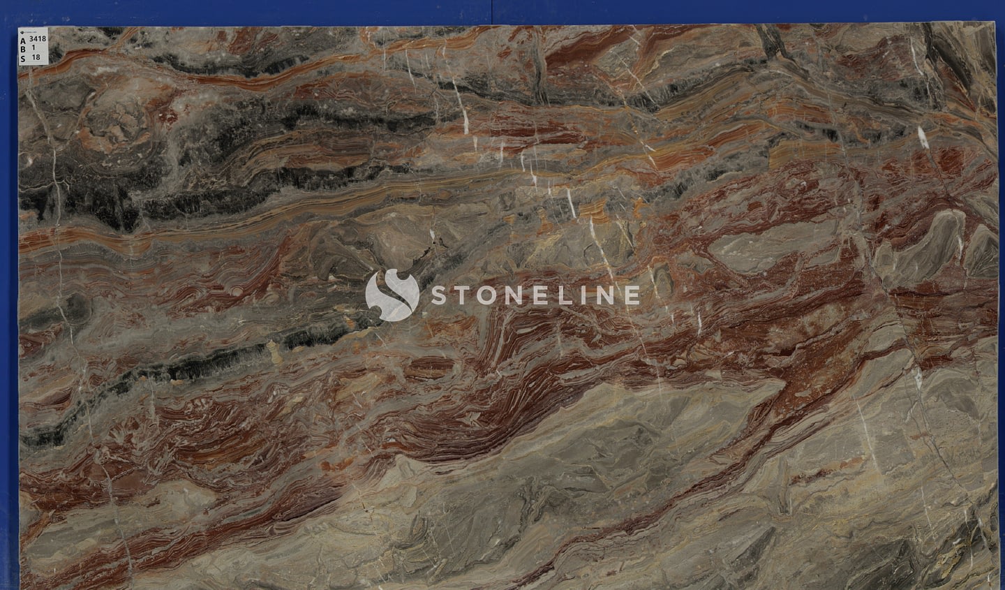 CARAMEL GREY BRESCIA ROSSO marble features a harmonious blend of beige, gray, and red tones with unique veining patterns that vary on each slab, creating a distinct natural aesthetic.