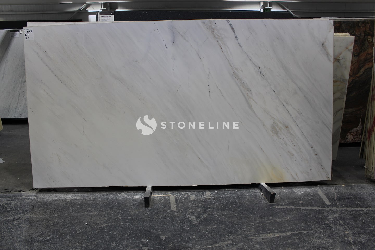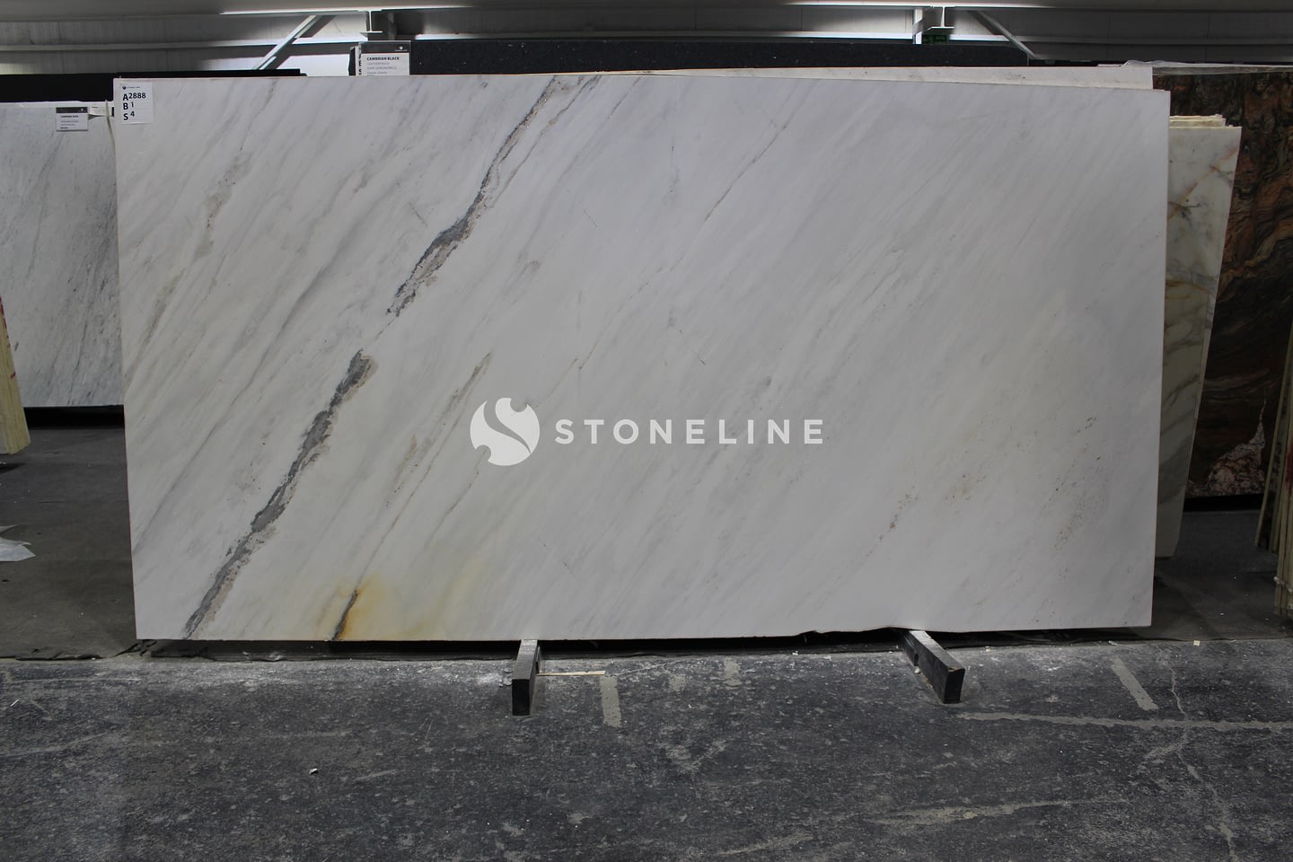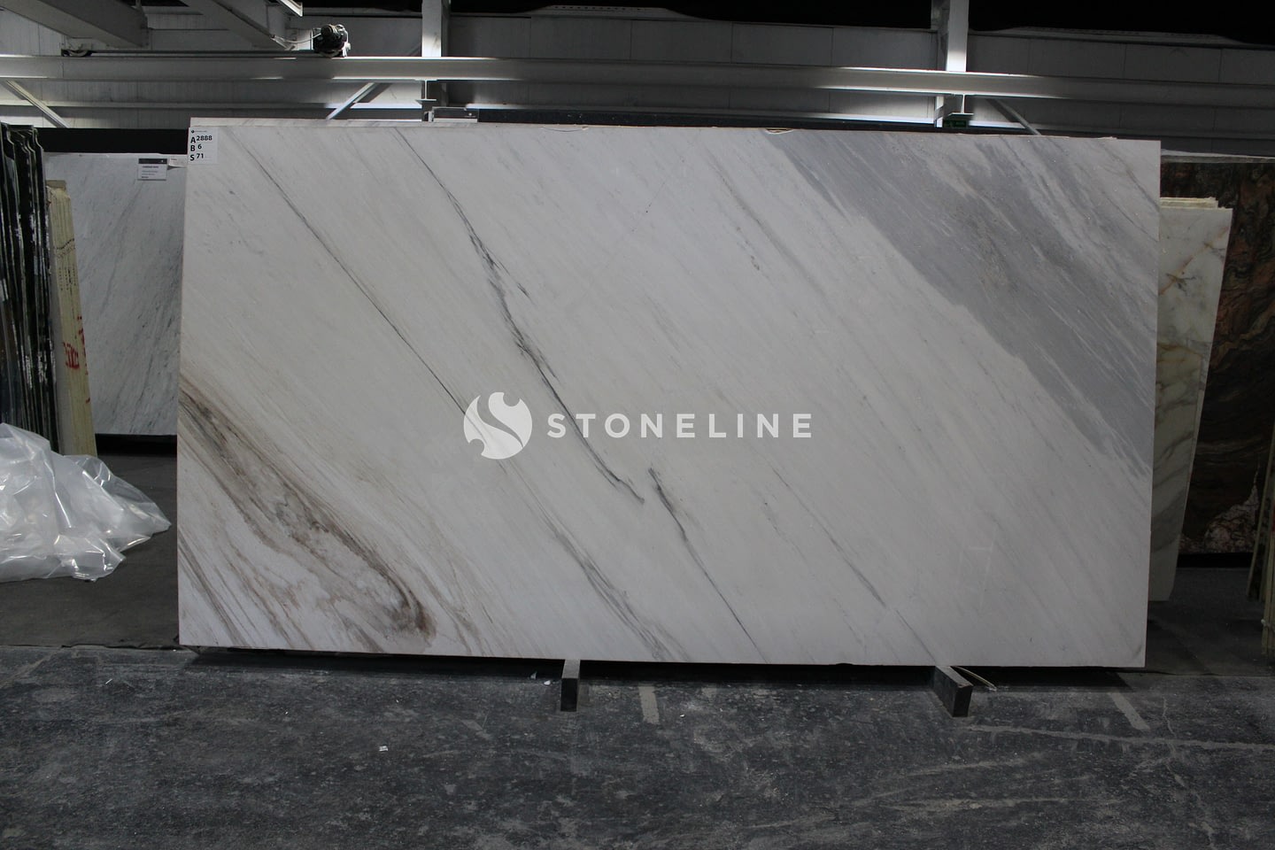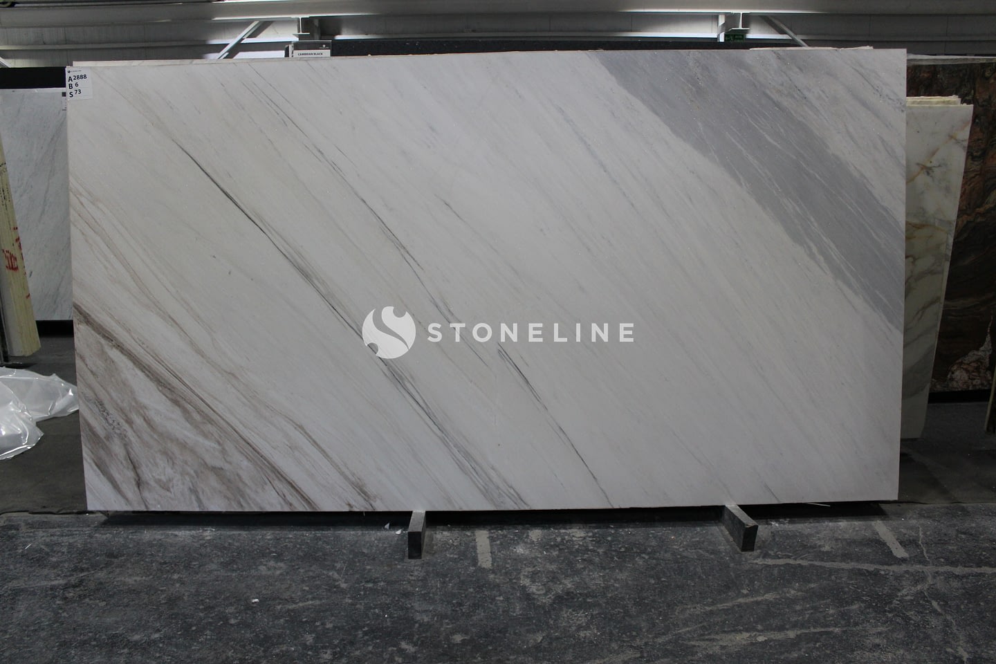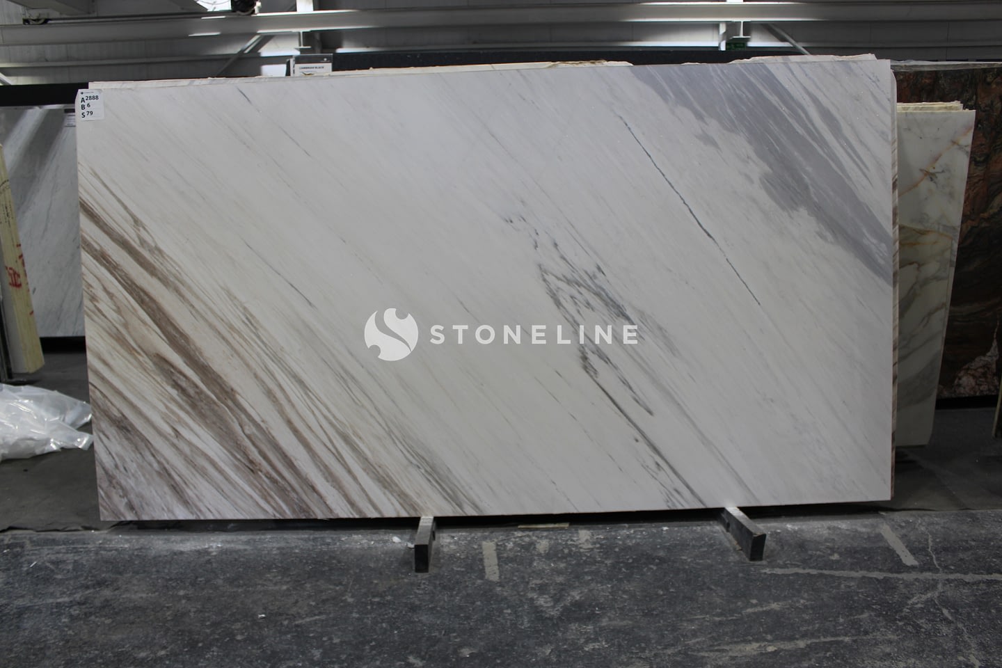 This marble features a dense color composition with diagonal veining and subtle gray touches, providing moderate translucency. It can be used for decorative backlit panels but is not highly translucent.
