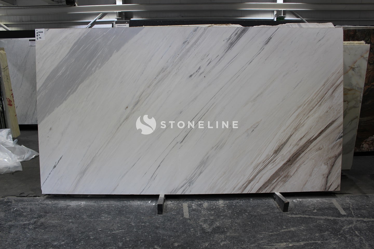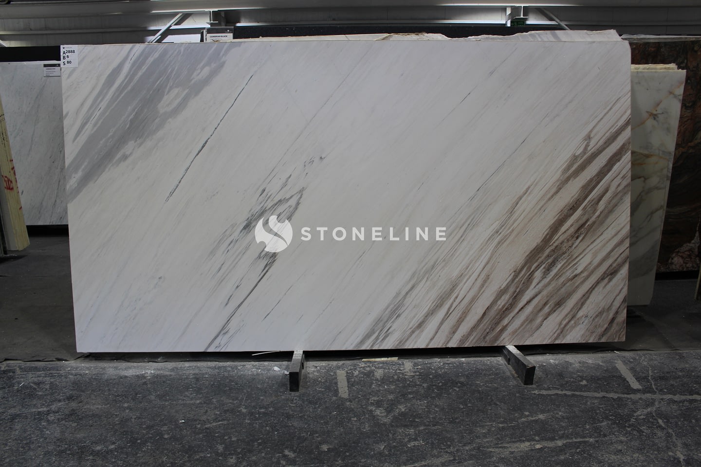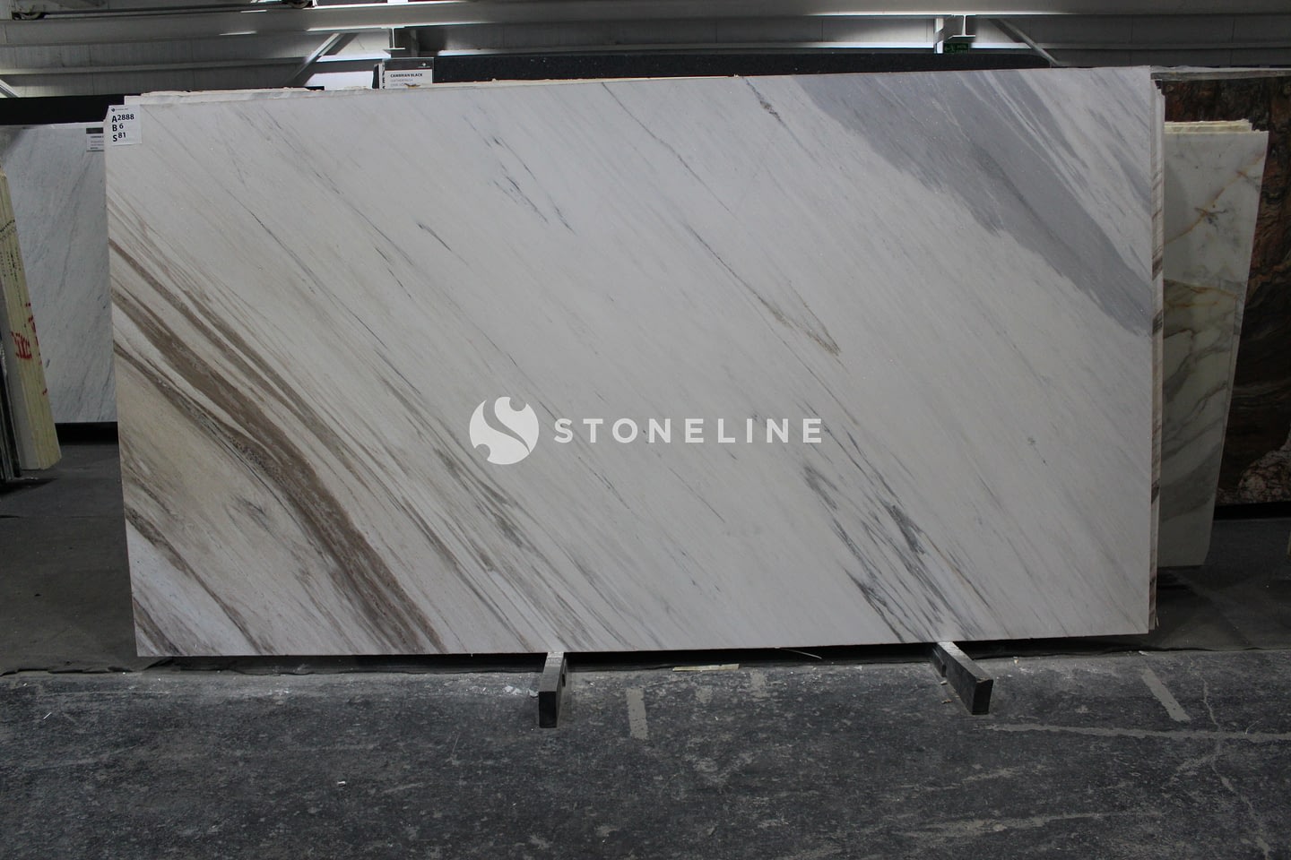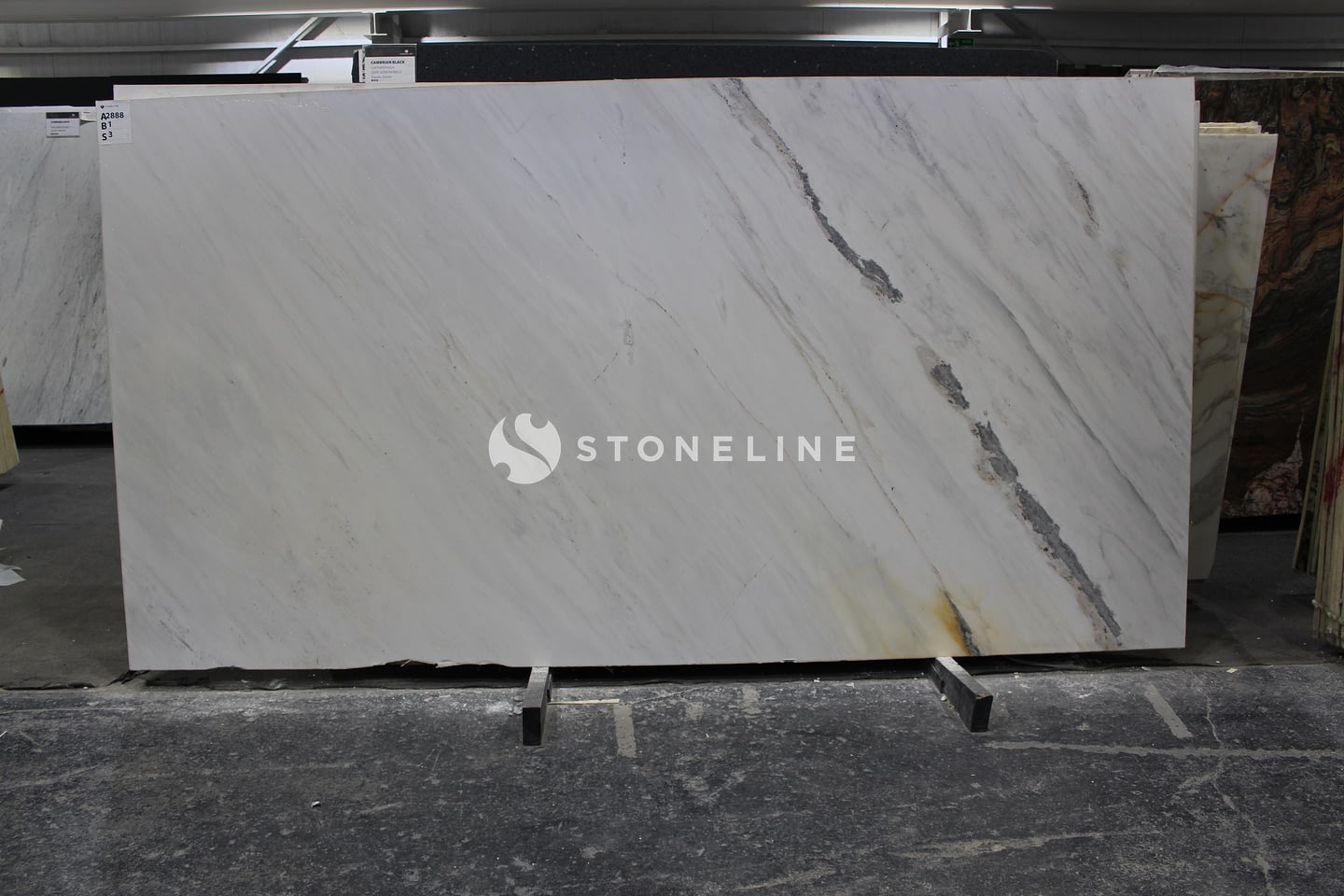 This marble features a dense color composition with diagonal veining and subtle gray touches, providing moderate translucency. It can be used for decorative backlit panels but is not highly translucent.