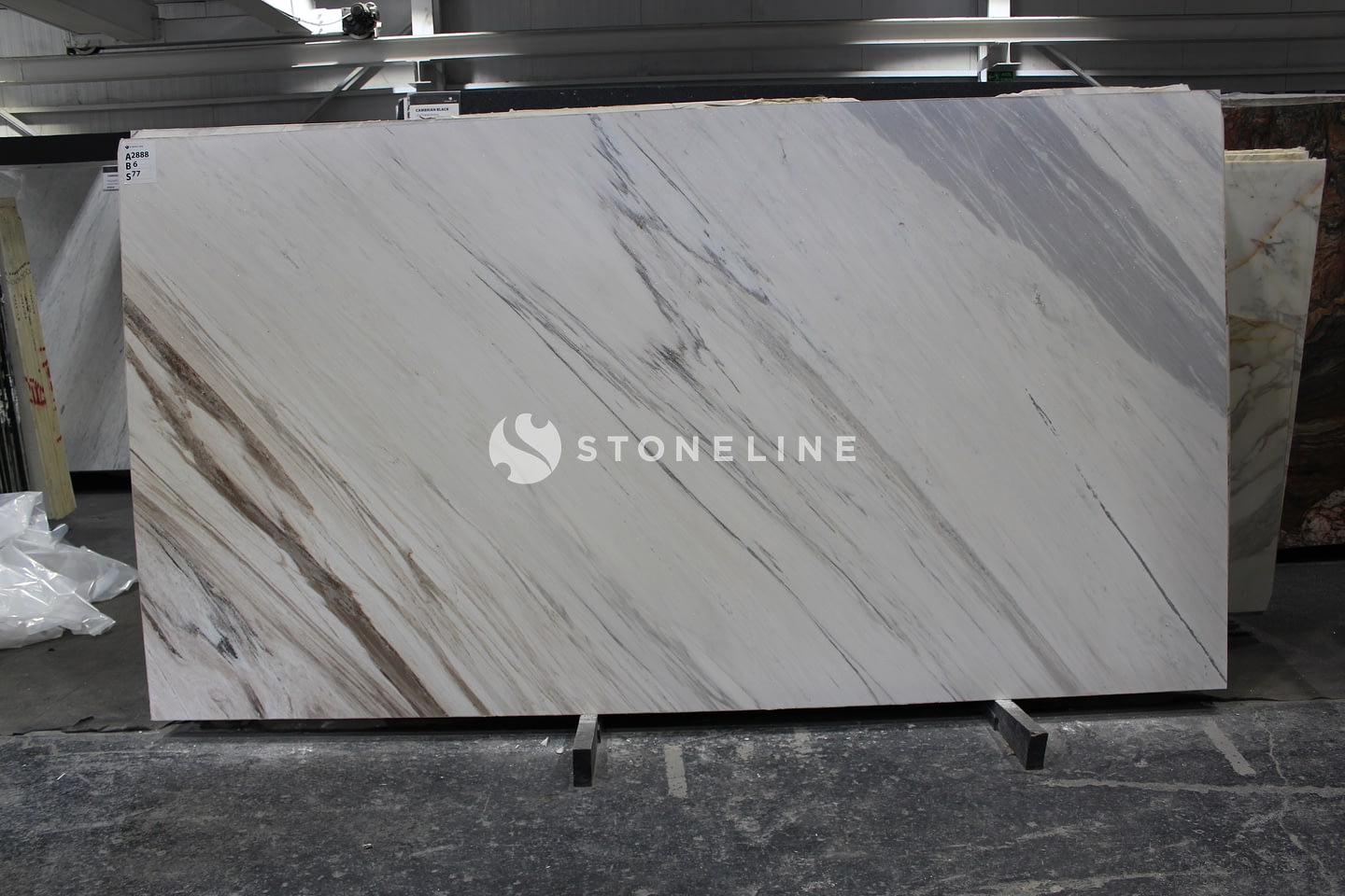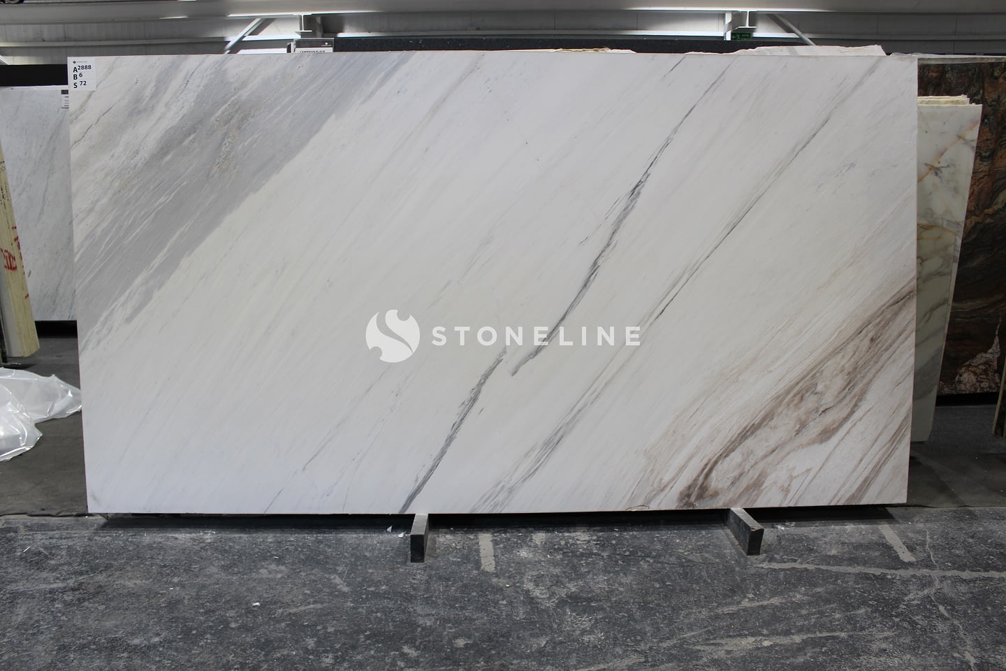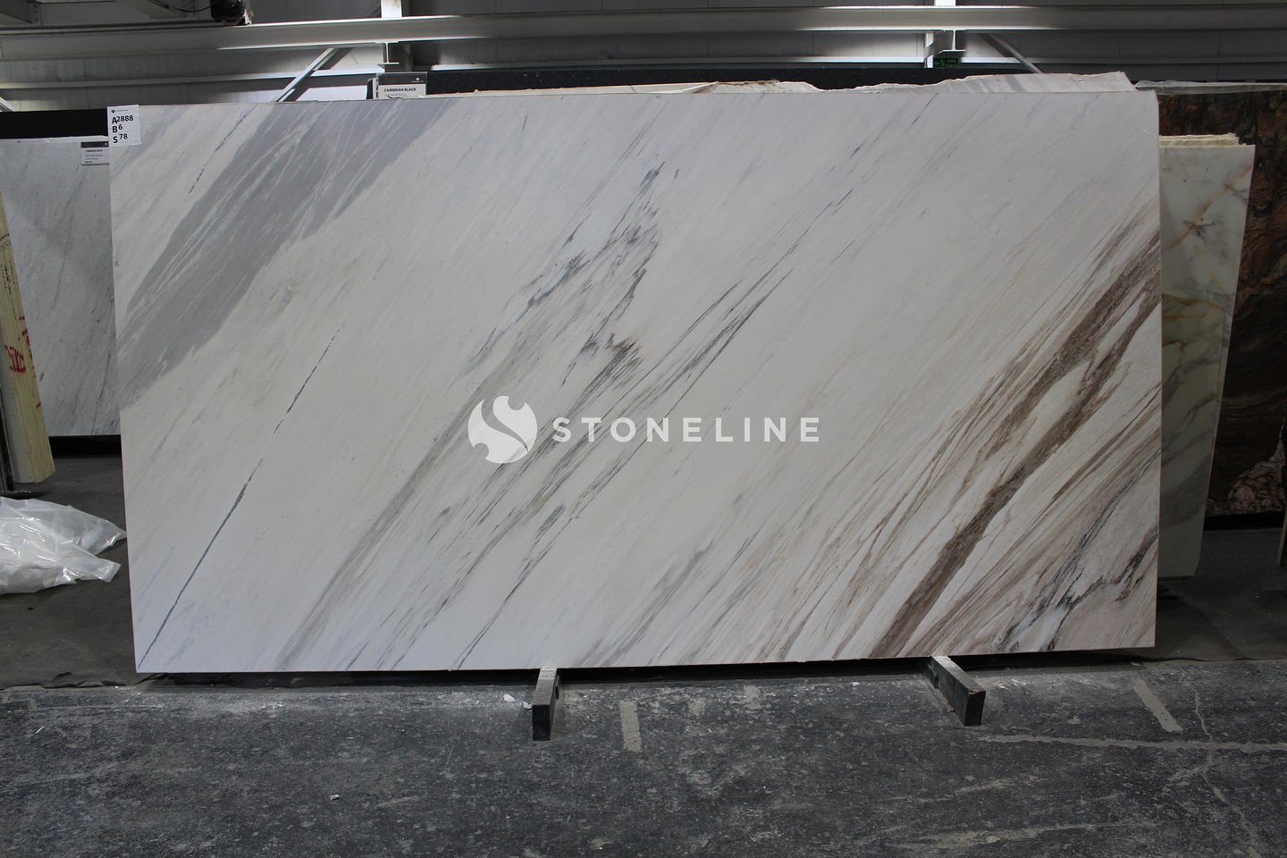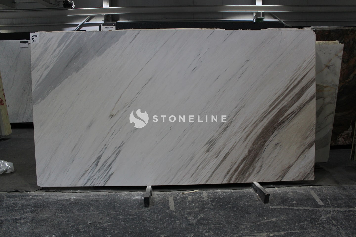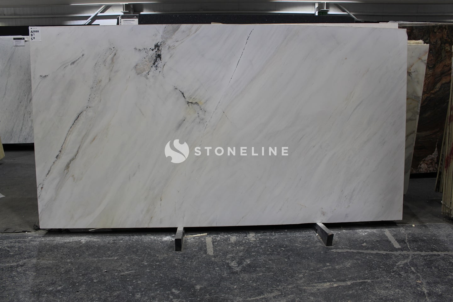 This marble features a dense color composition with diagonal veining and subtle gray touches, providing moderate translucency. It can be used for decorative backlit panels but is not highly translucent.