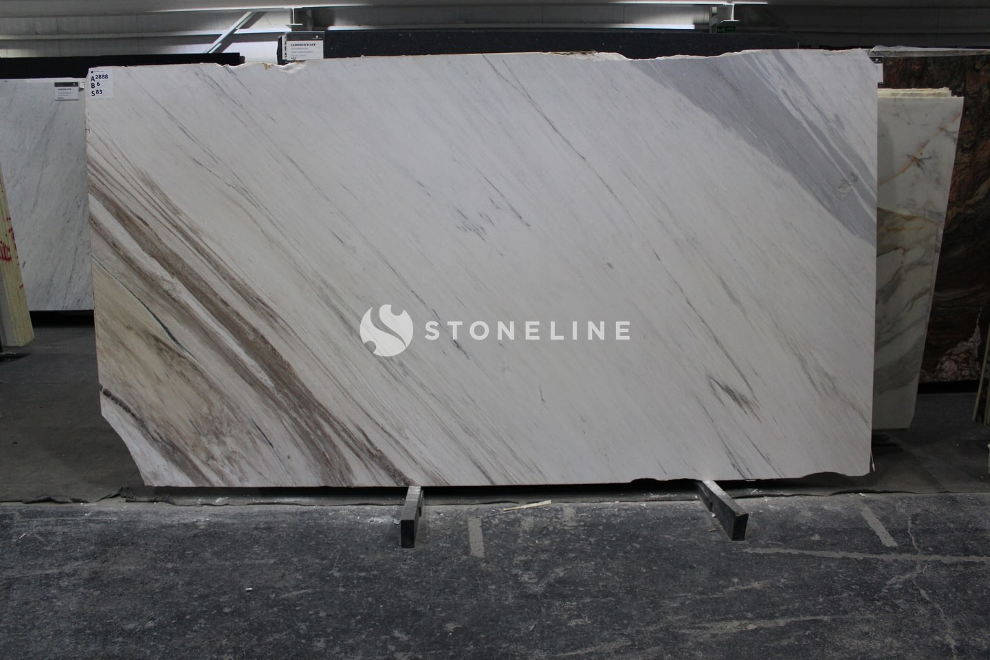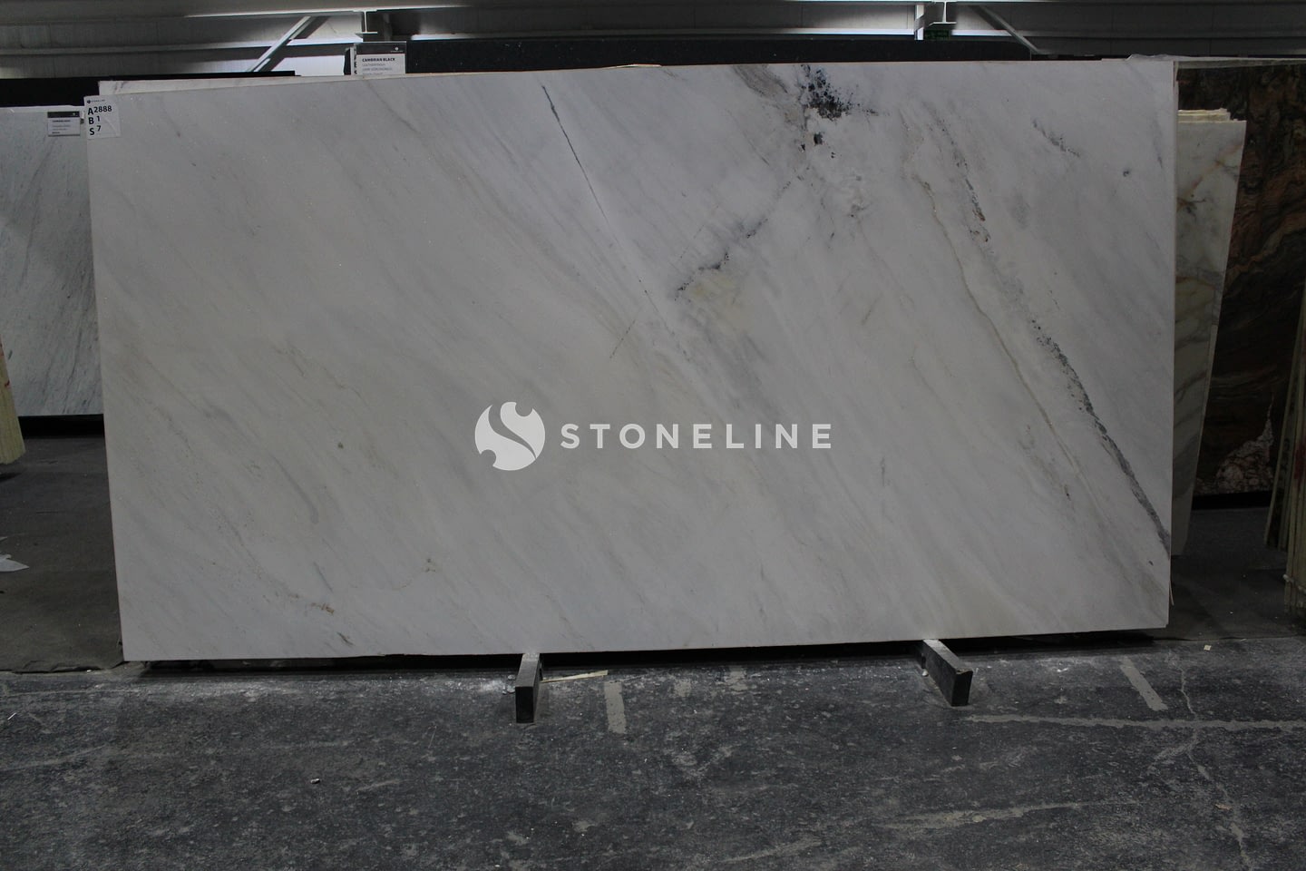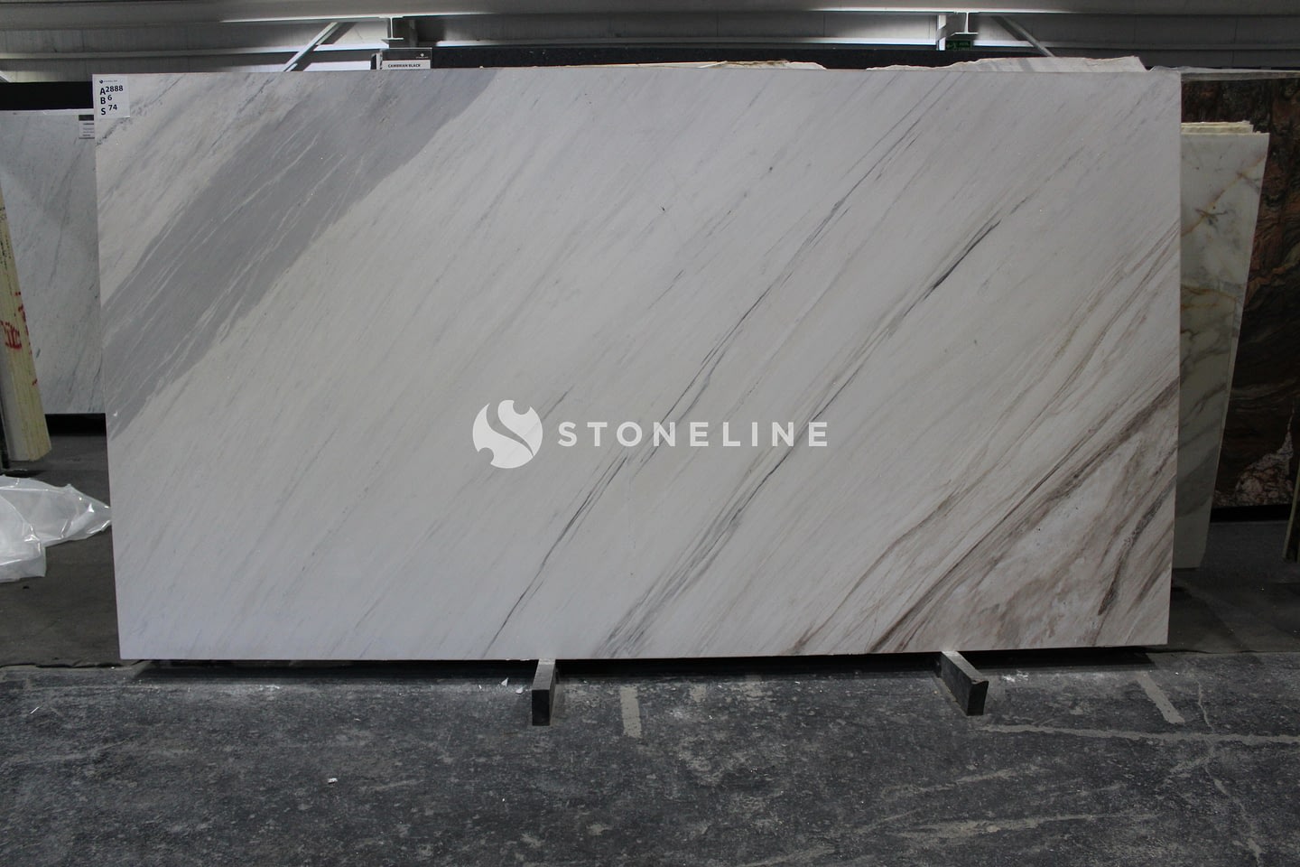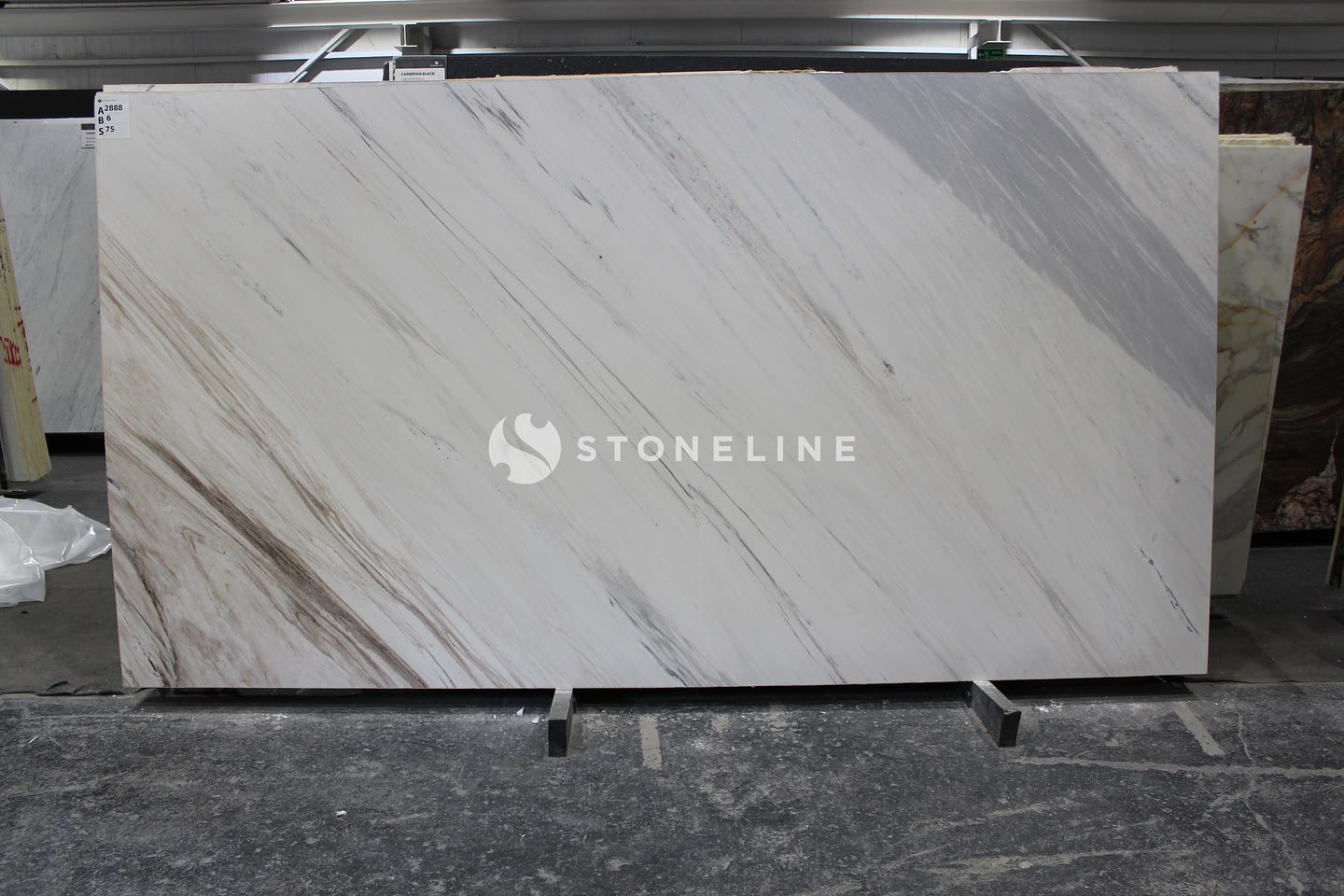 This marble features a dense color composition with diagonal veining and subtle gray touches, providing moderate translucency. It can be used for decorative backlit panels but is not highly translucent.