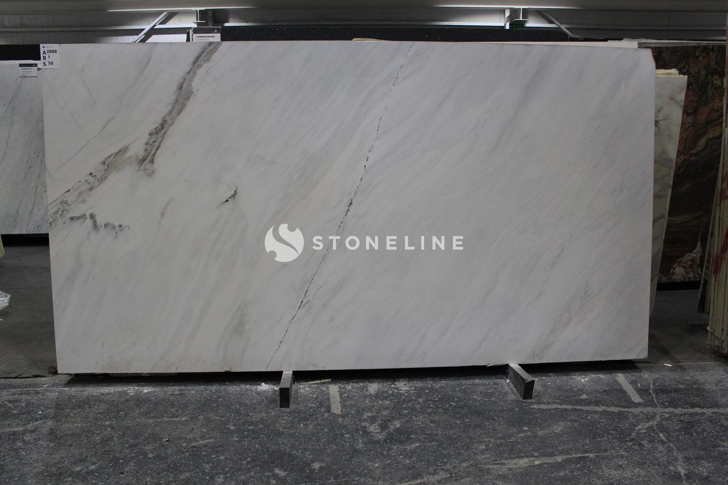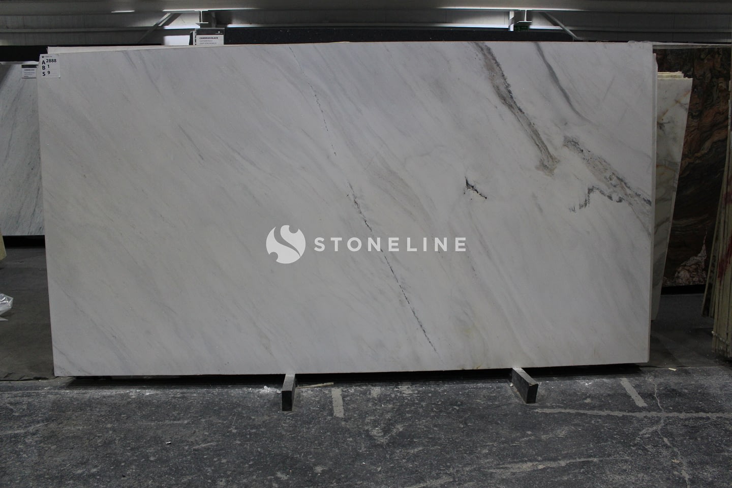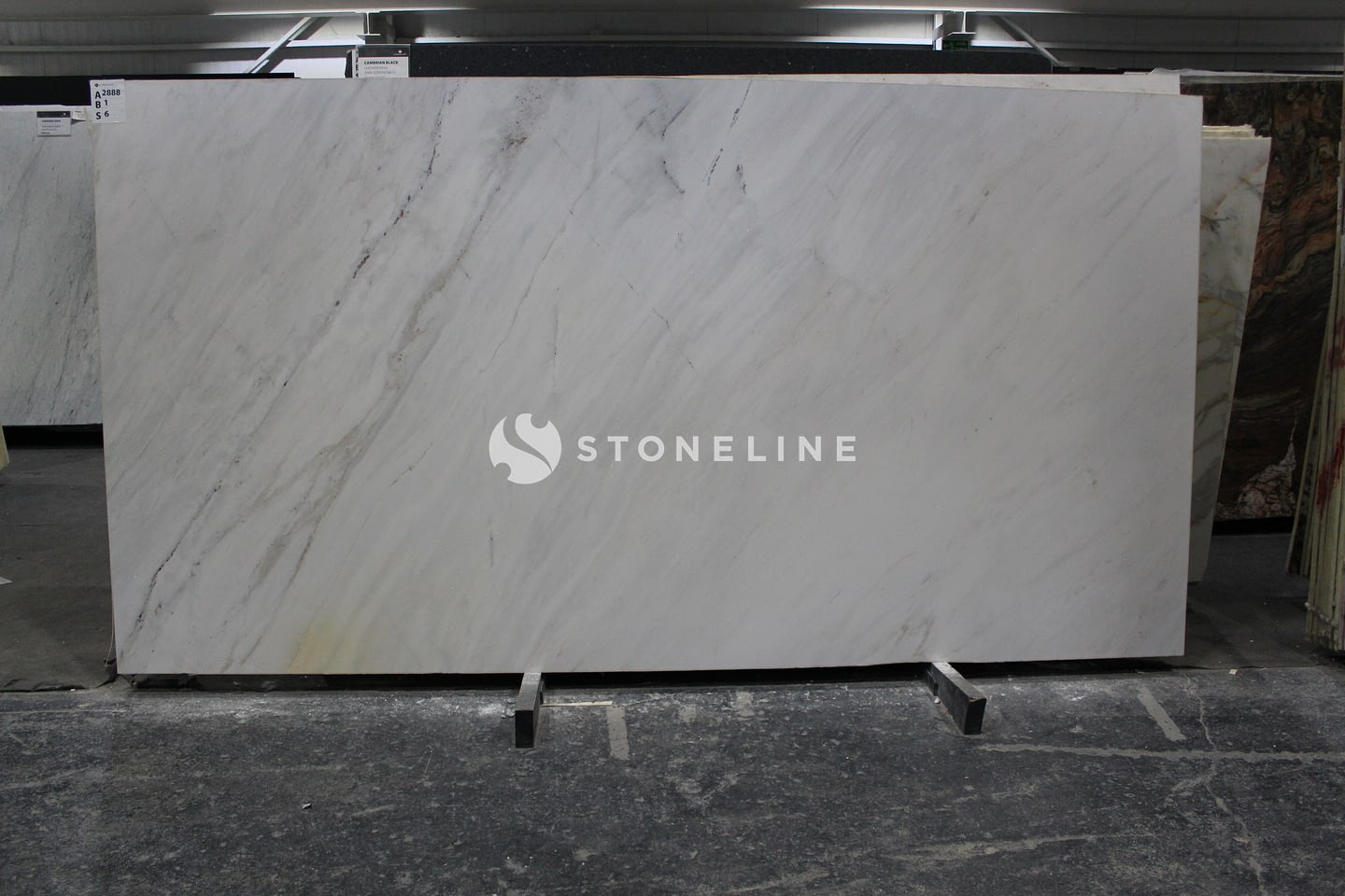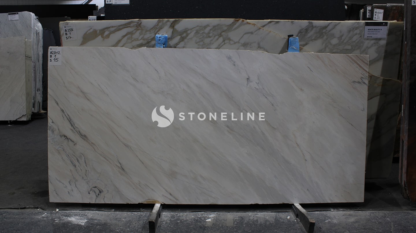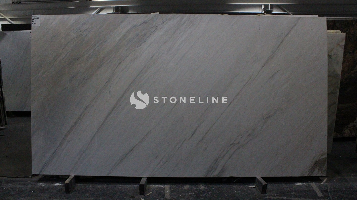 This marble features a dense color composition with diagonal veining and subtle gray touches, providing moderate translucency. It can be used for decorative backlit panels but is not highly translucent.