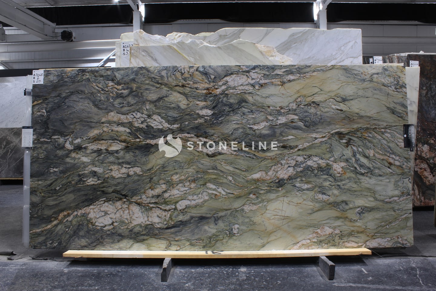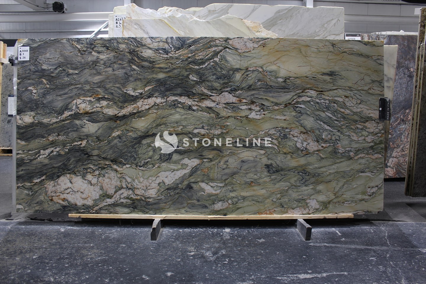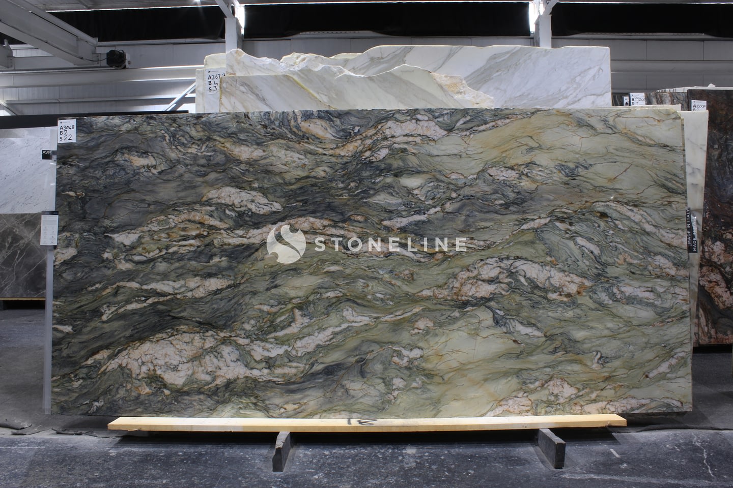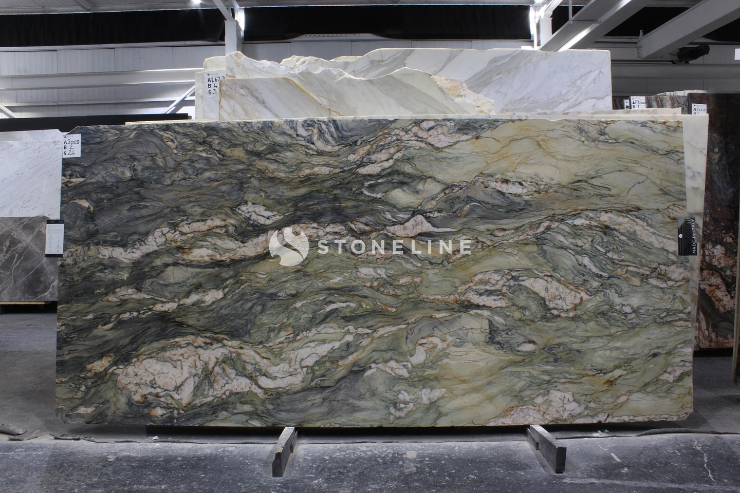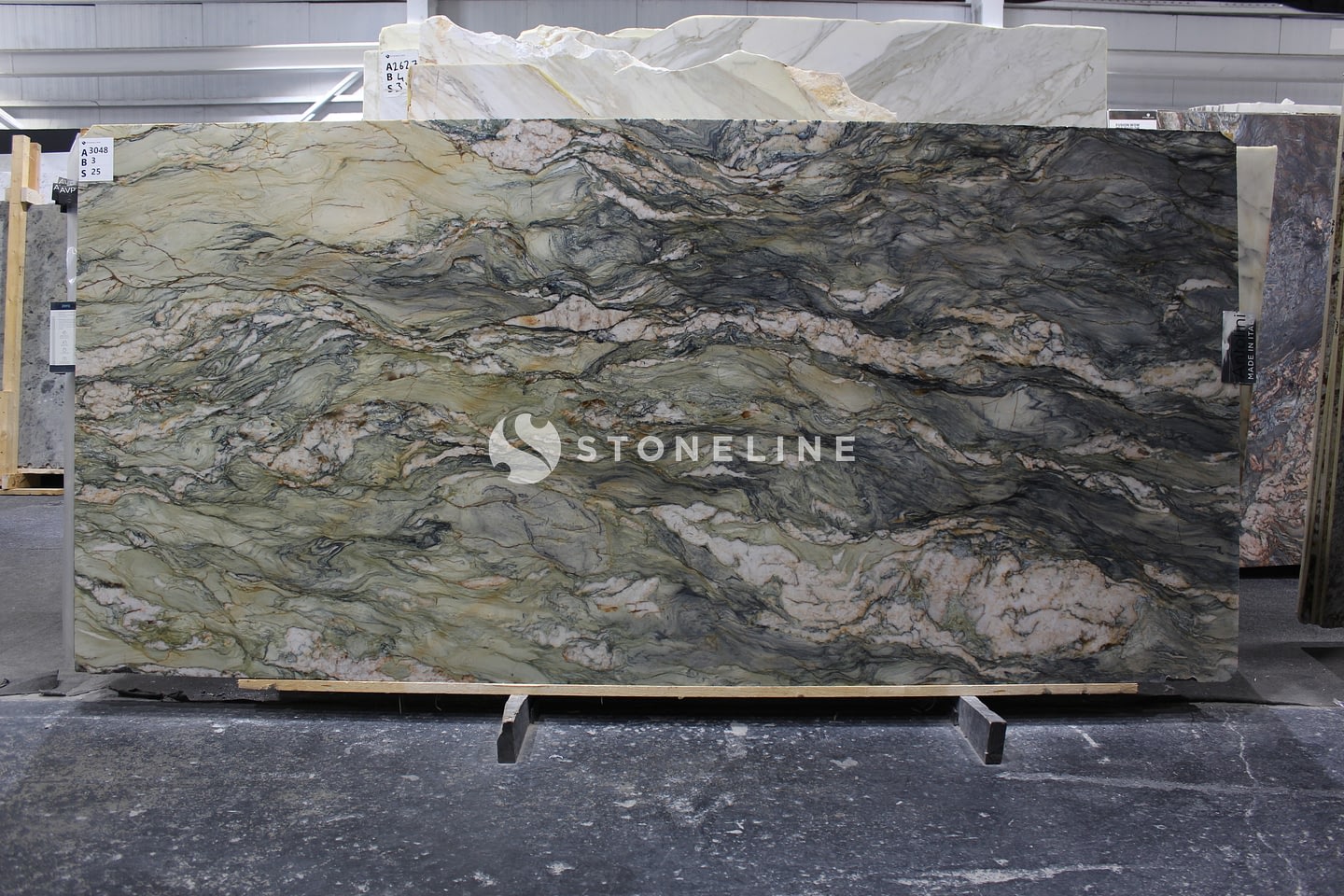 Each FUSION WOW slab features unique green shades and wavy vein textures, providing natural variation that adds depth and character to any interior design.