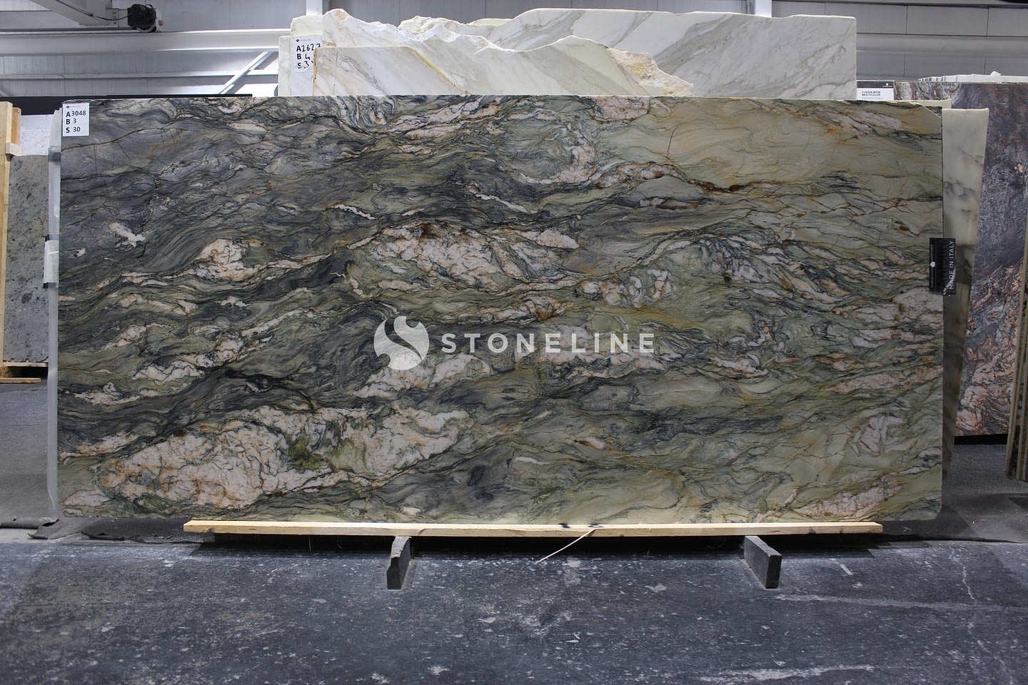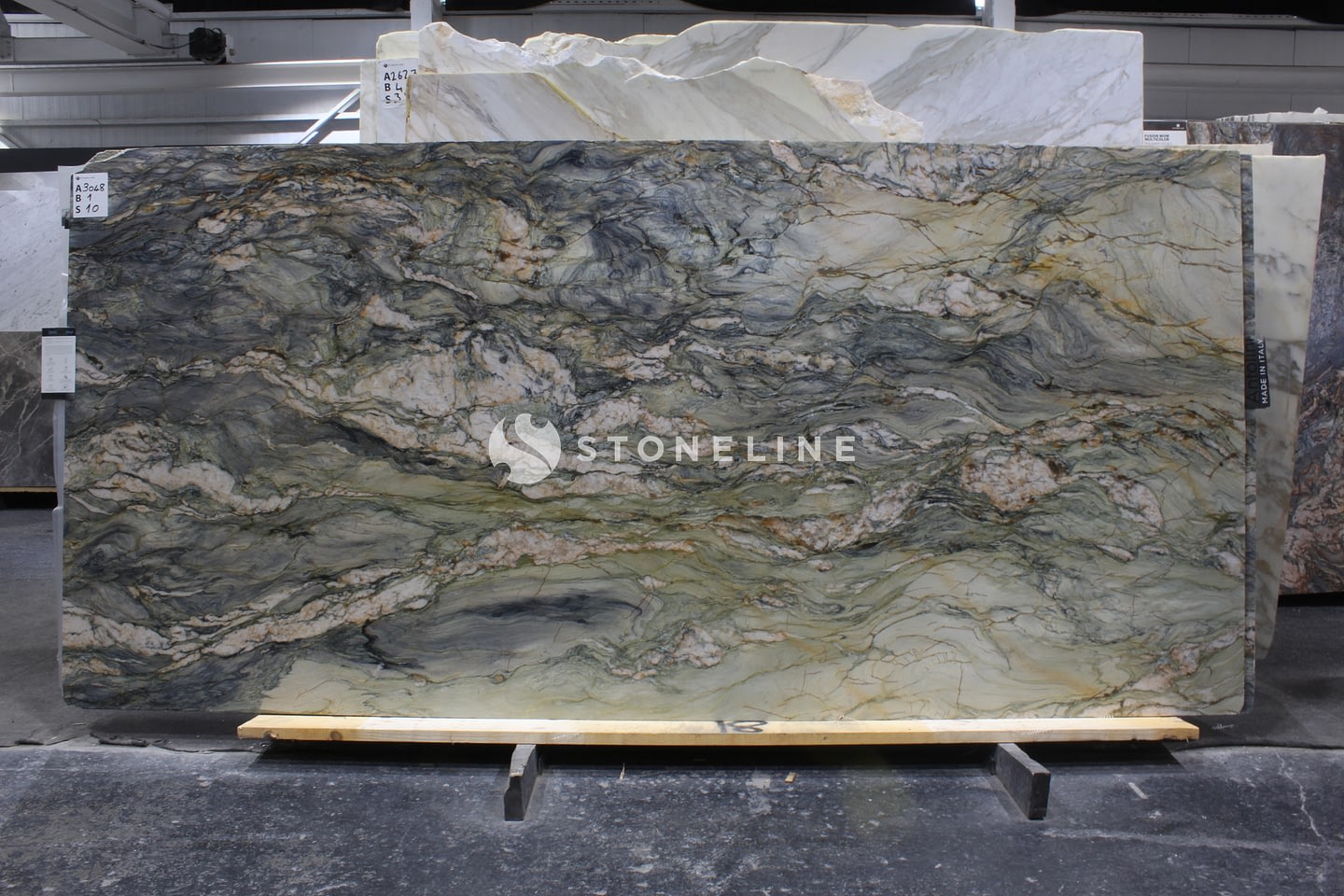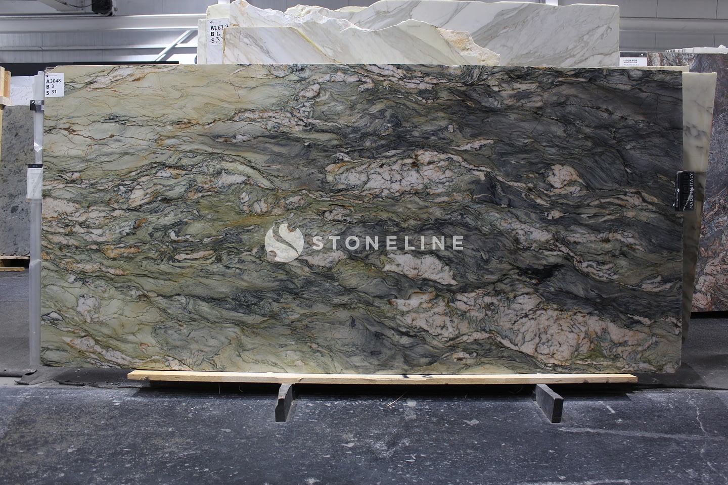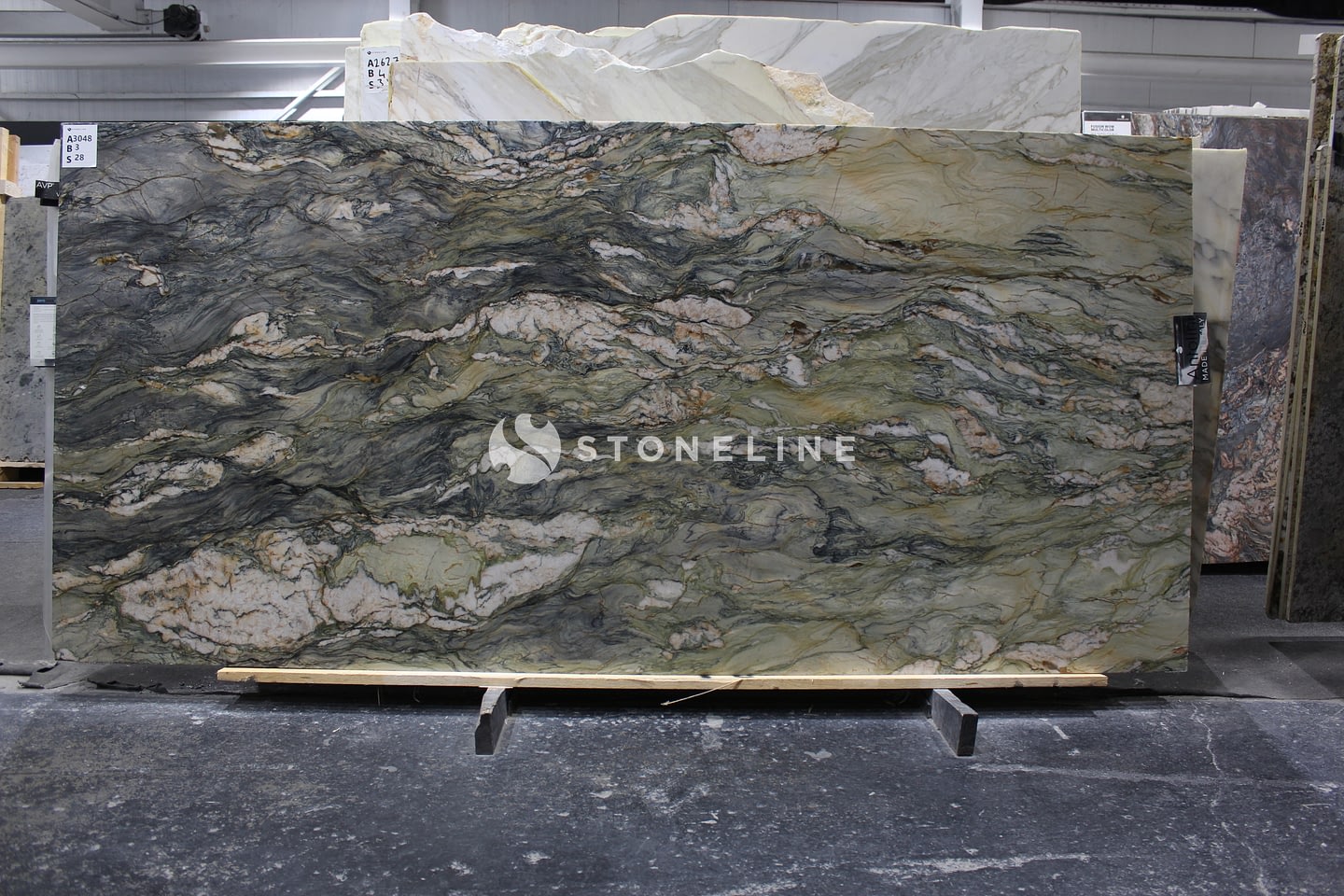 Each FUSION WOW slab features unique green shades and wavy vein textures, providing natural variation that adds depth and character to any interior design.