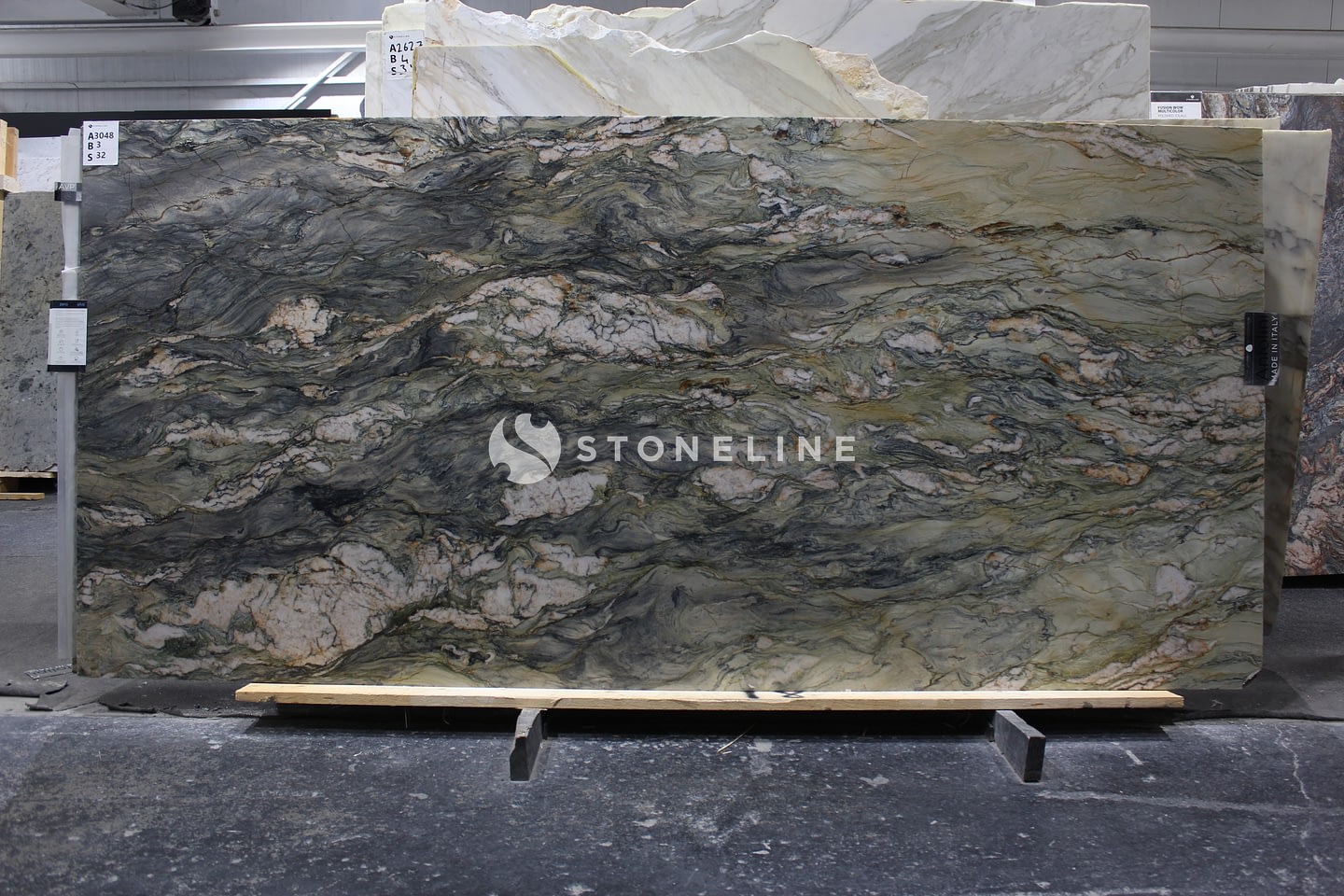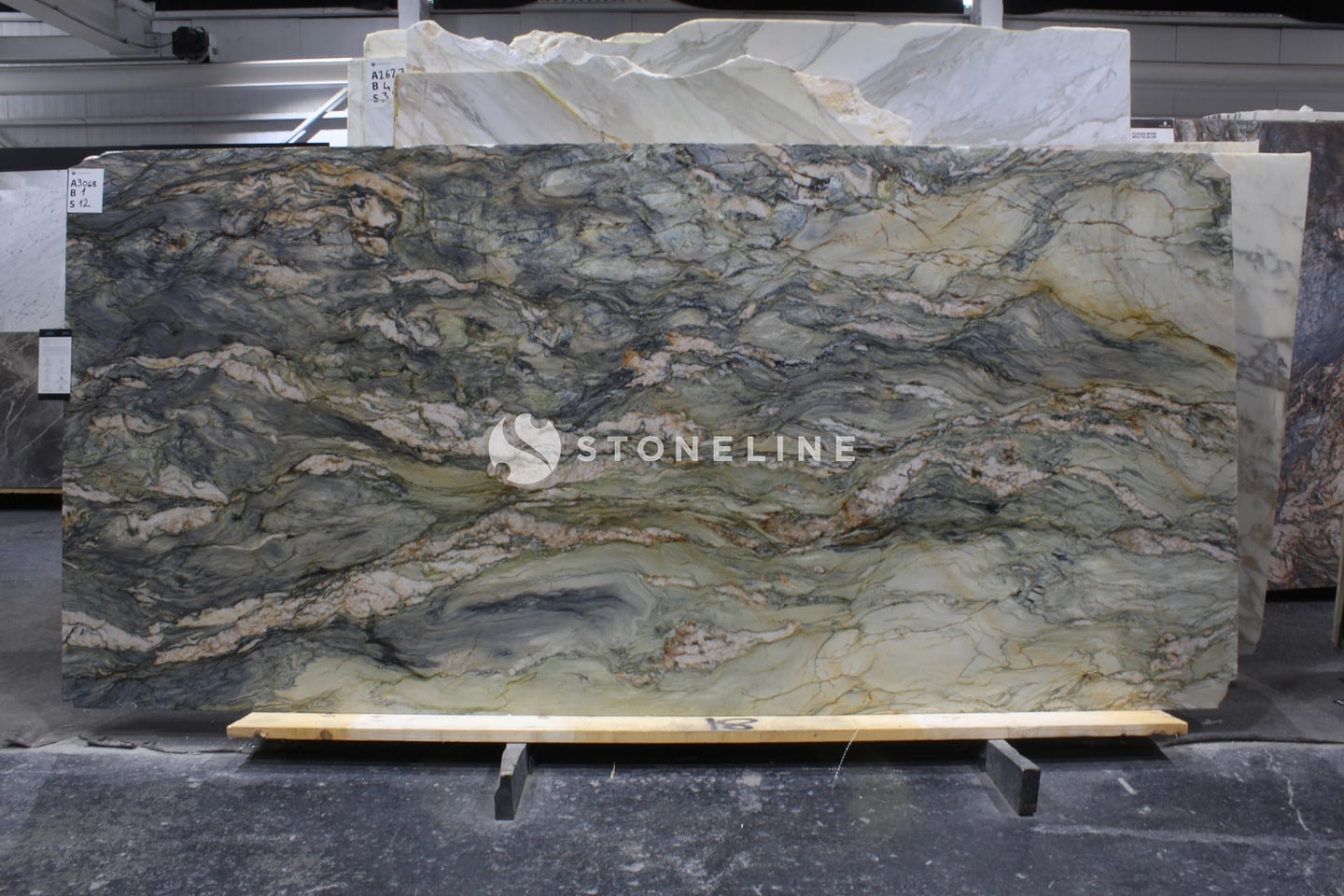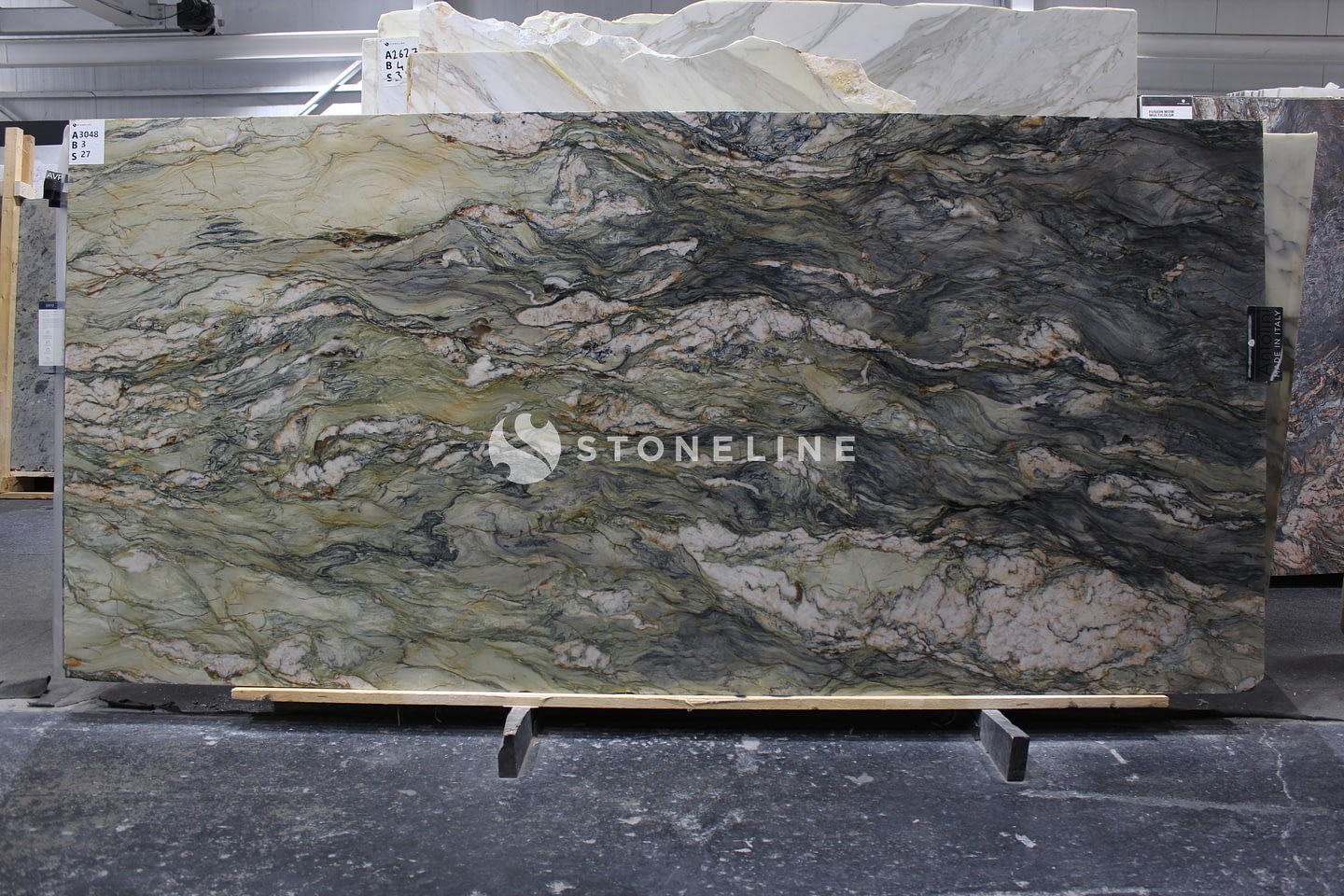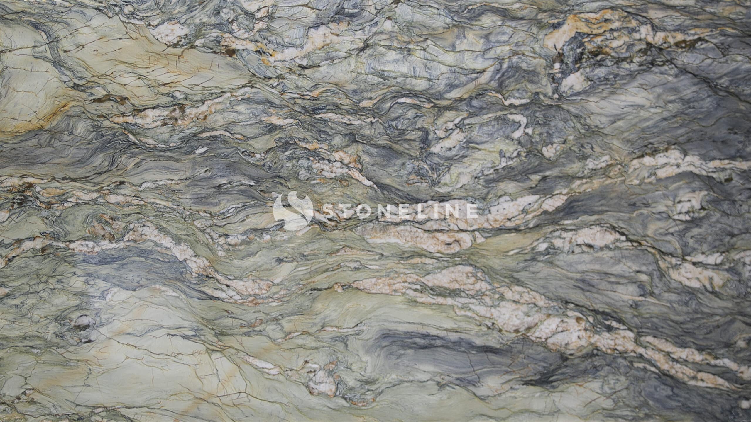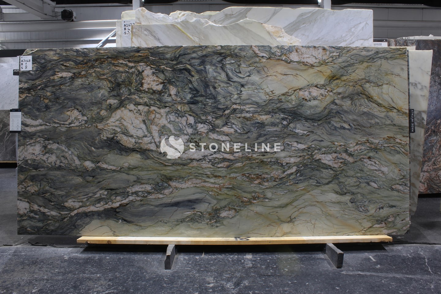 Each FUSION WOW slab features unique green shades and wavy vein textures, providing natural variation that adds depth and character to any interior design.