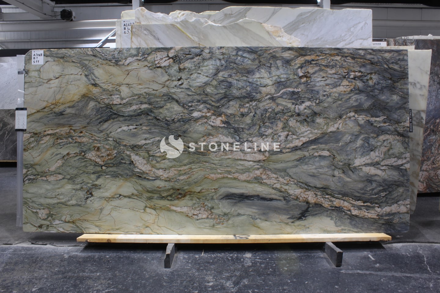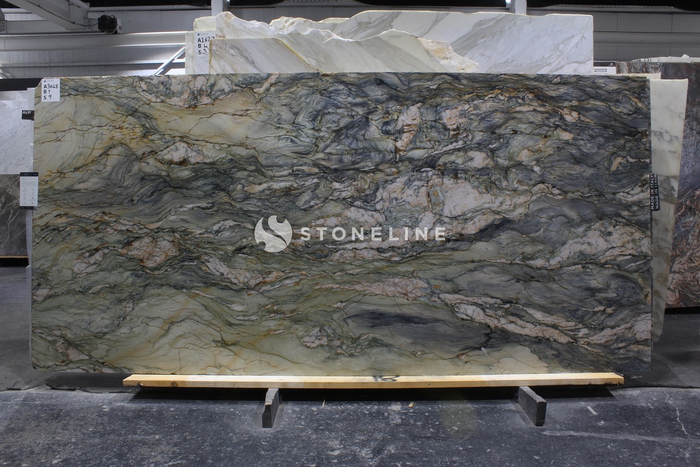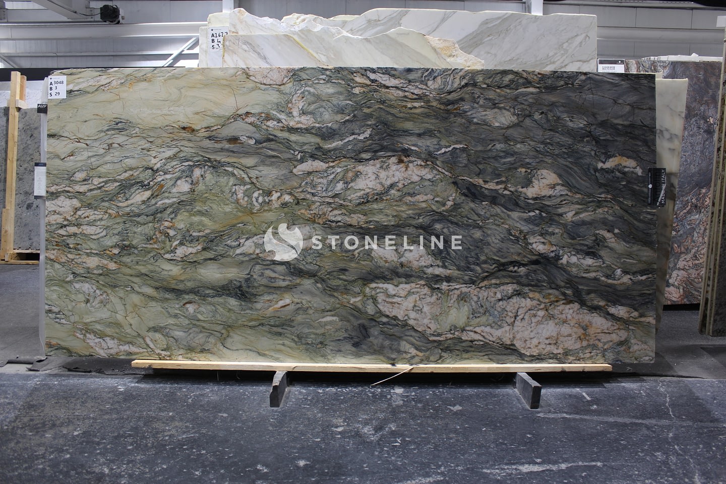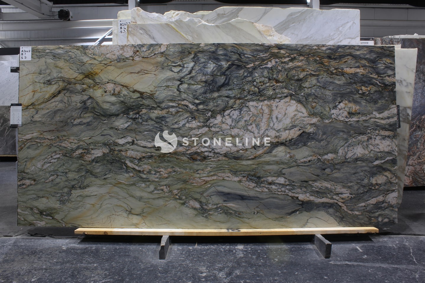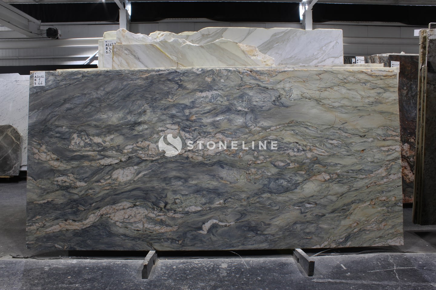 This quartzite slab comes in two thickness options: 1.3 cm and 2 cm, suitable for a variety of applications.