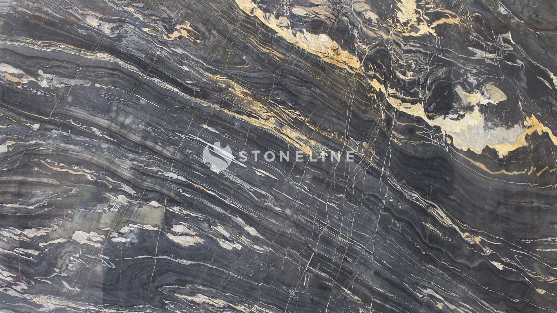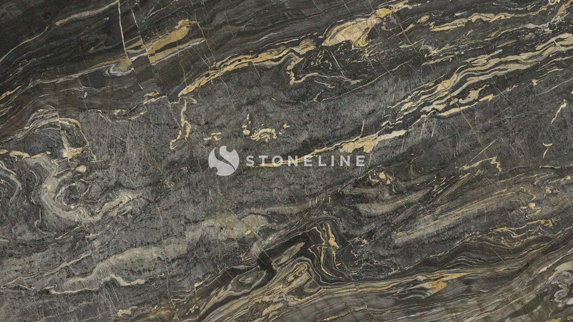 NERO GALI features a warm yellow color with intricate patterns created by the reverse cutting process, giving each slab a unique, artistic appearance.