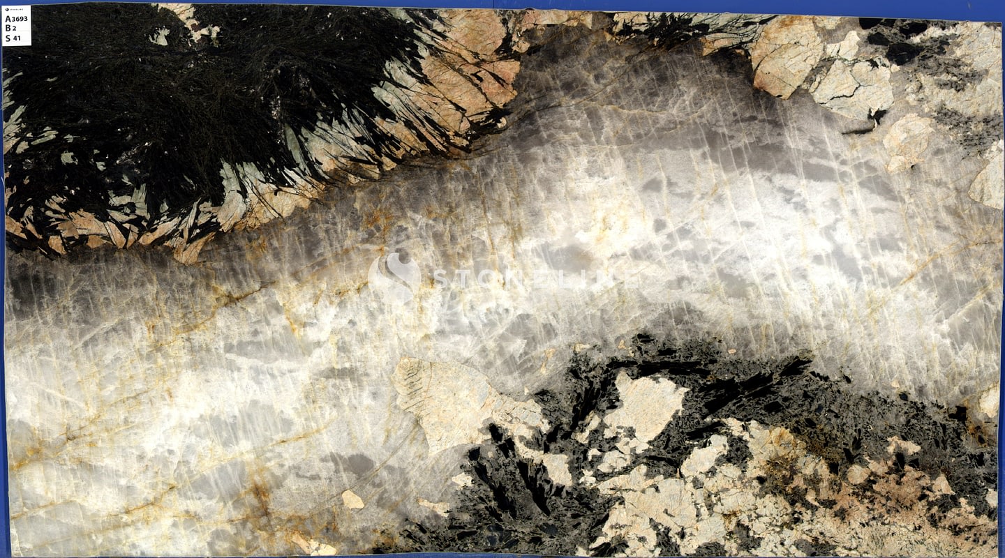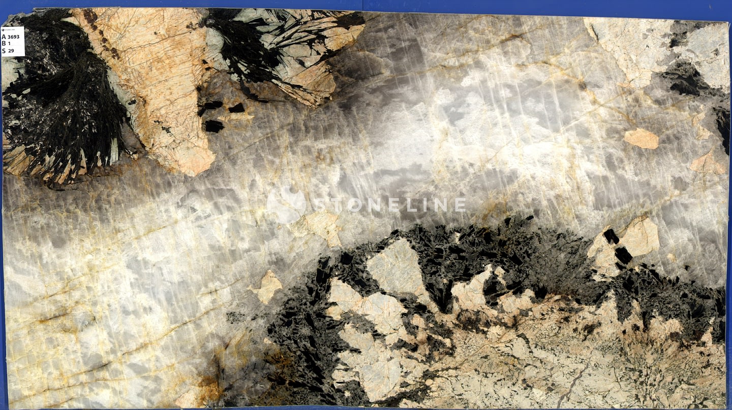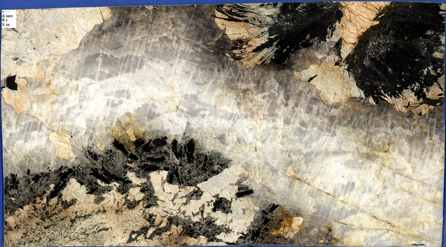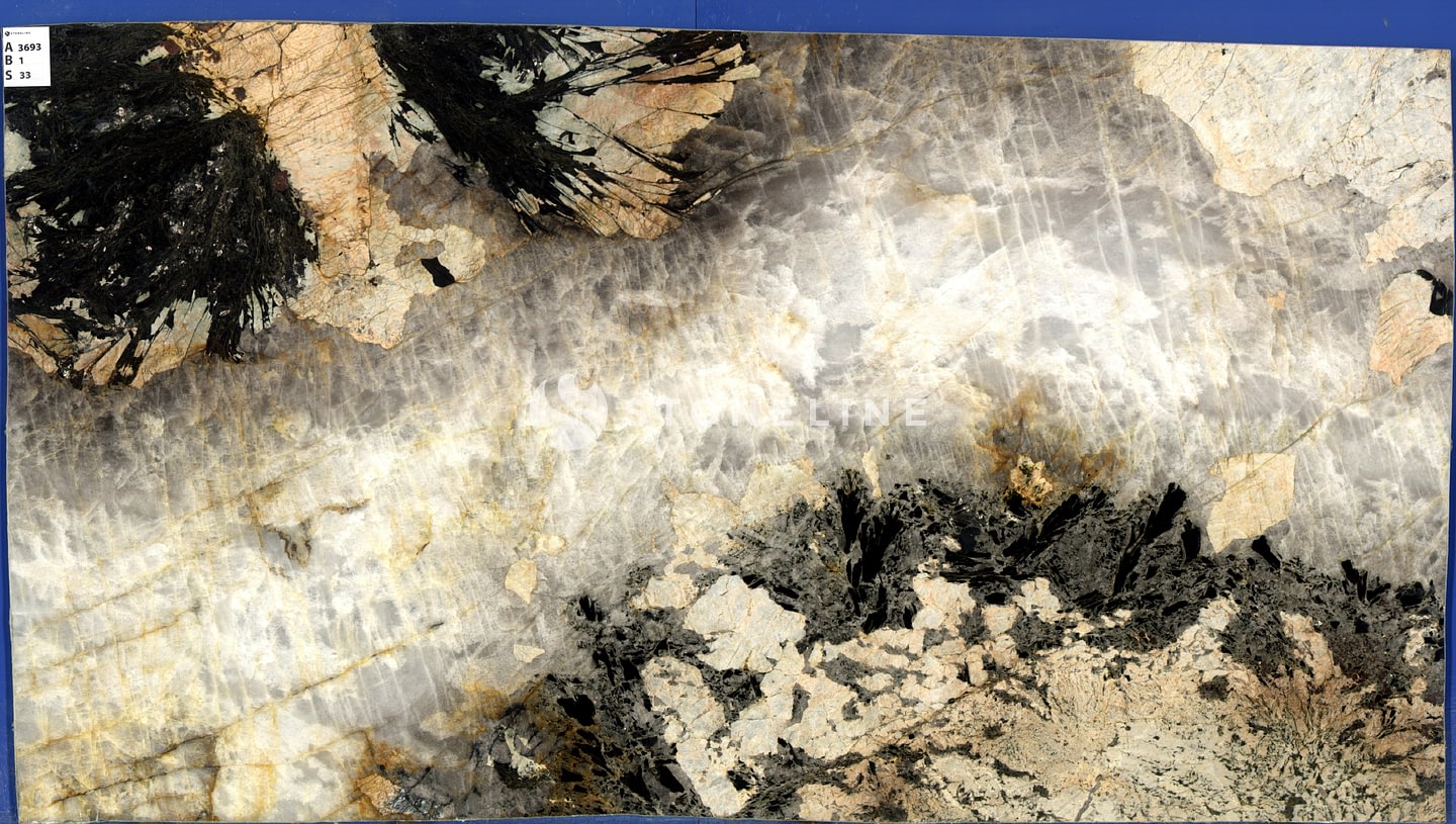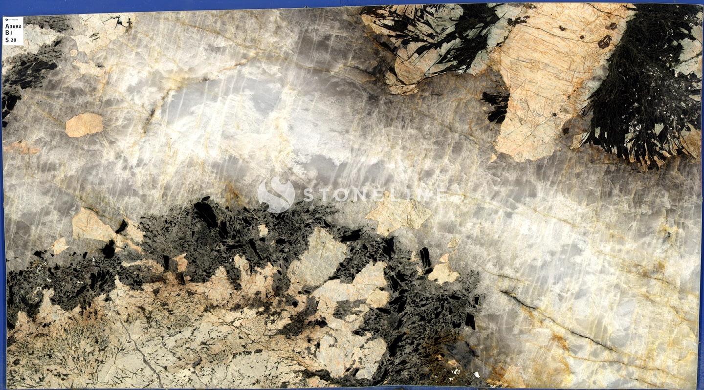 Patagonia Tourmaline Quartzite is one of nature’s most dramatic and artistic stone formations. Striking patches of icy white quartz intertwine with deep black tourmaline crystals and warm-toned mineral transitions, creating a sculptural, three-dimensional appearance. Every slab is truly one of a kind—its bold contrasts, crystal luminosity, and organic fracture patterns give it an unmistakable visual identity.