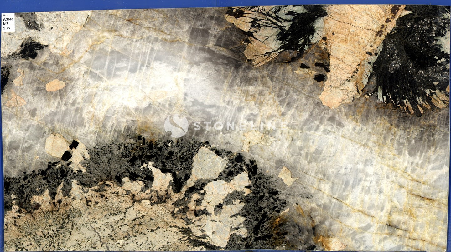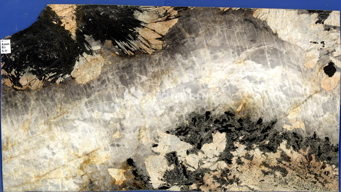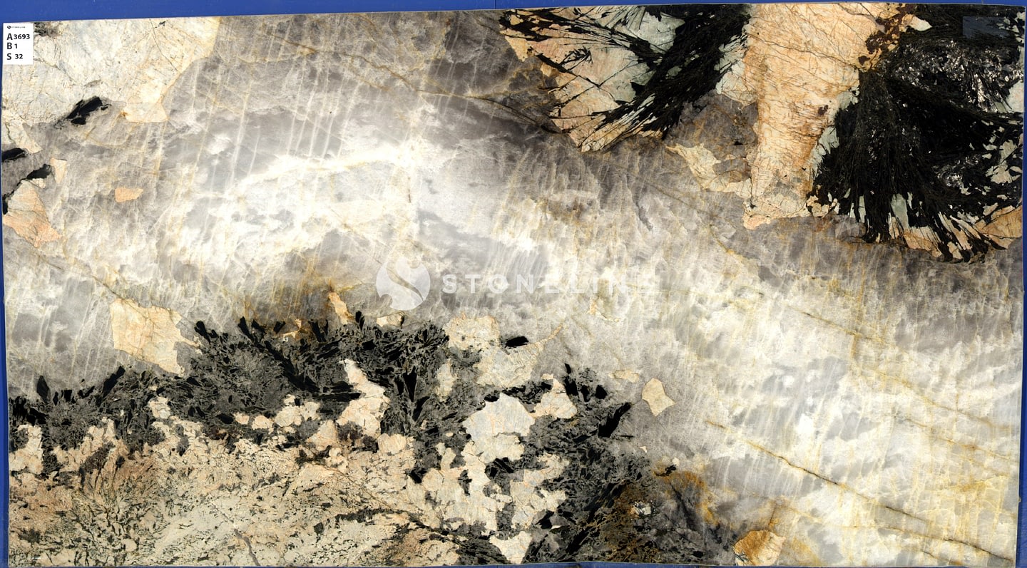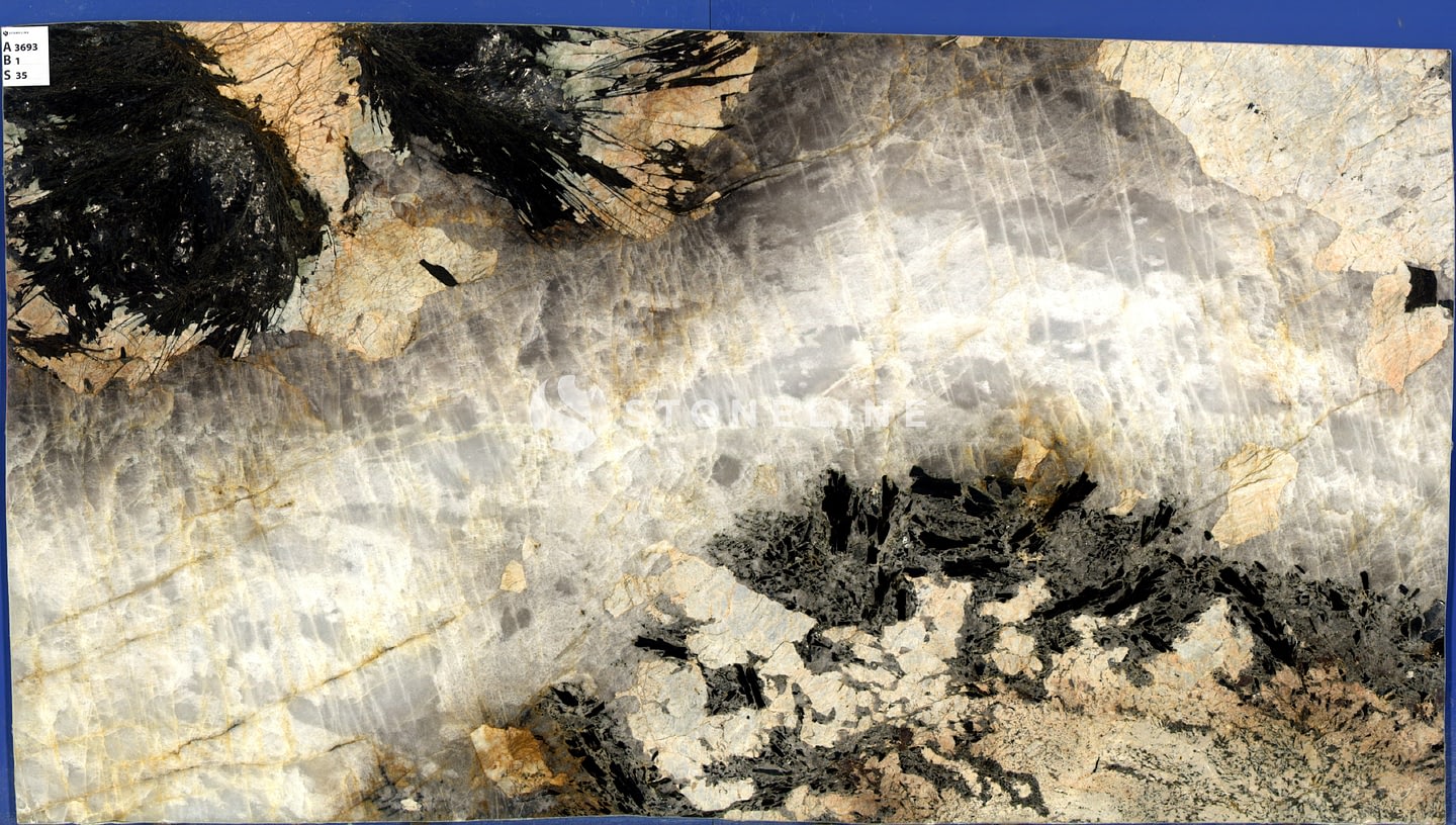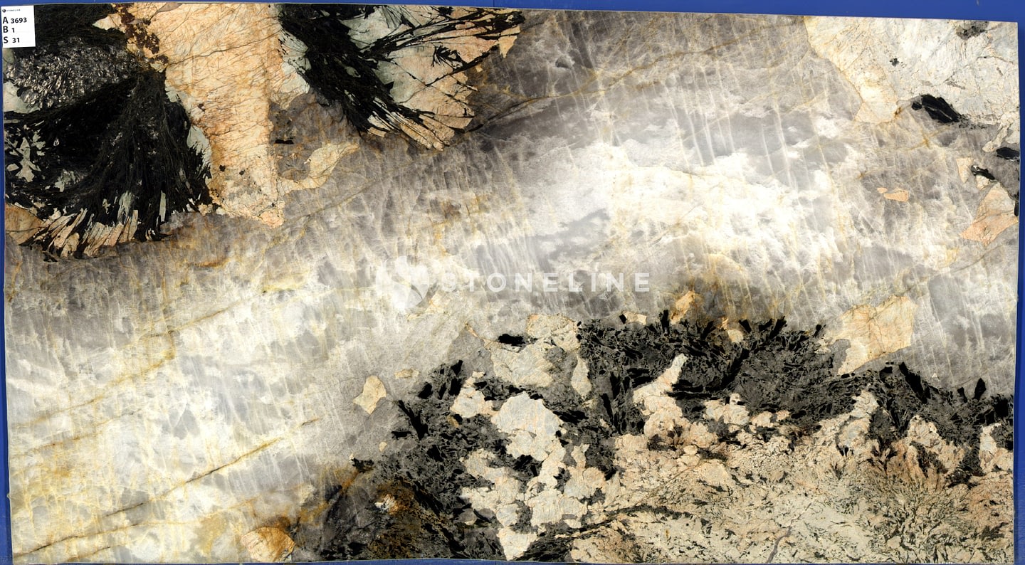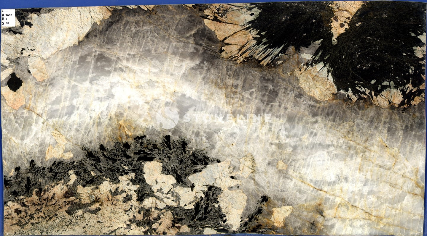 Patagonia Tourmaline Quartzite is one of nature’s most dramatic and artistic stone formations. Striking patches of icy white quartz intertwine with deep black tourmaline crystals and warm-toned mineral transitions, creating a sculptural, three-dimensional appearance. Every slab is truly one of a kind—its bold contrasts, crystal luminosity, and organic fracture patterns give it an unmistakable visual identity.