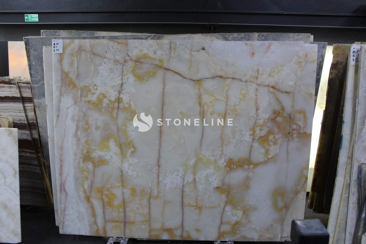 WHITE GOLDEN ONYX is ideal for indoor applications such as backlit wall panels, countertops, decorative feature walls, and accent pieces due to its polished surface and translucent properties.
