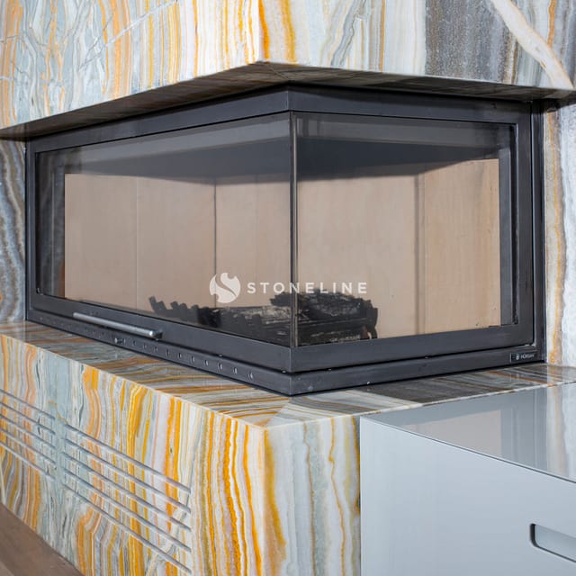 This fireplace was decorated with Starlicia Onyx to create a dazzling effect with its beauty and translucent form. You can also discover hundreds of stones from Stoneline’s natural stone selection for fireplace designs.