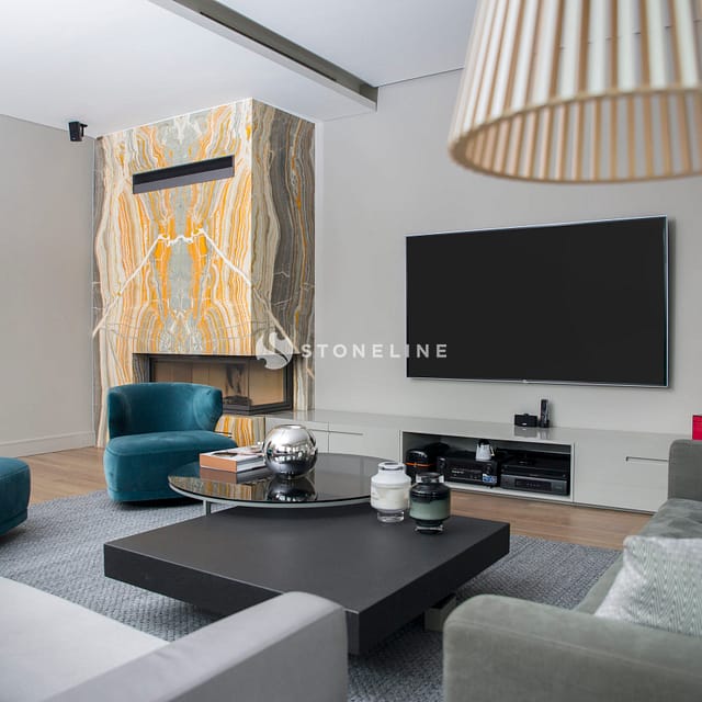 Designed by 36. Paralel Architecture, this fireplace was decorated with Starlicia Onyx to create a dazzling effect with its beauty and translucent form. You can also discover hundreds of stones from the natural stone selection of Stoneline for fireplace designs.