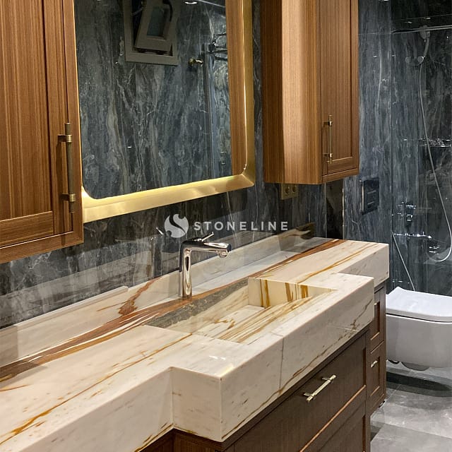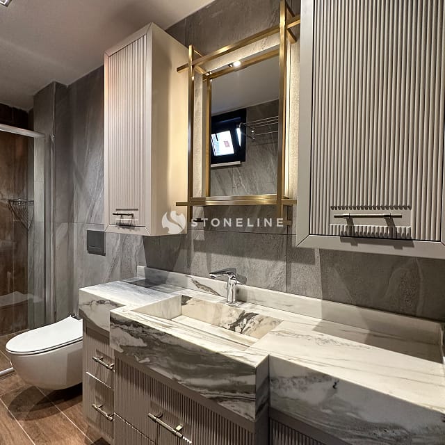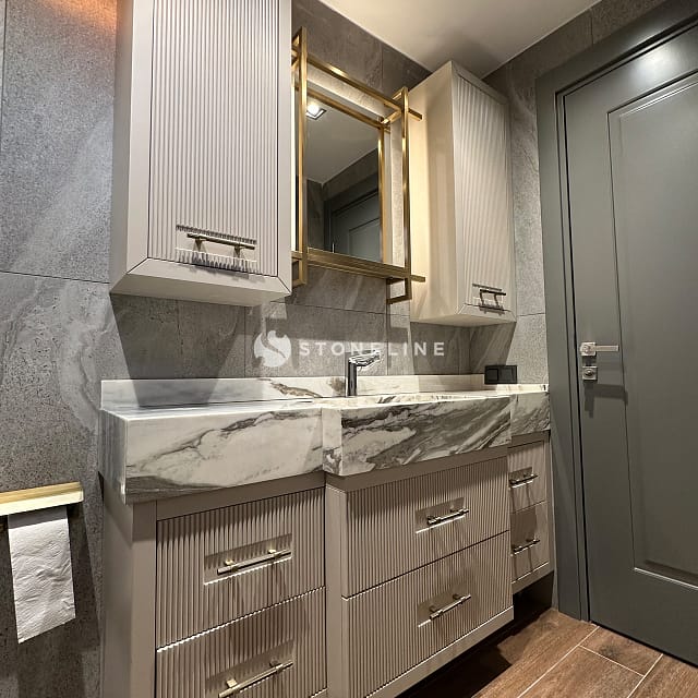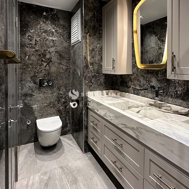 Stoneline natural stone collection brings together aesthetics and function, adding a unique atmosphere to your spaces. Stones such as Calacatta Nuvolato Azerobact, Bluette, Ocean Blue, Gray Roots and Calacatta Montecarlo, brought together with the special selection of architect Selim İmik, are the rare pieces that make up the Stoneline collection.
