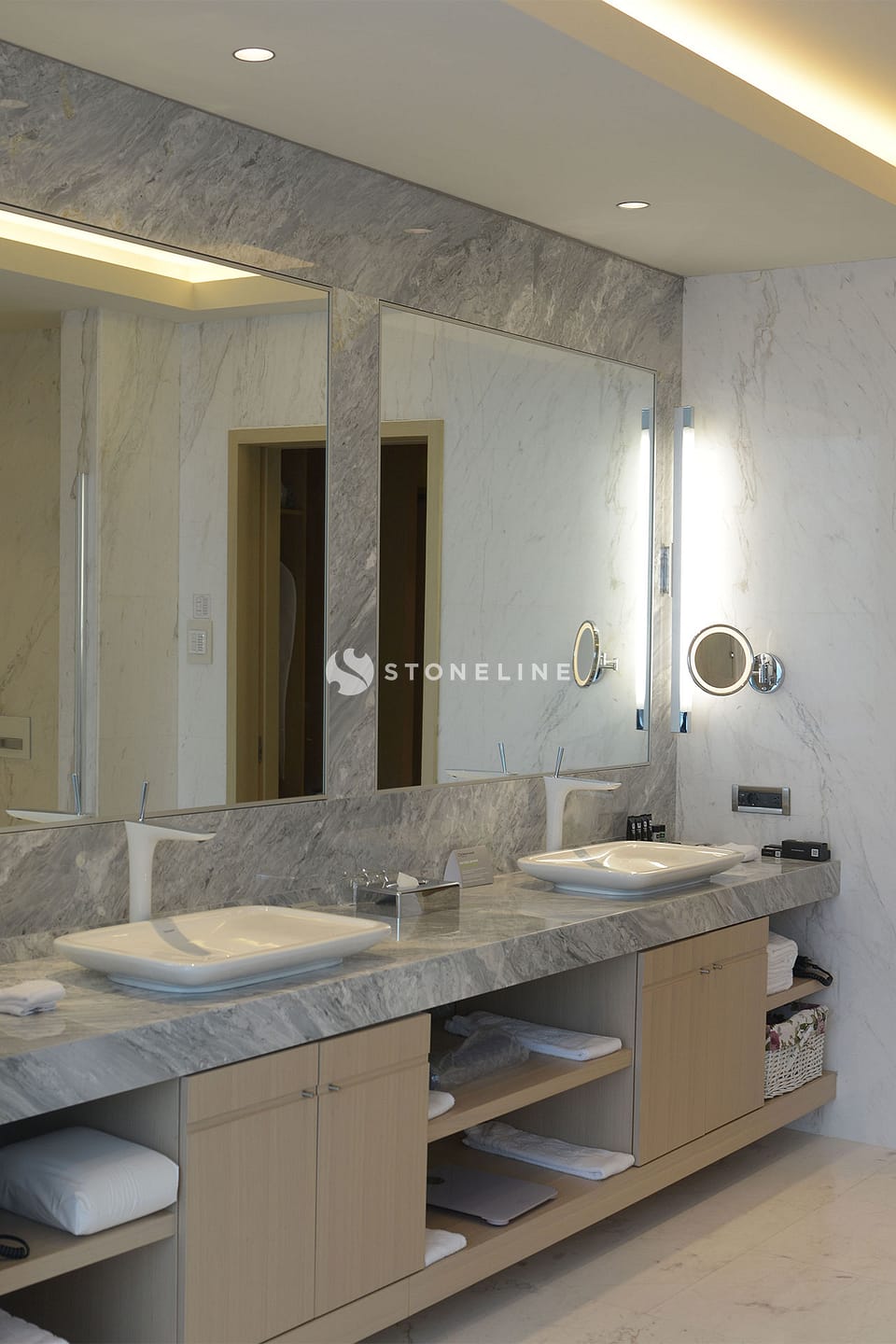 This hotel project, designed with Stoneline natural stone, combines elegance and durability. The Stoneline collection, featuring special stones such as Versalys, Bruno Perla, Bianco Fantastico, Leather Brown, Elegant Grey and Caceres Dark, brings the beauty of nature indoors, lending every space a timeless sophistication and distinct character.