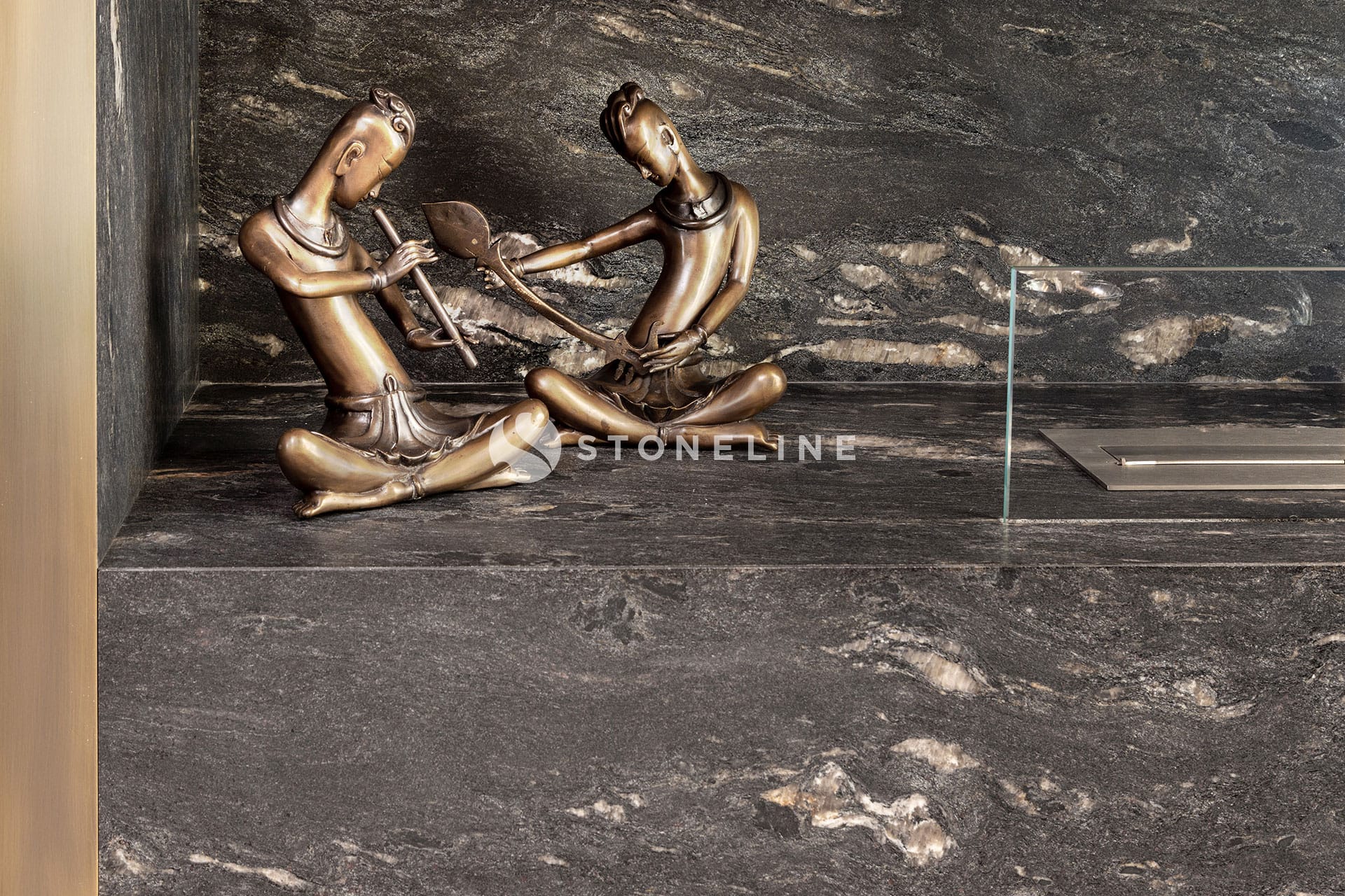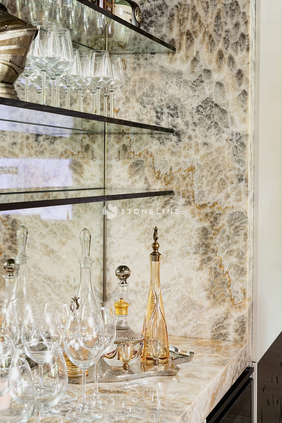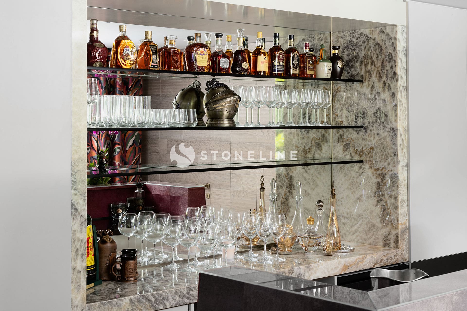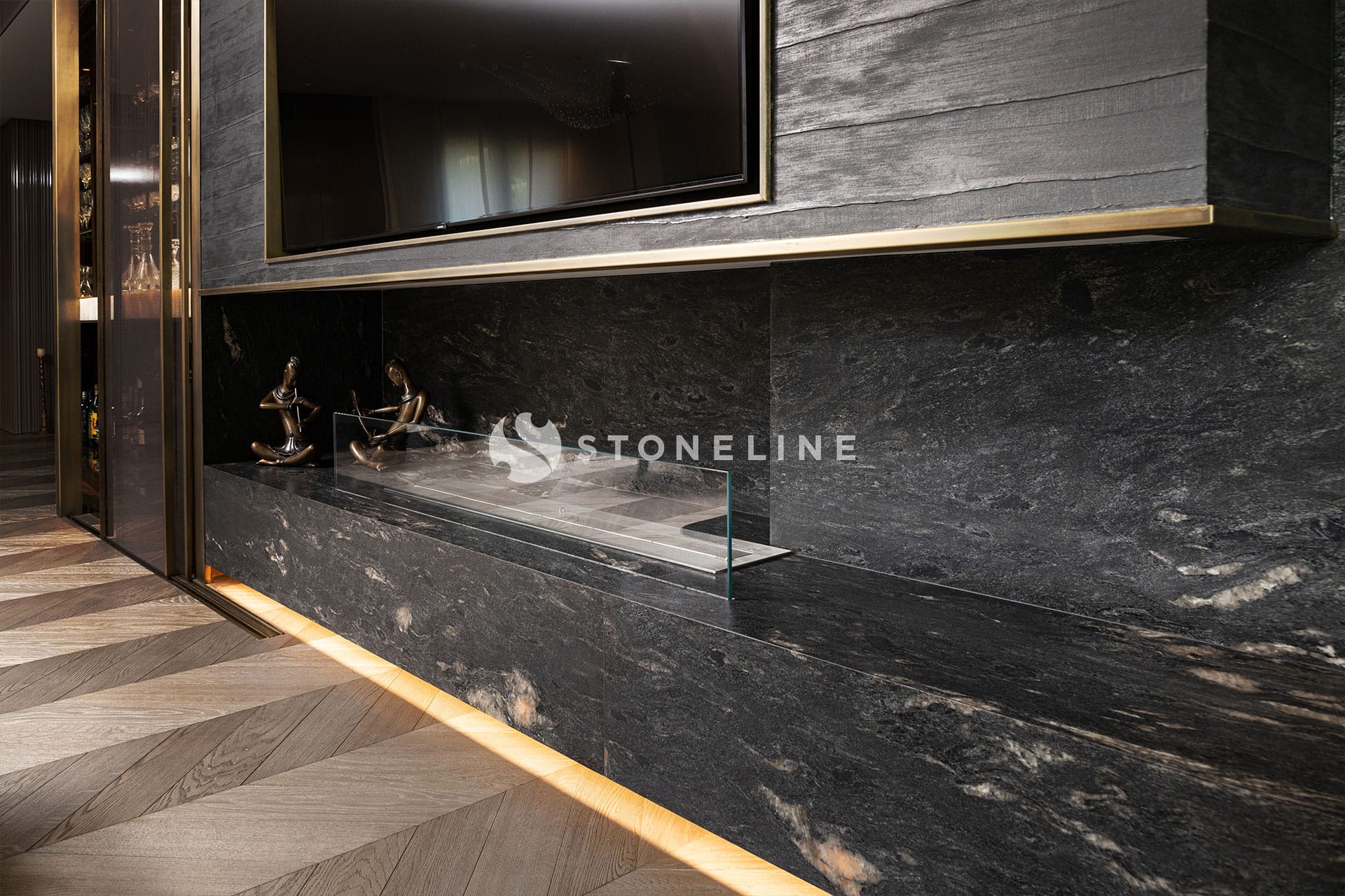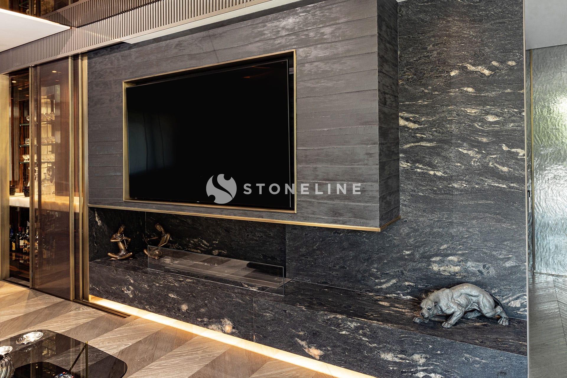 This residence project houses Cosmos Black granite for its authentic color and sparkling look in the fireplace and outdoors. The dinner table features Tiger Eye, while Grey Bubble Onyx adds elegance to the bar. Bamboo Quartzite and Statuario A1 enrich the bathrooms with timeless beauty.