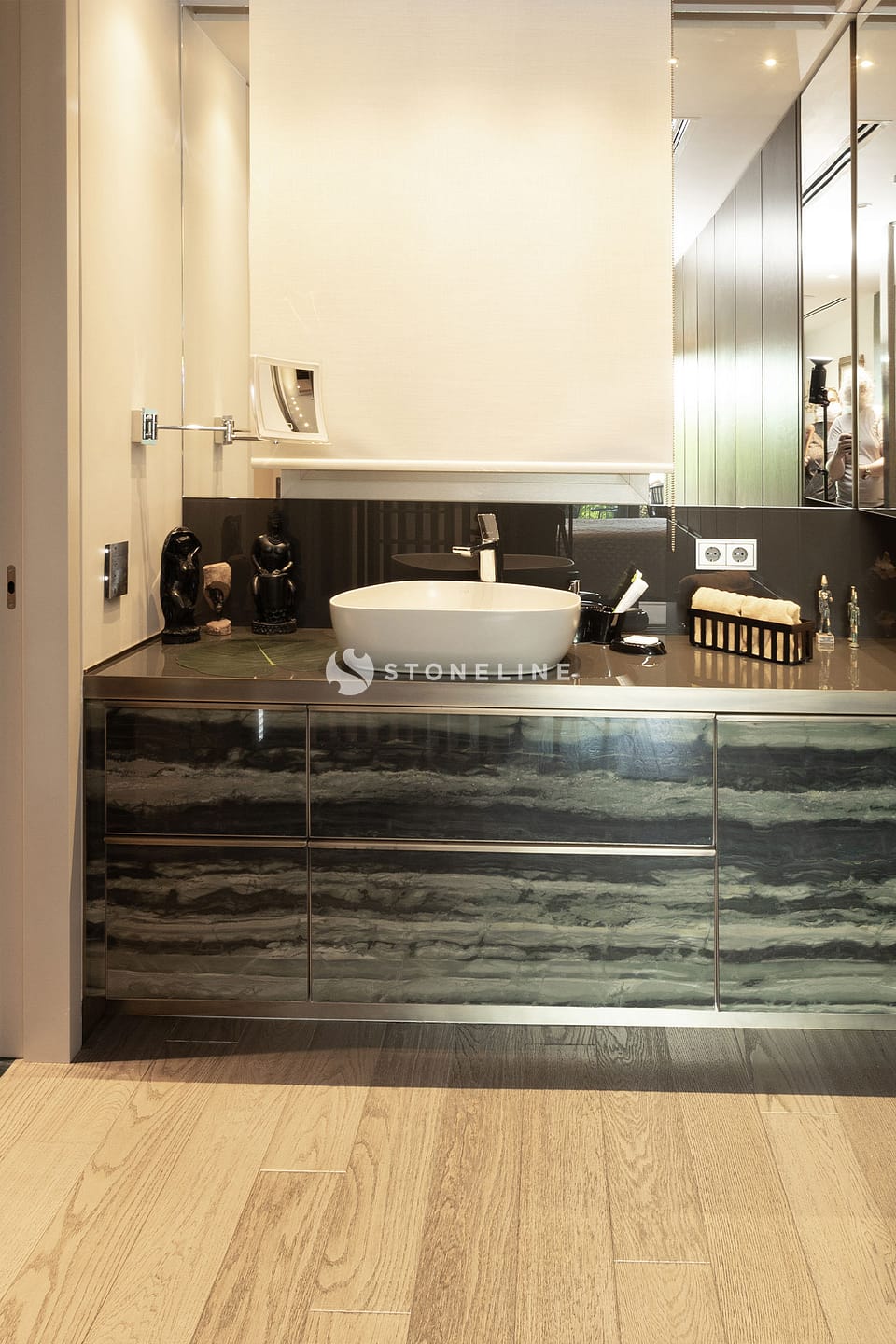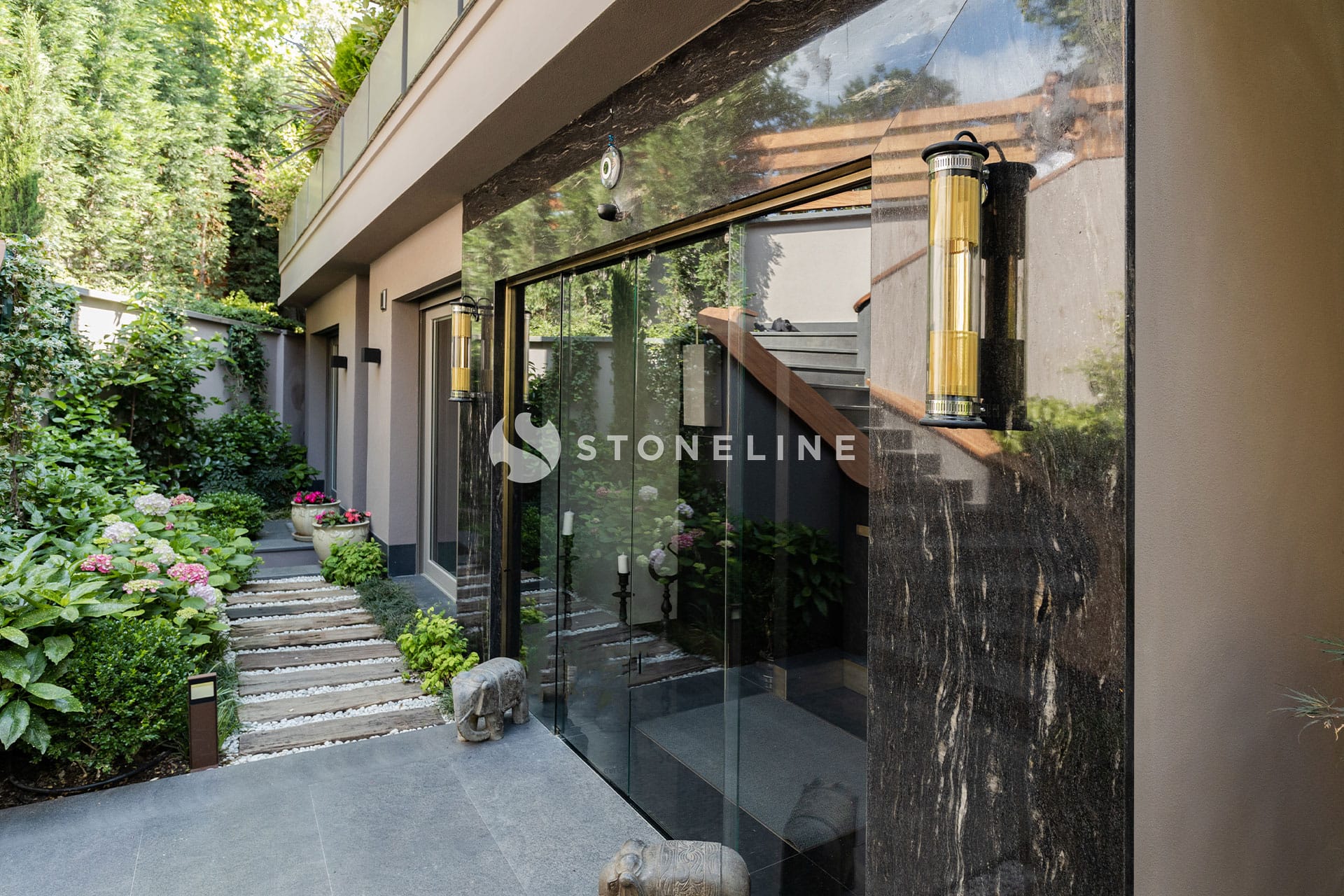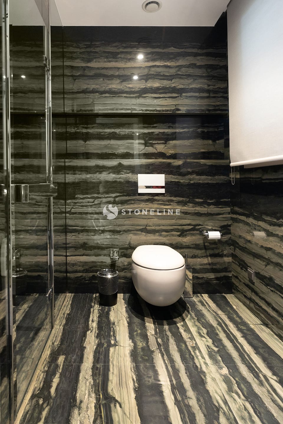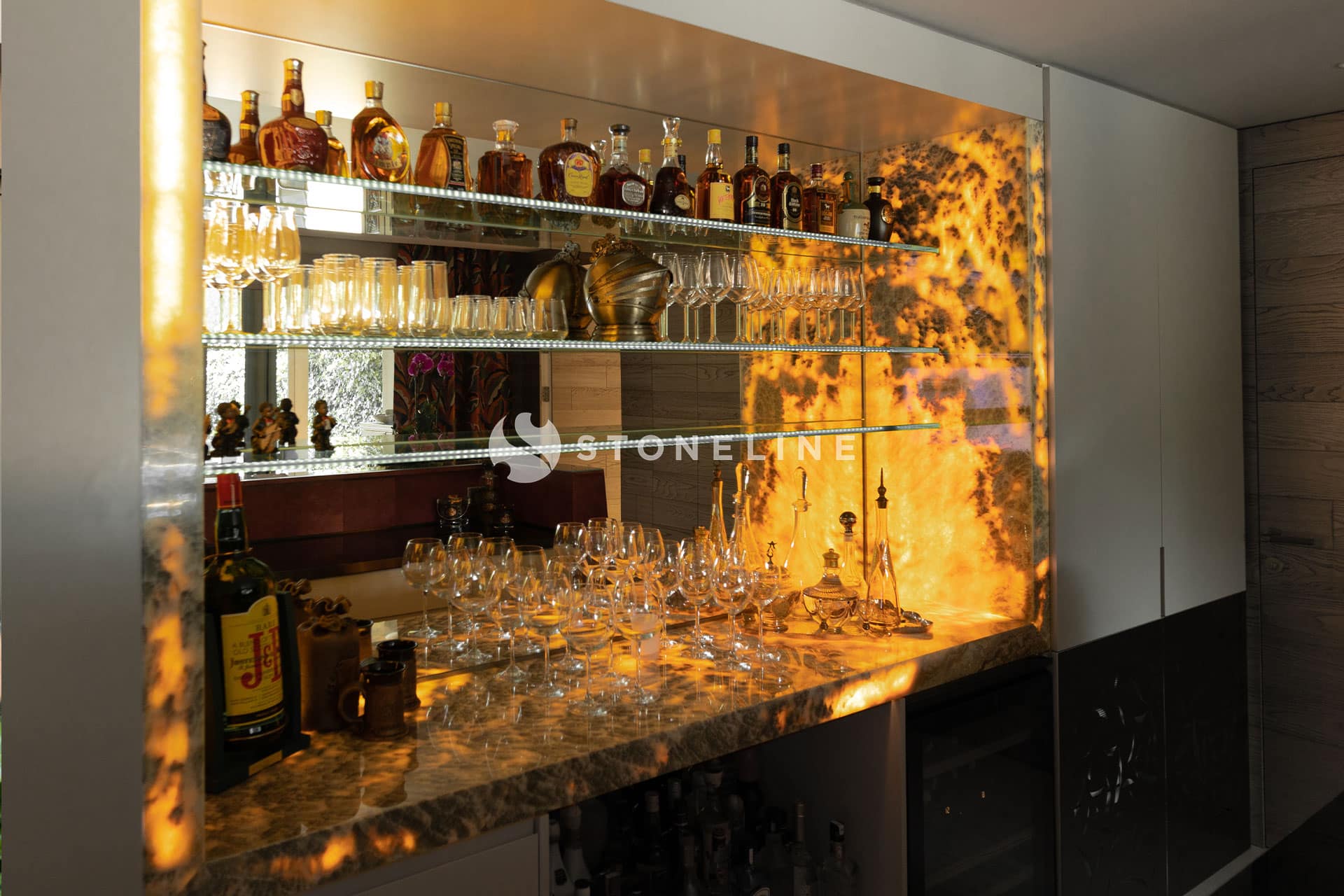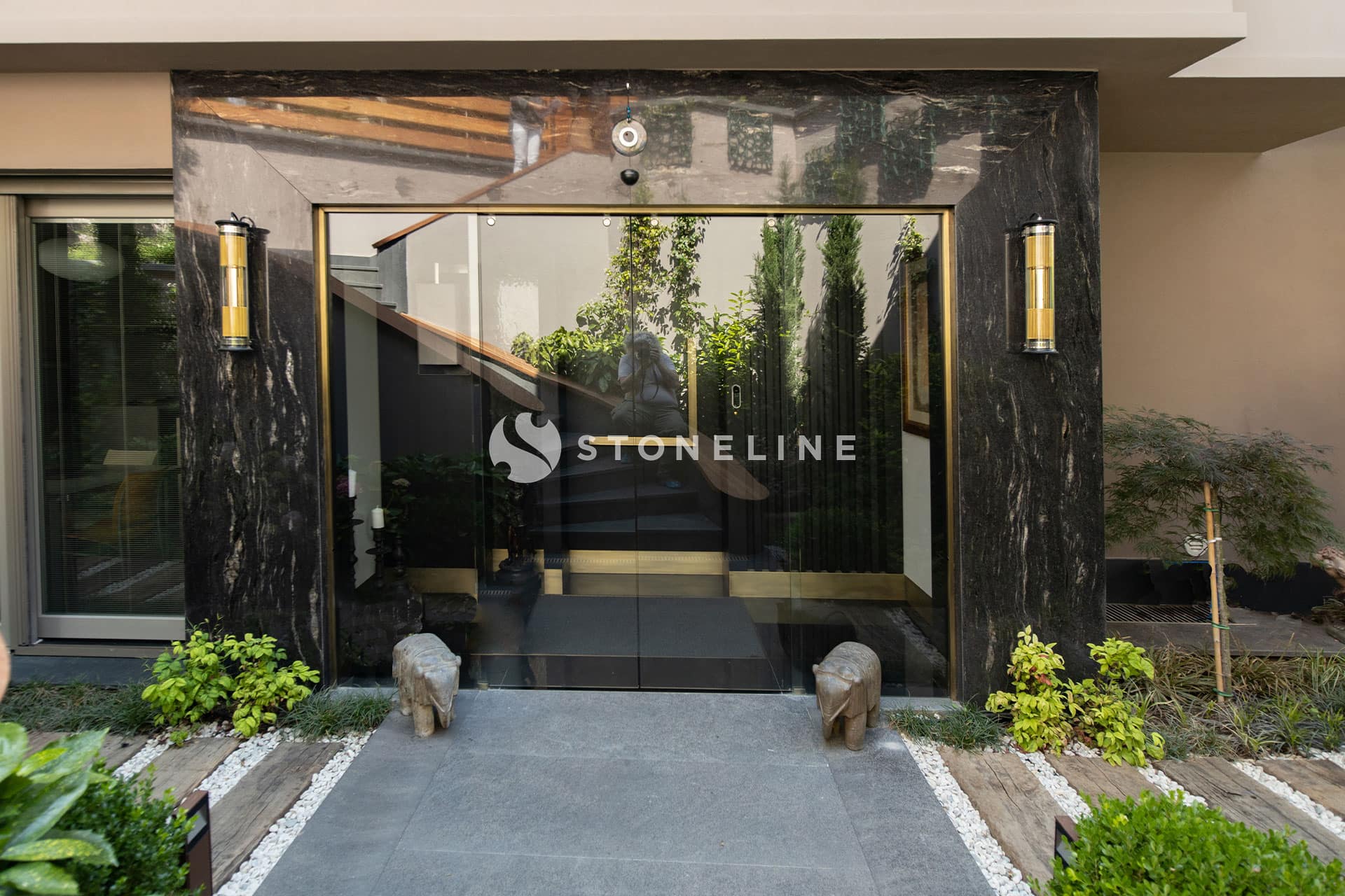 This residence project houses Cosmos Black granite for its authentic color and sparkling look in the fireplace and outdoors. The dinner table features Tiger Eye, while Grey Bubble Onyx adds elegance to the bar. Bamboo Quartzite and Statuario A1 enrich the bathrooms with timeless beauty.