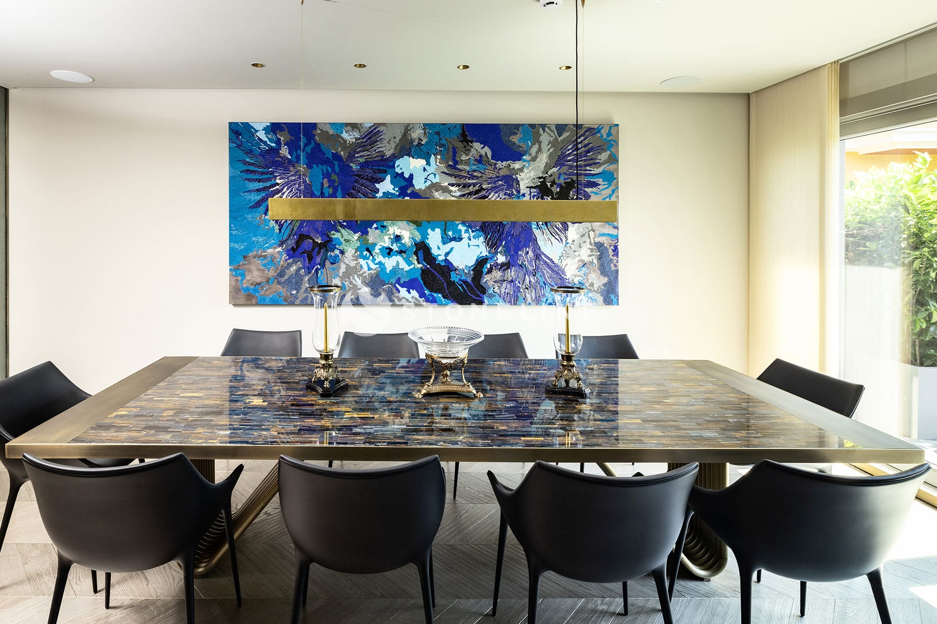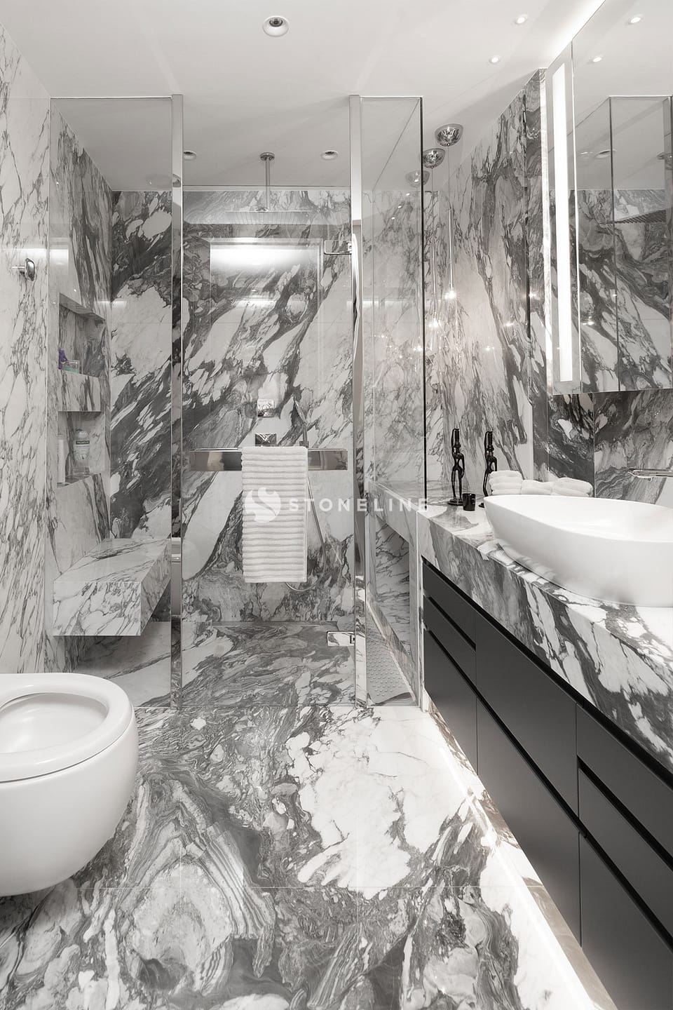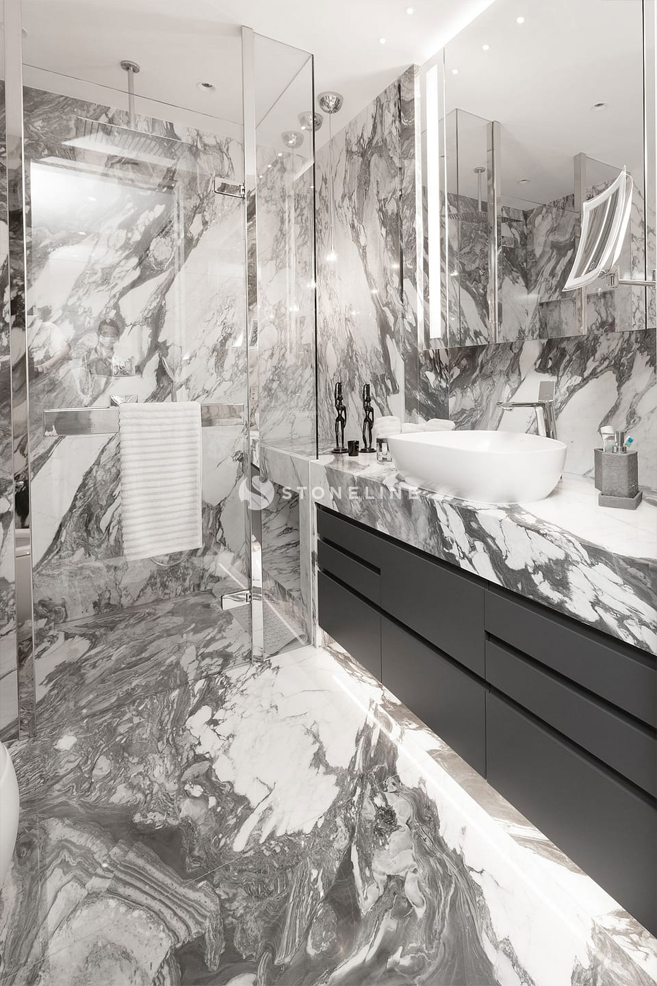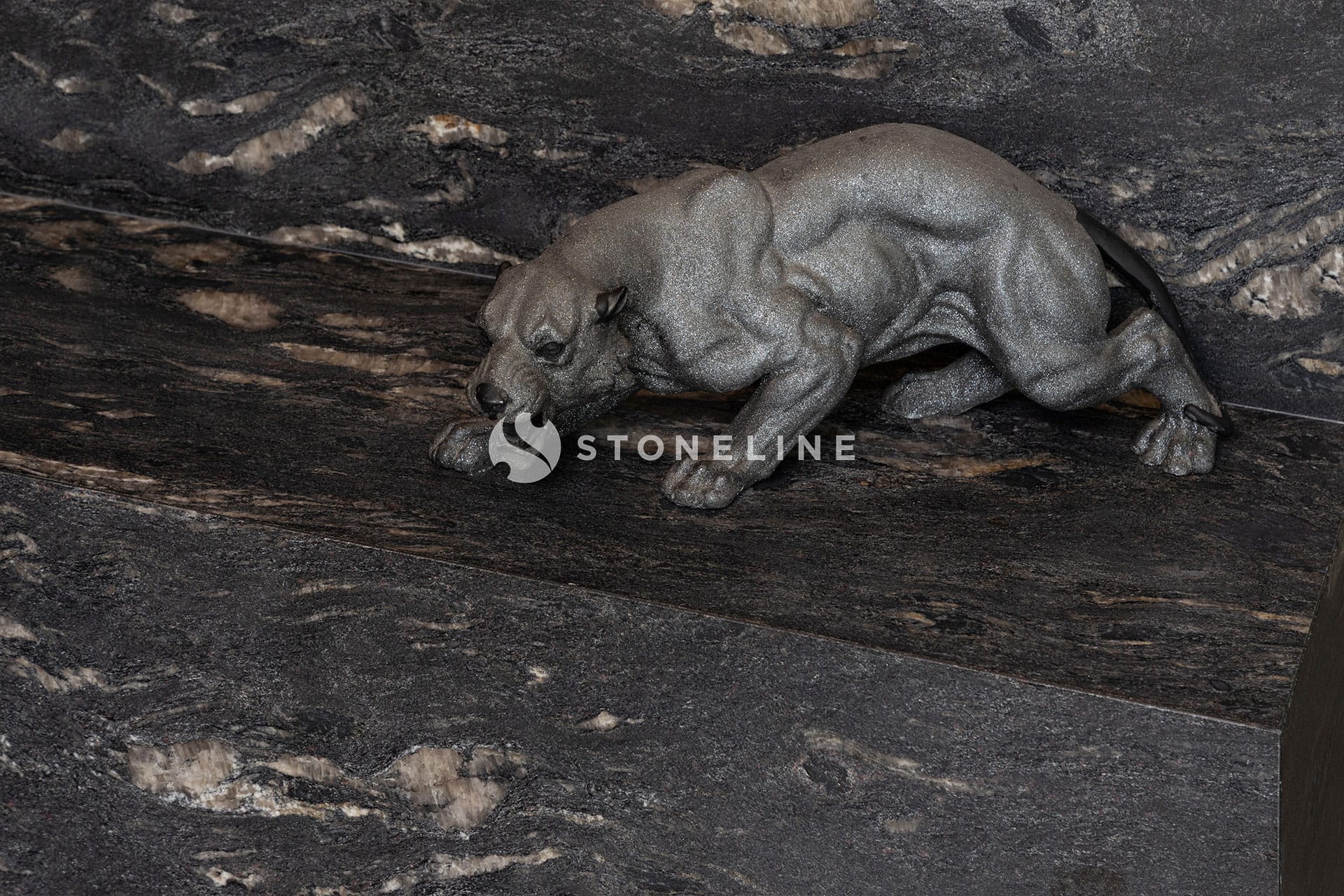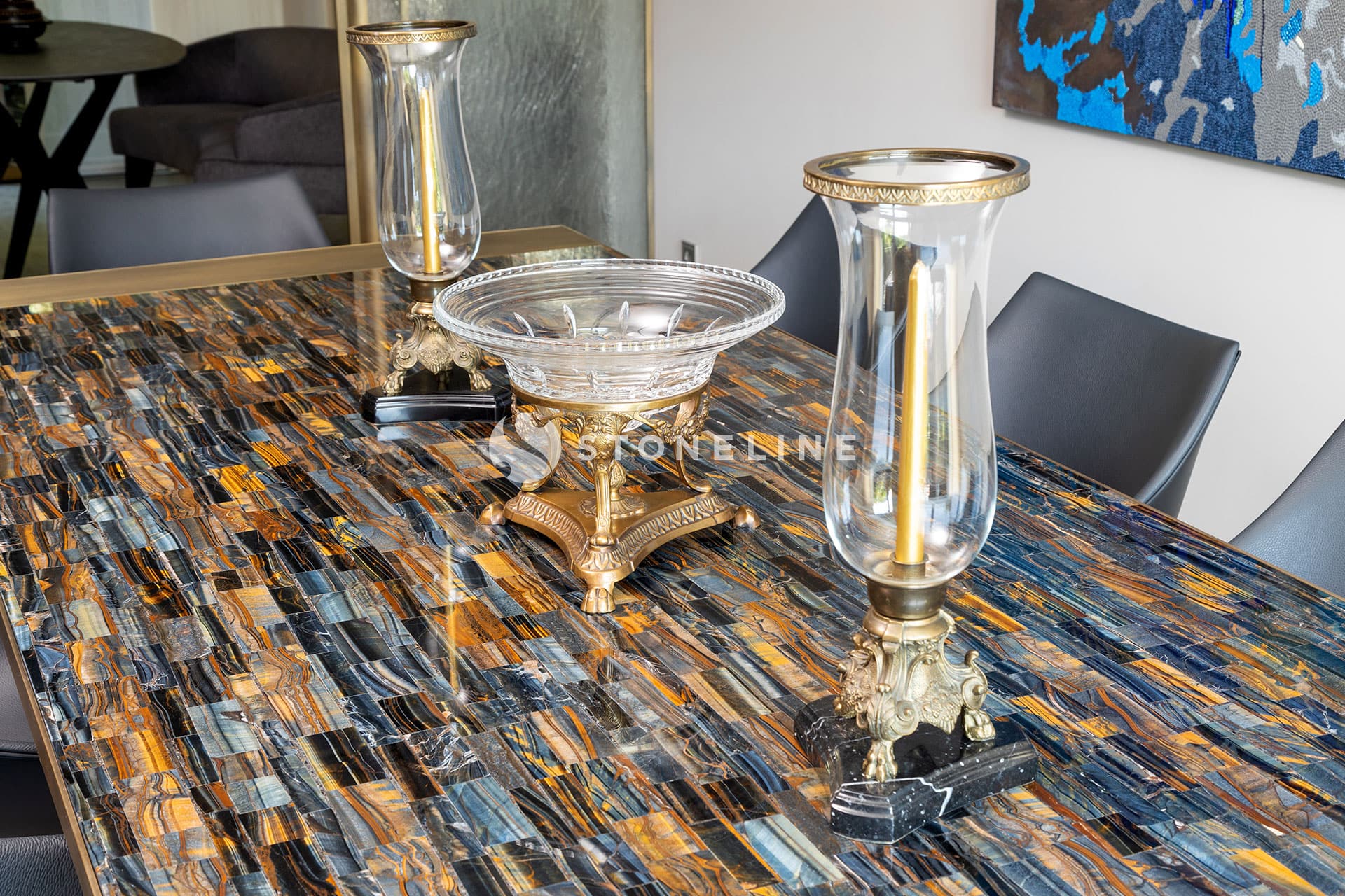 This residence project houses Cosmos Black granite for its authentic color and sparkling look in the fireplace and outdoors. The dinner table features Tiger Eye, while Grey Bubble Onyx adds elegance to the bar. Bamboo Quartzite and Statuario A1 enrich the bathrooms with timeless beauty.