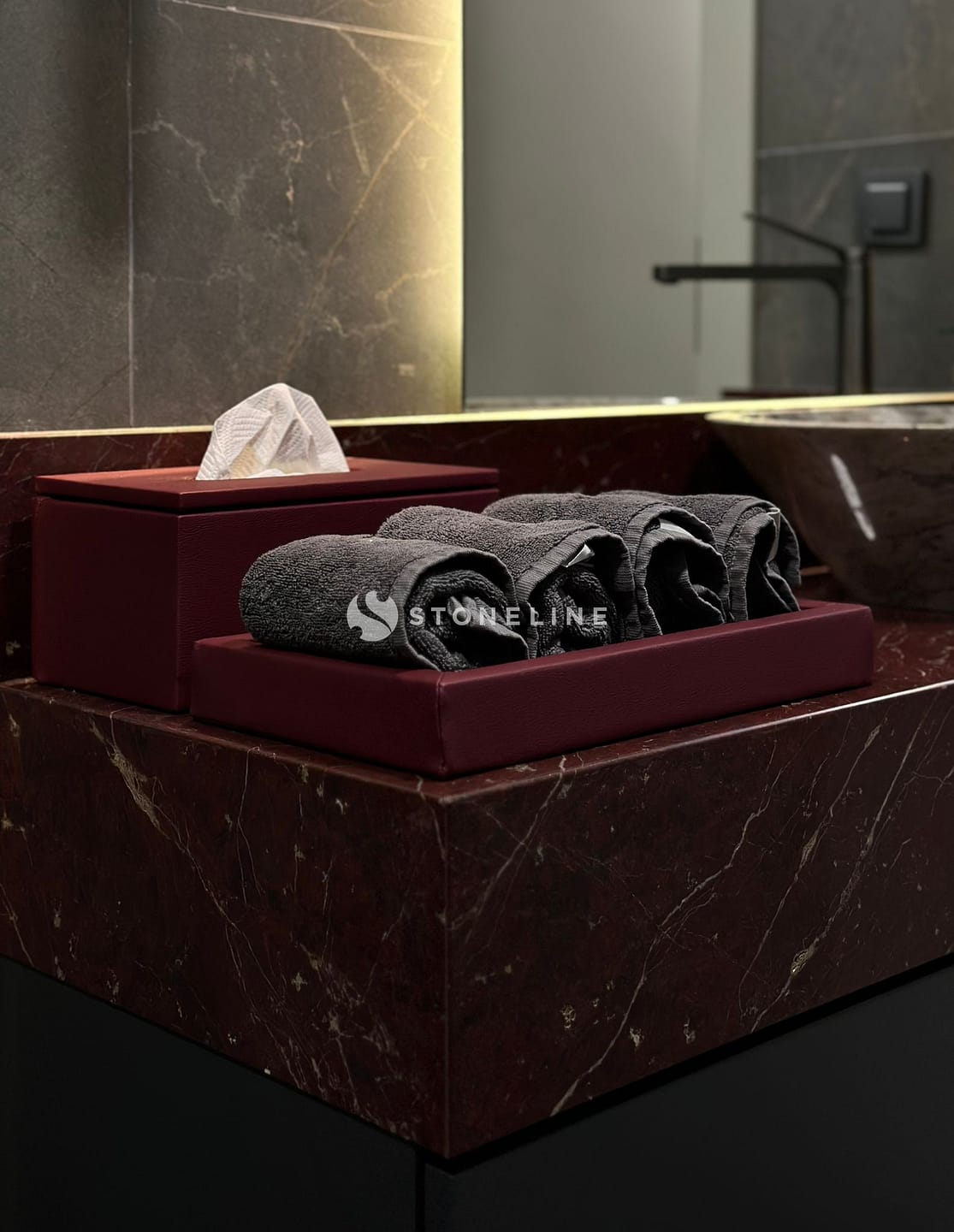 Designed with Stoneline’s stunning Imperial Red stone, this private residence bathroom offers a unique space where luxury and elegance come together. The vibrant red tones of the natural stone add warmth and sophistication to the bathroom, while the elegant grain structure represents prestige and elegance in every detail.