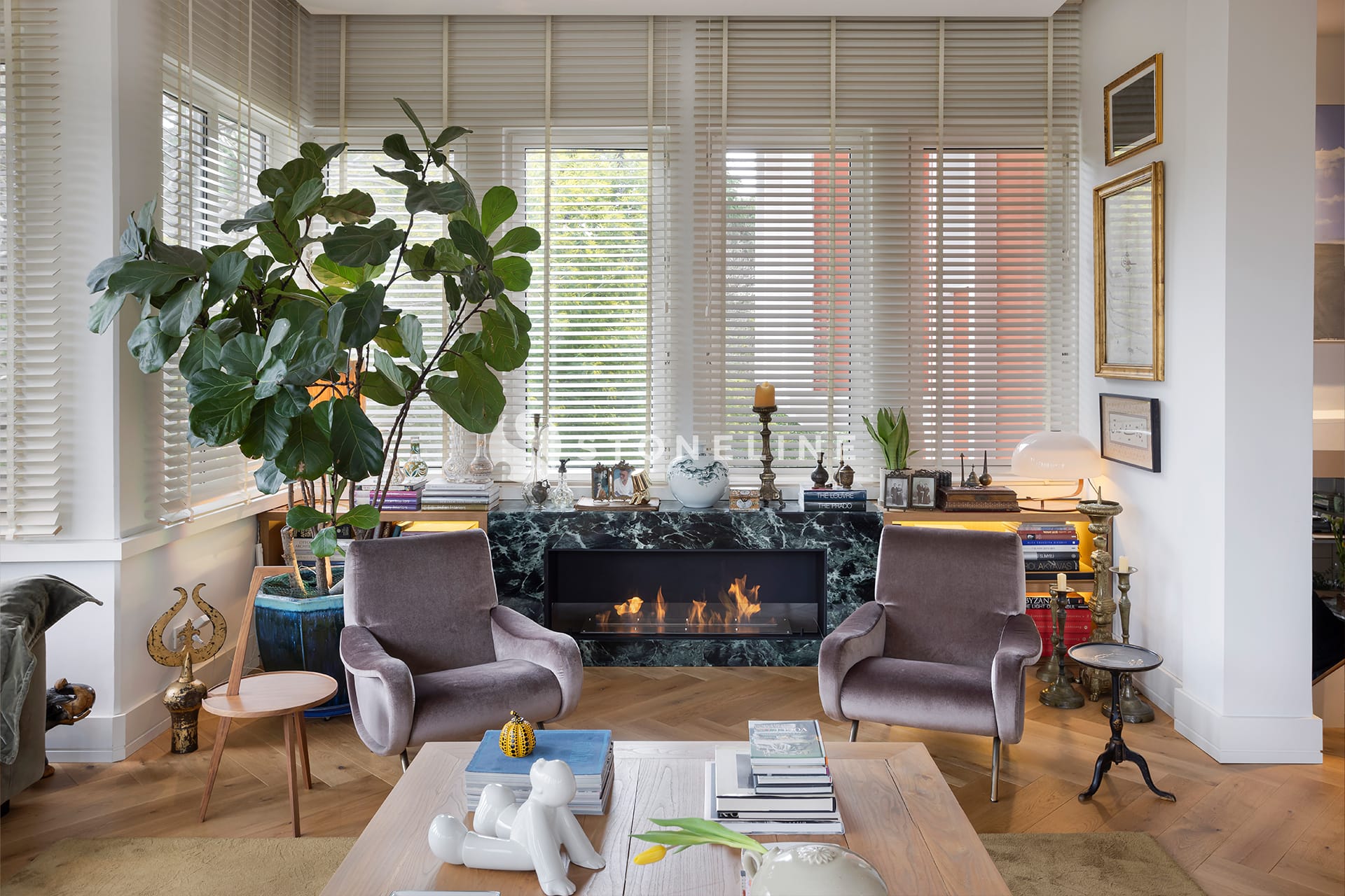 This private residence project was designed in perfect harmony with Stoneline’s exclusive stones. The fireplace made of Verde Genova and the kitchen countertop made of Calacatta Viola Wow combine aesthetics and functionality.