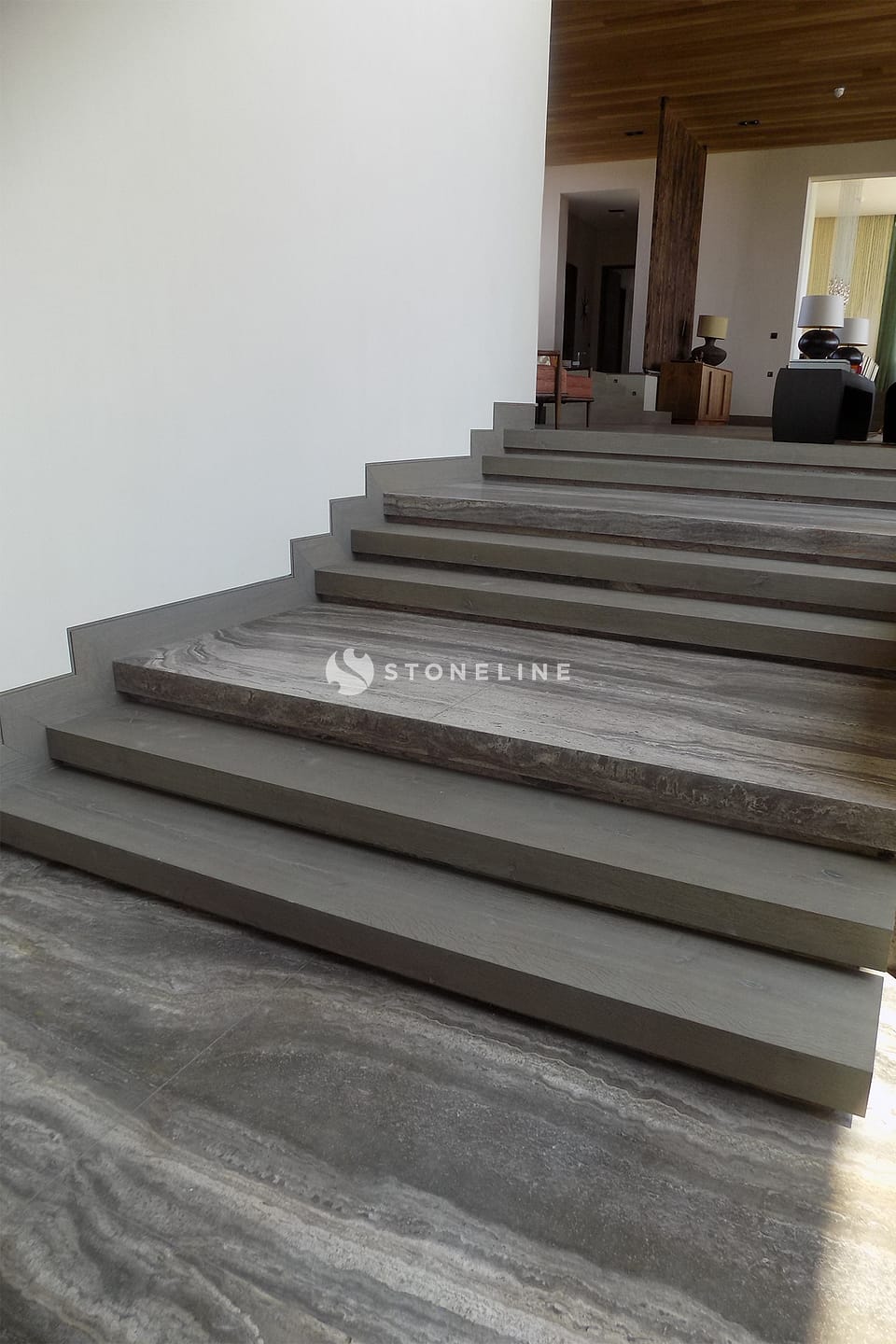 Although resembling travertine, Titanium is a marble that creates a warm and intimate atmosphere with its linear veins and soft tones. In this project, it is accompanied by Blue Ajia, Ivory Grey, Metalicus, New Cipollino and Coffee Serpegiante from Stoneline’s collection.