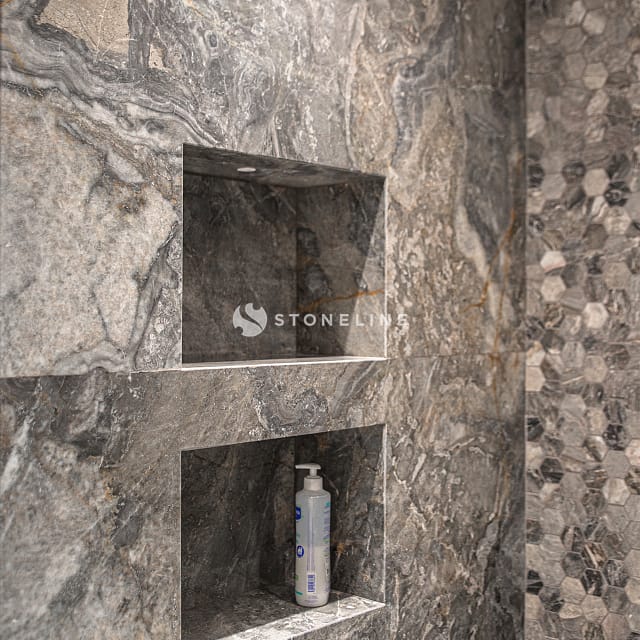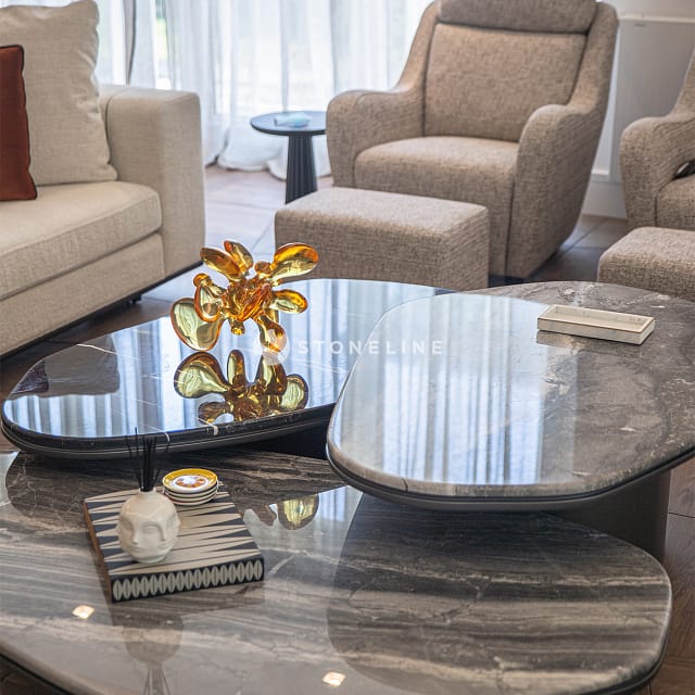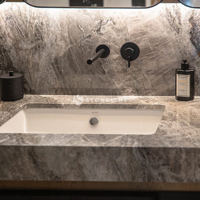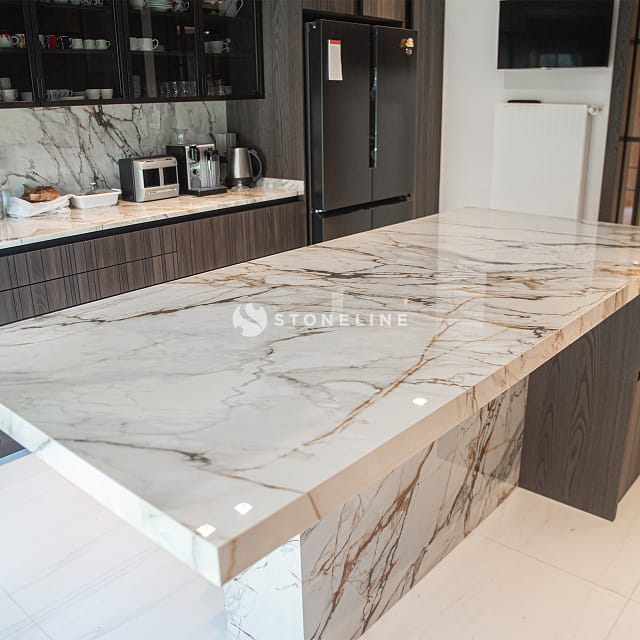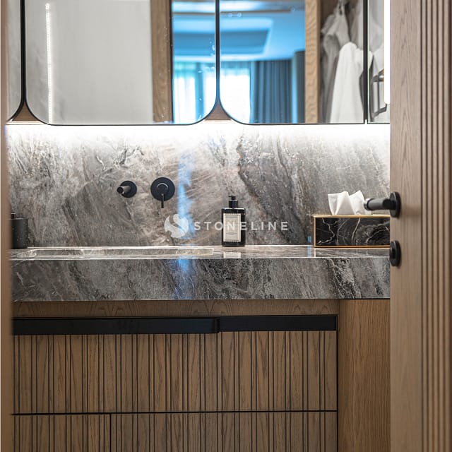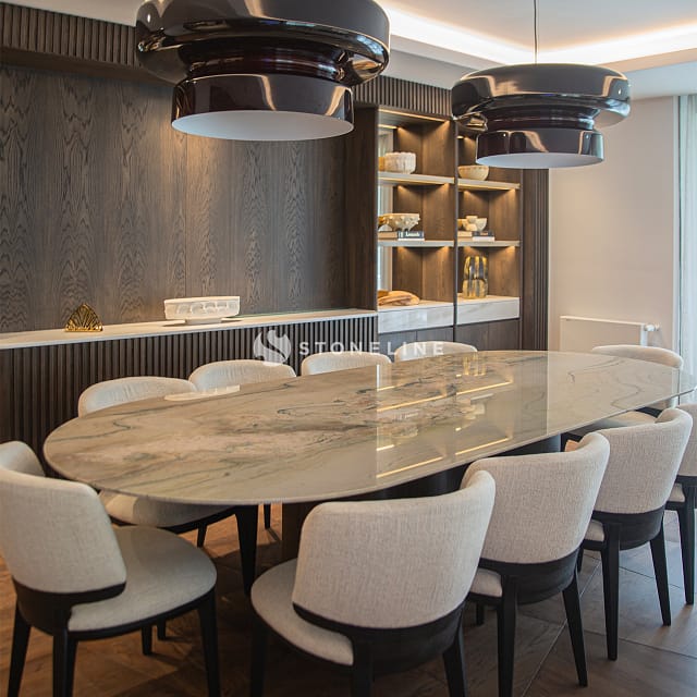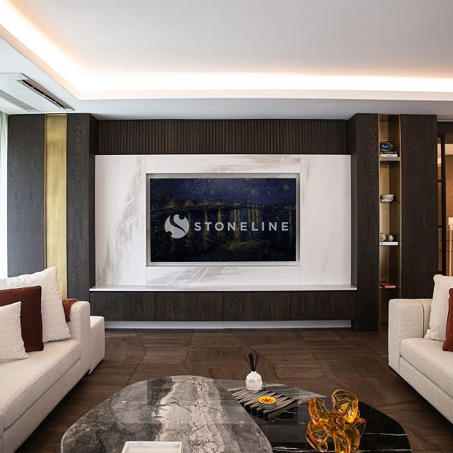 Designed with Stoneline’s superior quality natural stones, this exclusive residence project stands out as a symbol of luxury and modern living. Created with the fascinating combination of Calacatta Vogue Extra, Lotus Quartzite, Cascad Extra and Poseidon stones, this project attracts attention with every detail.