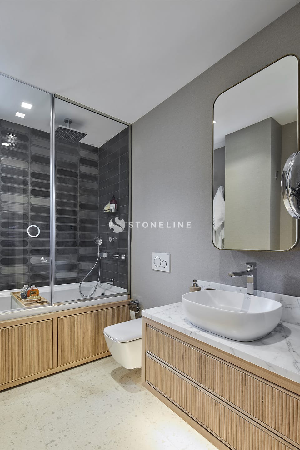 In this special residence project designed by Esra Kazmirci Architecture, Graphite, Calacatta Carrara Extra, Trani Grey, Bianco Lasa Venato Gold, New Shooting Star stones from the Stoneline natural stone collection were preferred. Hundreds of stones in the Stoneline natural stone collection are waiting for you to be your source of inspiration.