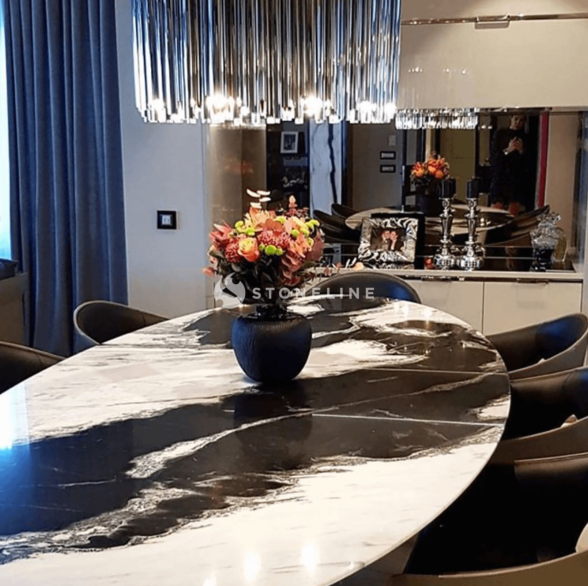 The unique Black Horse marble from the Stoneline collection lends a sophisticated and timeless aesthetic to the dining table in the residential project.