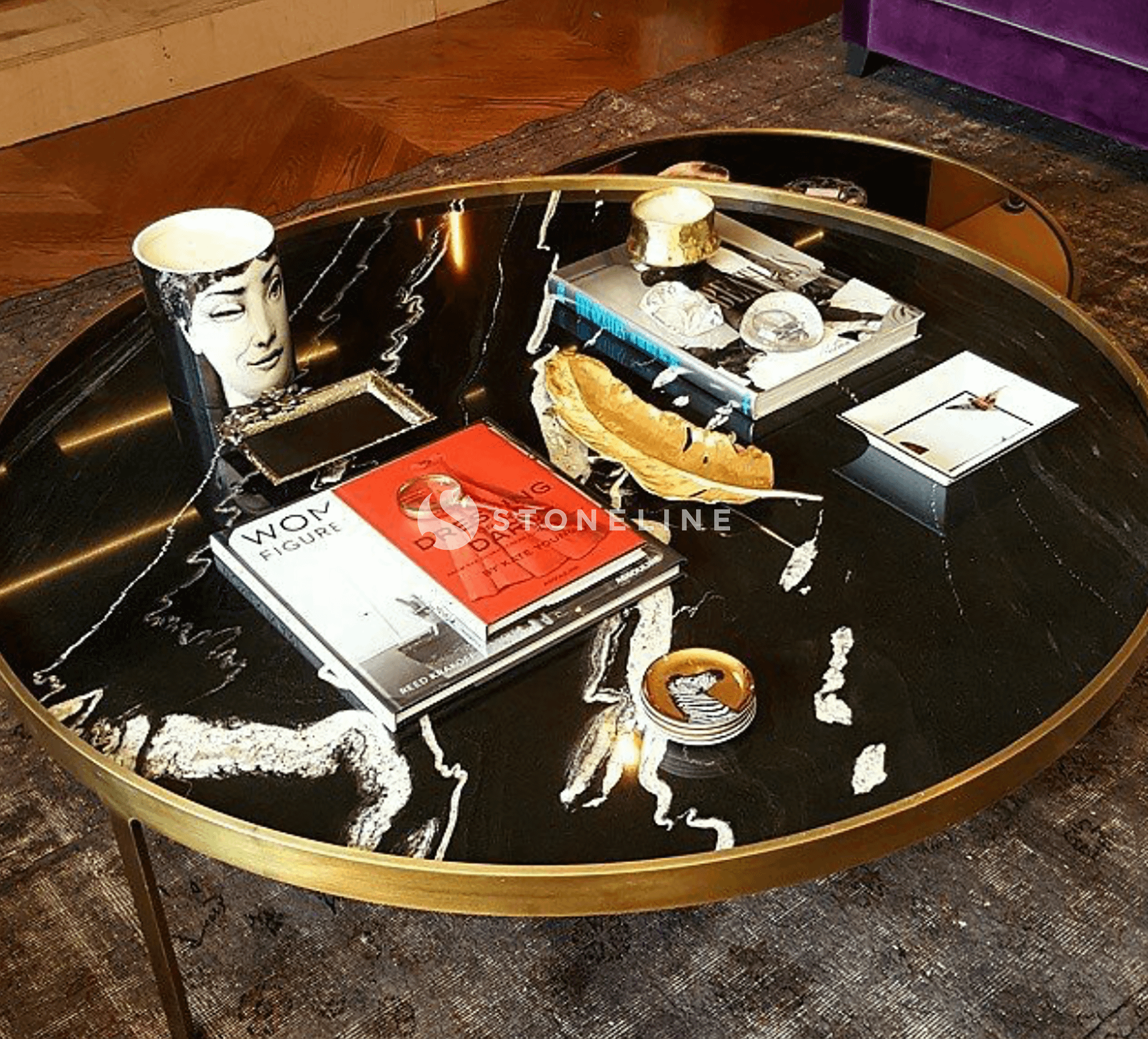 The dinner table reflects the eternal harmony between black and white with Noma Black – one of the rarest marbles in Stoneline’s natural stone catalogue. You can make use of hundreds of different natural stones from Stoneline’s catalogue for dinner/coffee/side tables.