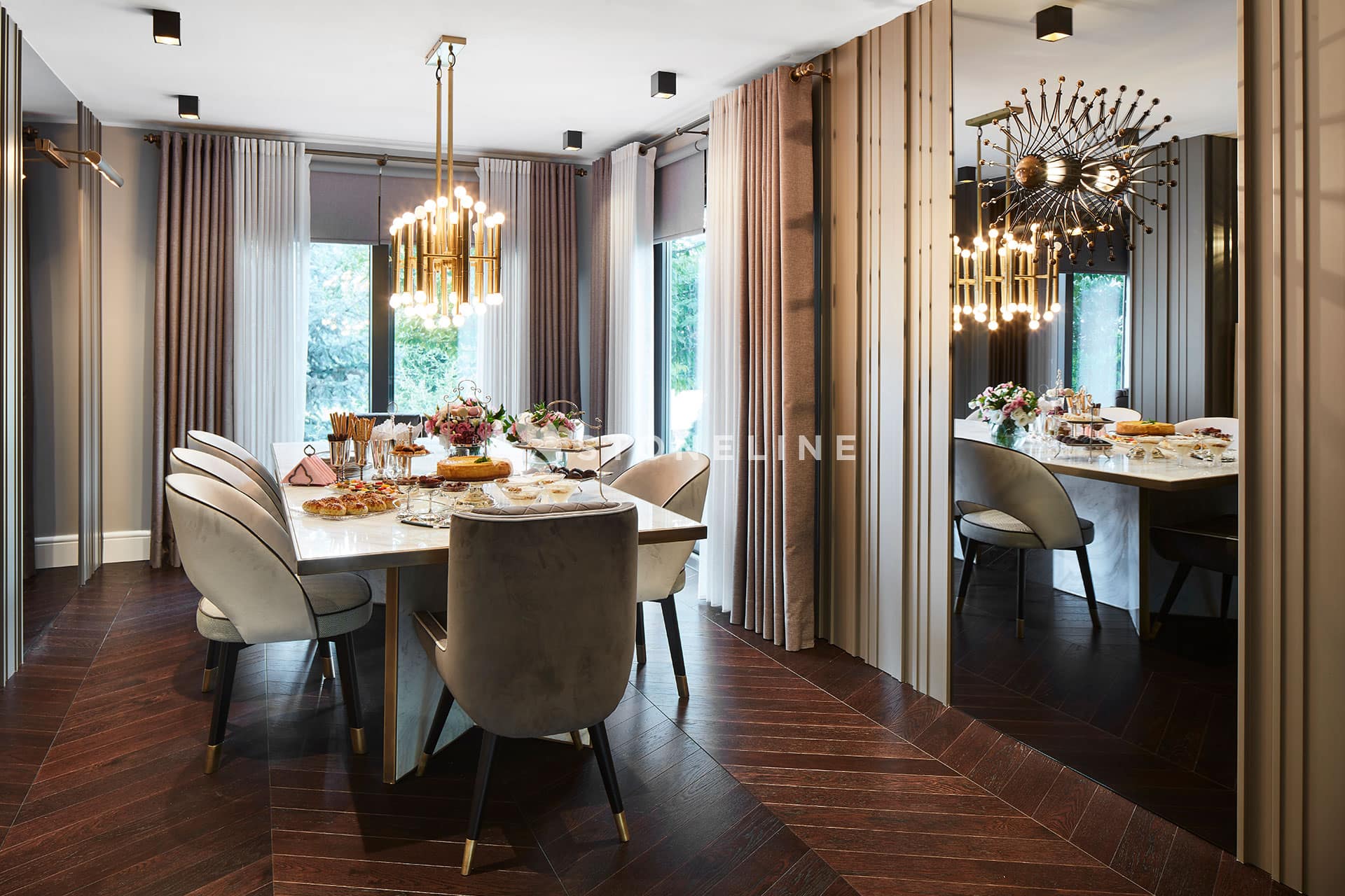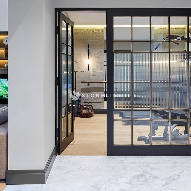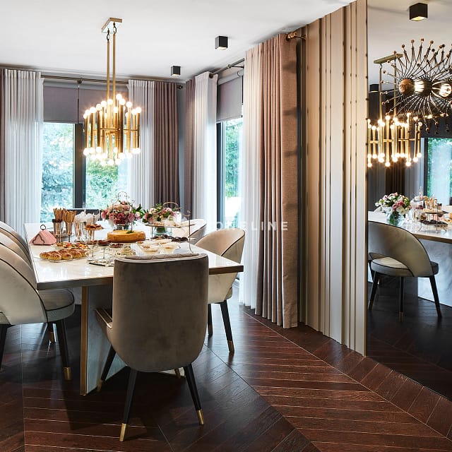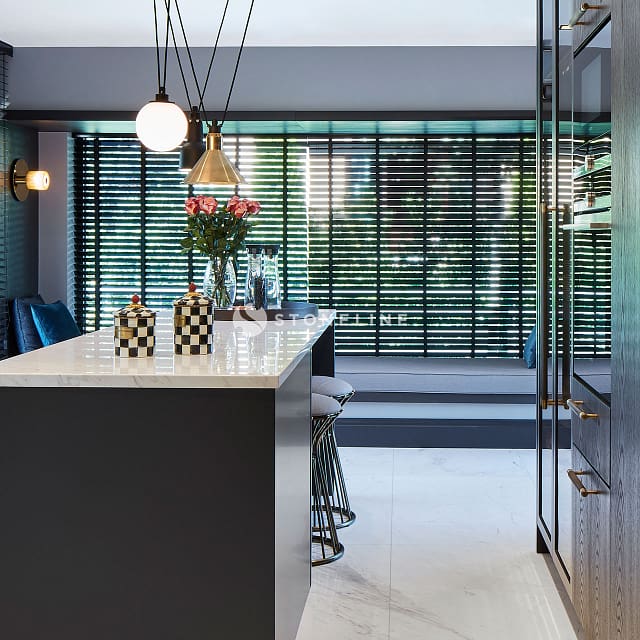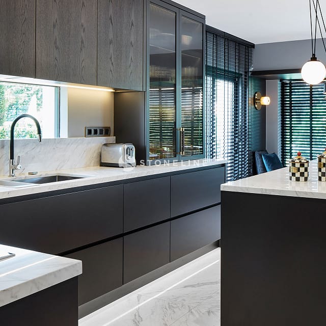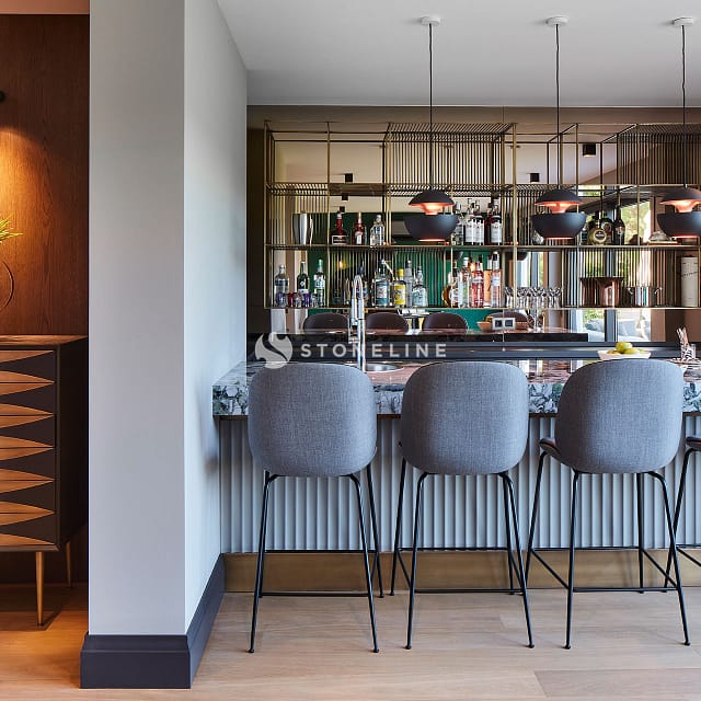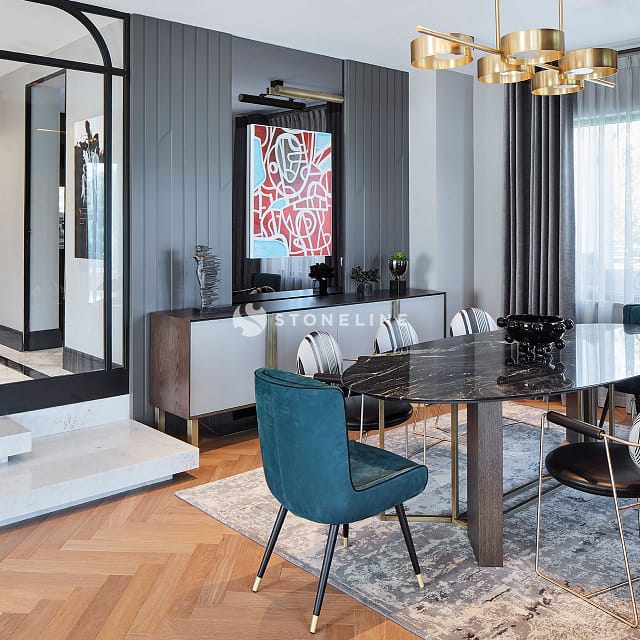 Elegance and functionality are served together in this private residence by Esra Kazmirci Architecture. Interiors are decorated with Bianco Fantastico marble in bathroom and kitchen while King Black is used as curb. Green&Grey is preferred in the bar with its attractive pastel green hues and traditional lines while Beldere is the choice for the dinner table as the ideal one for timeless designs.