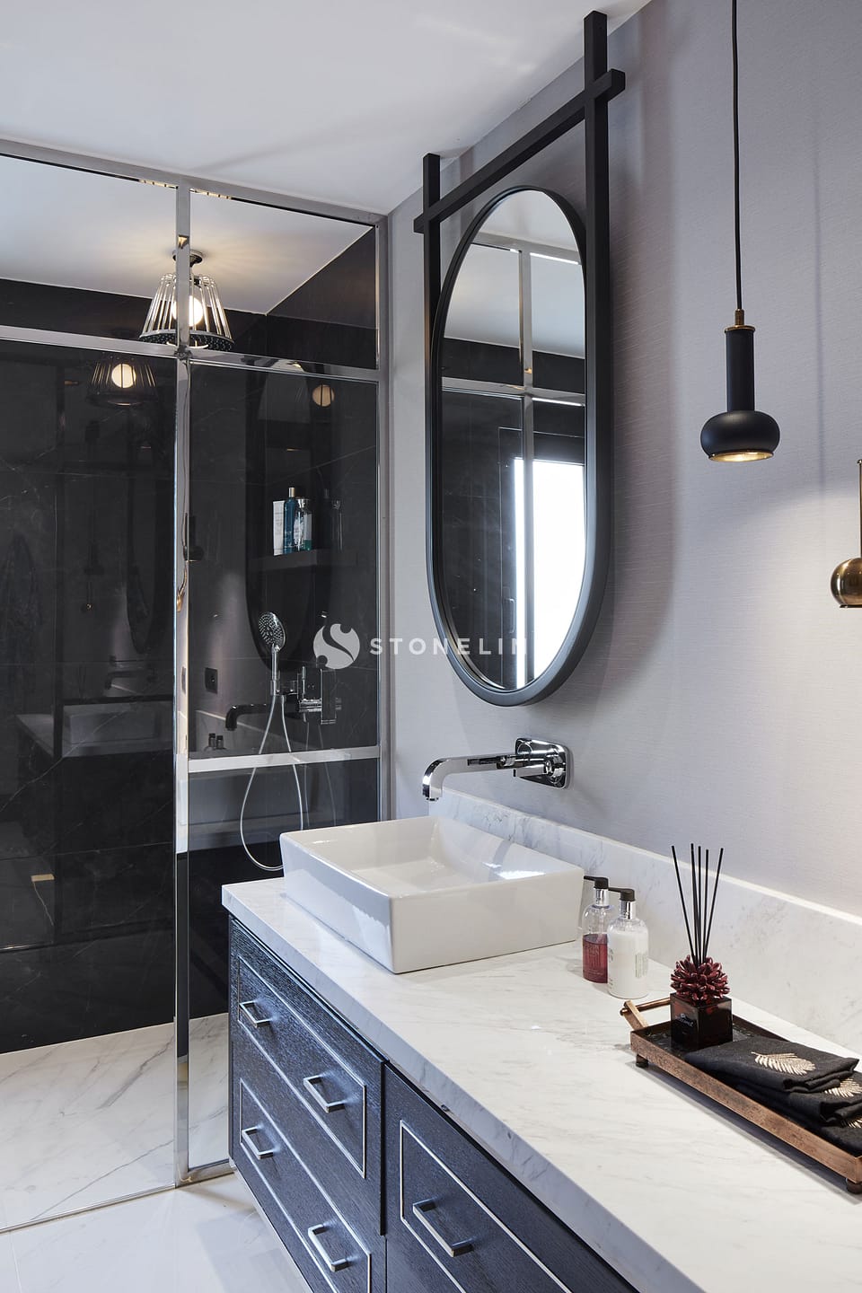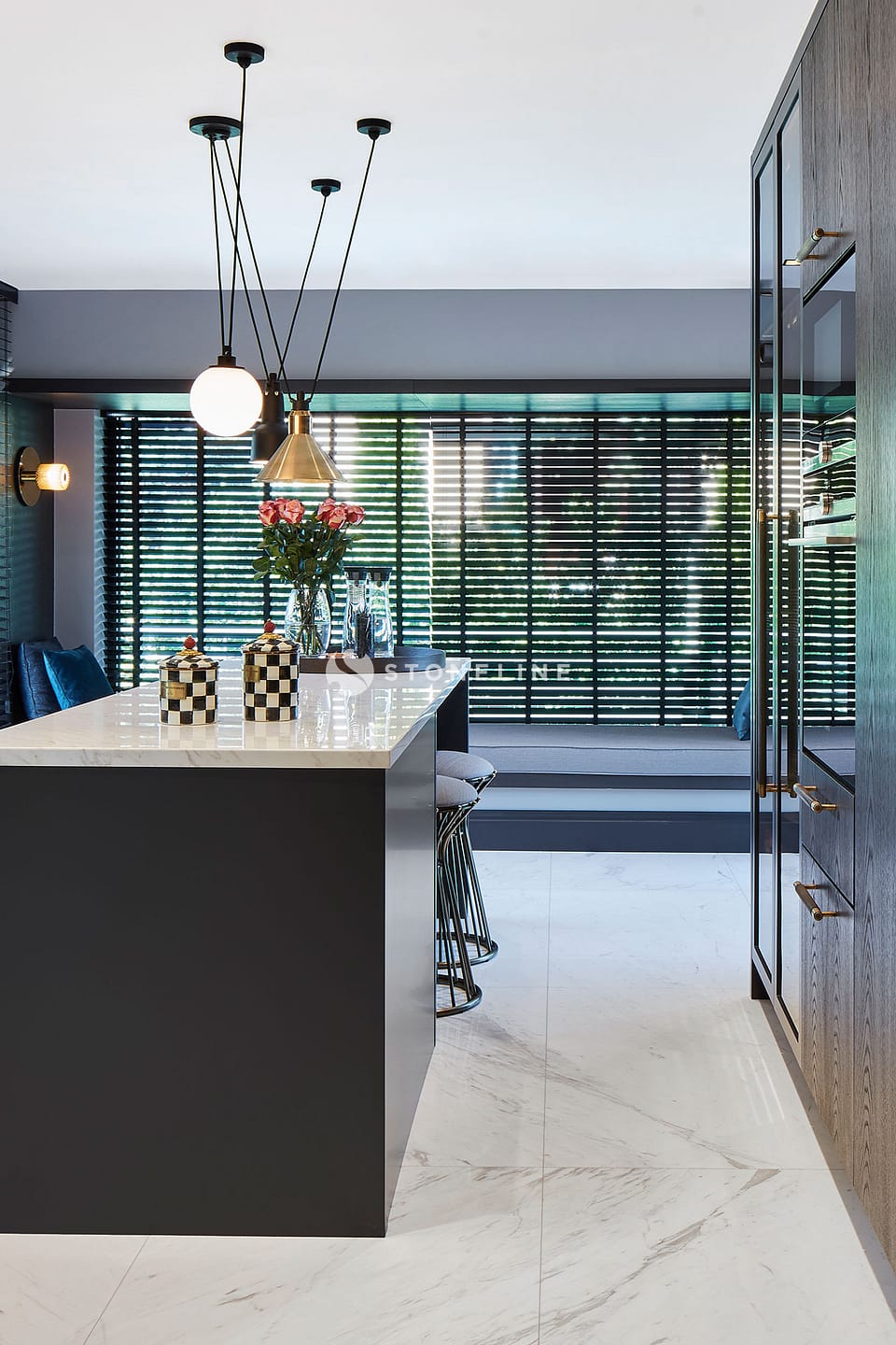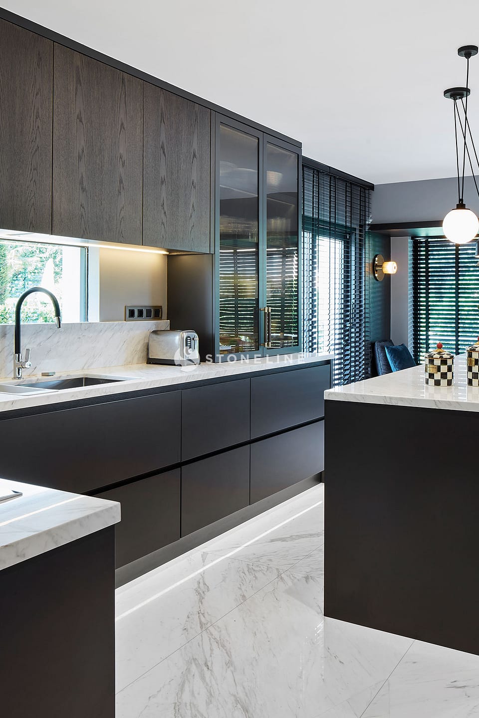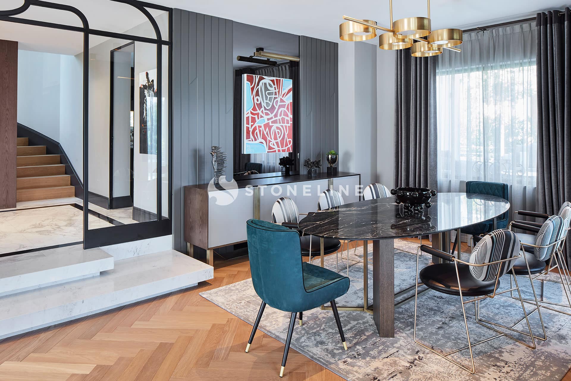 Elegance and functionality come together in this private residence. Interiors are decorated with Bianco Fantastico marble in the bathroom and kitchen, while King Black is used as curb. Green&Grey enriches the bar, and Beldere stands out on the dinner table for timeless design.