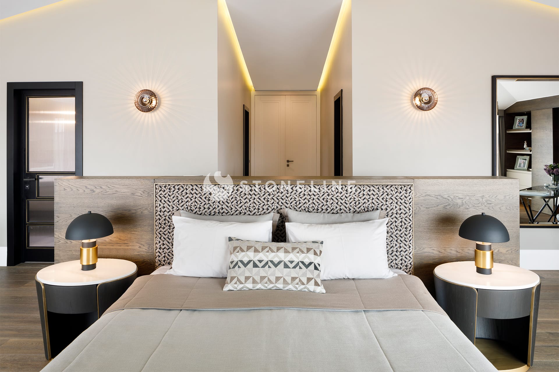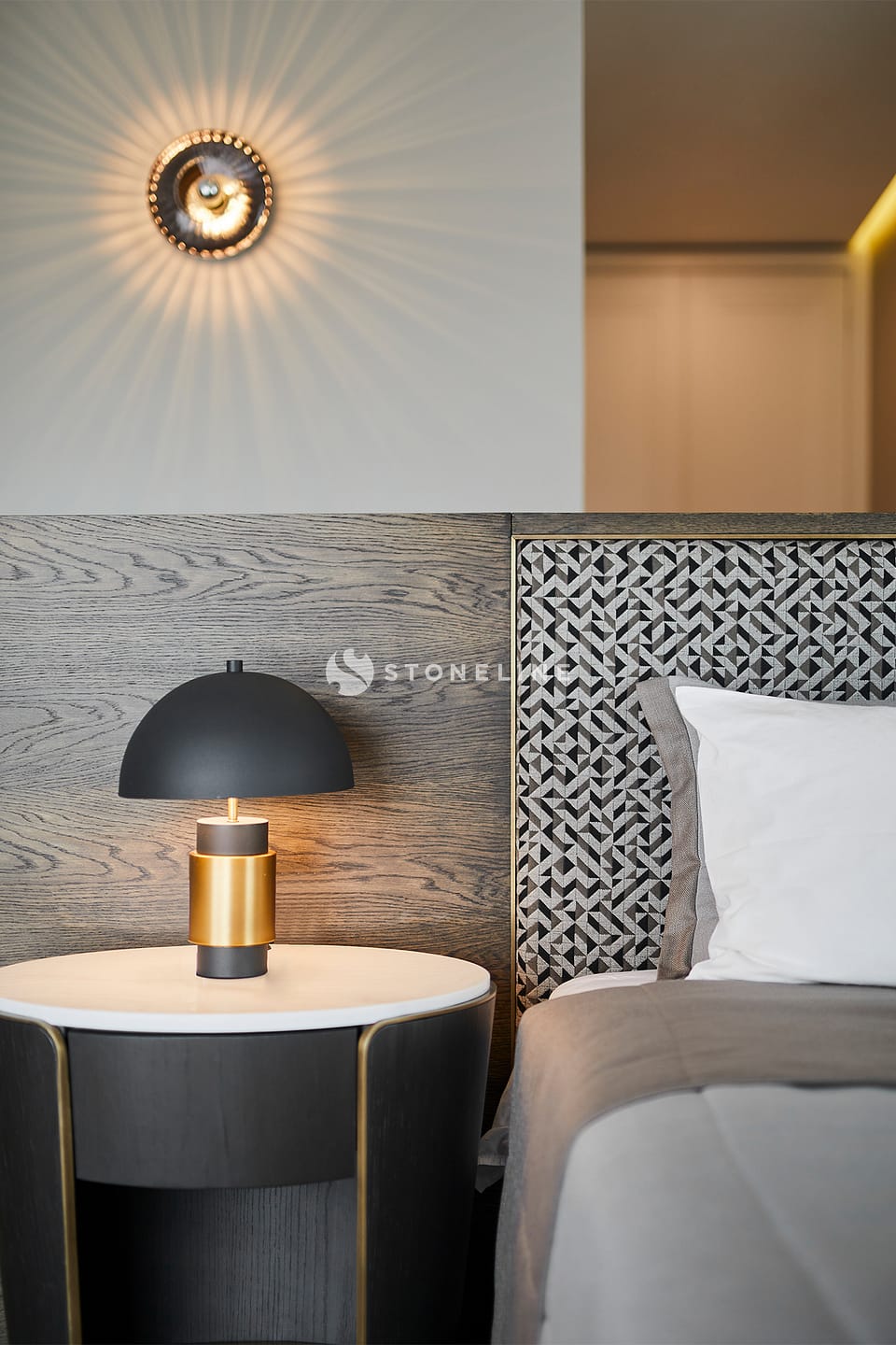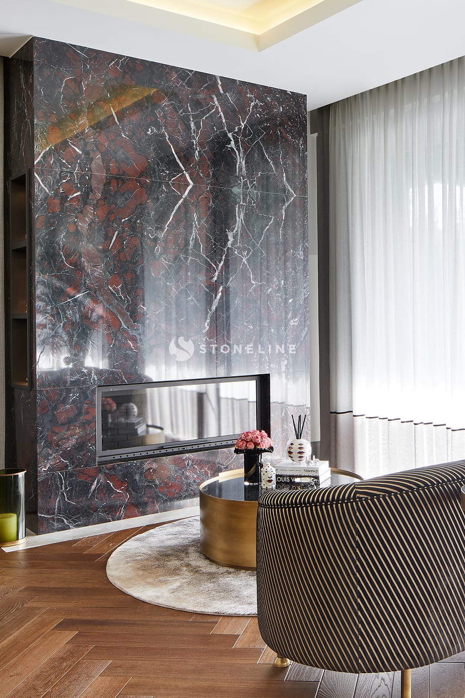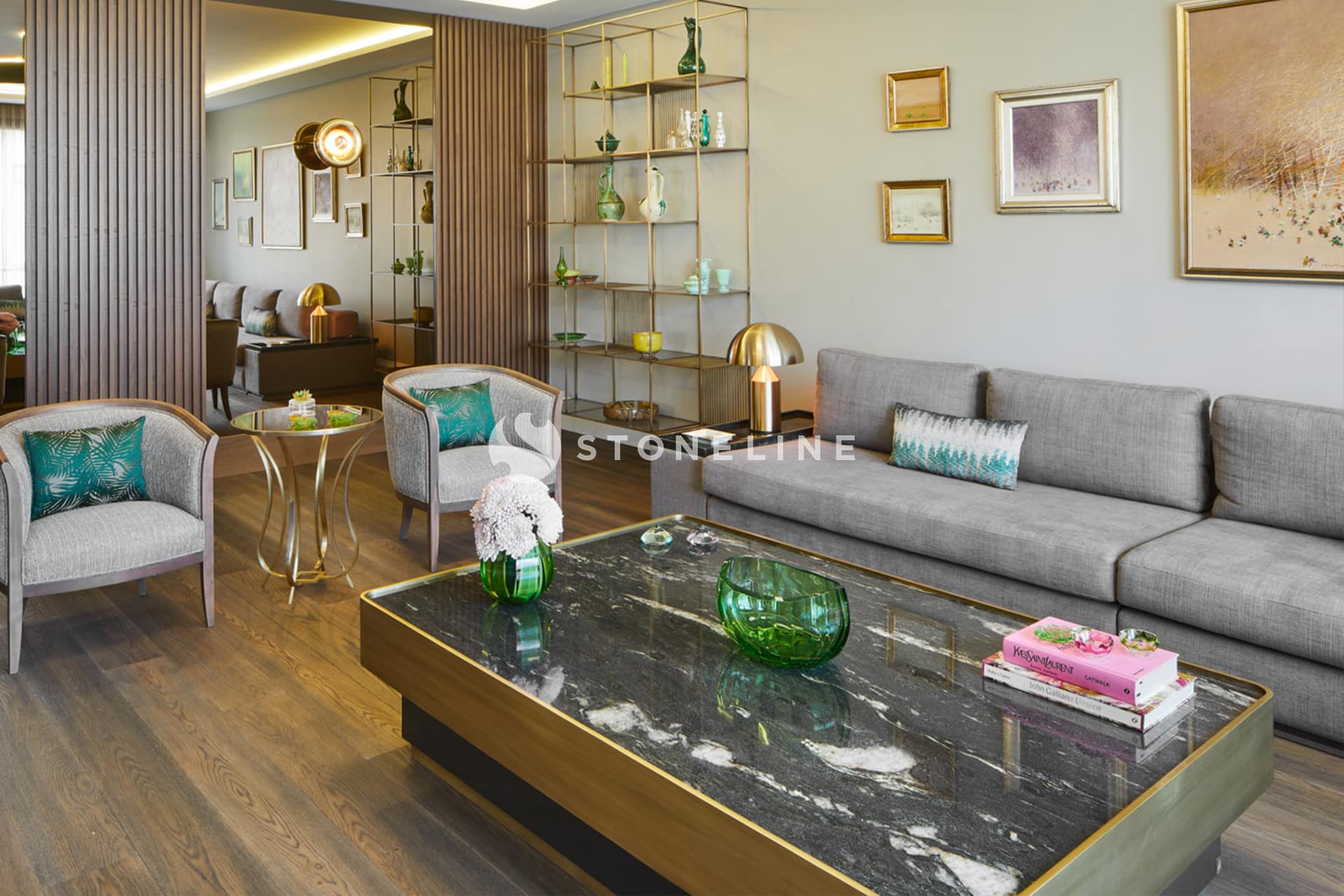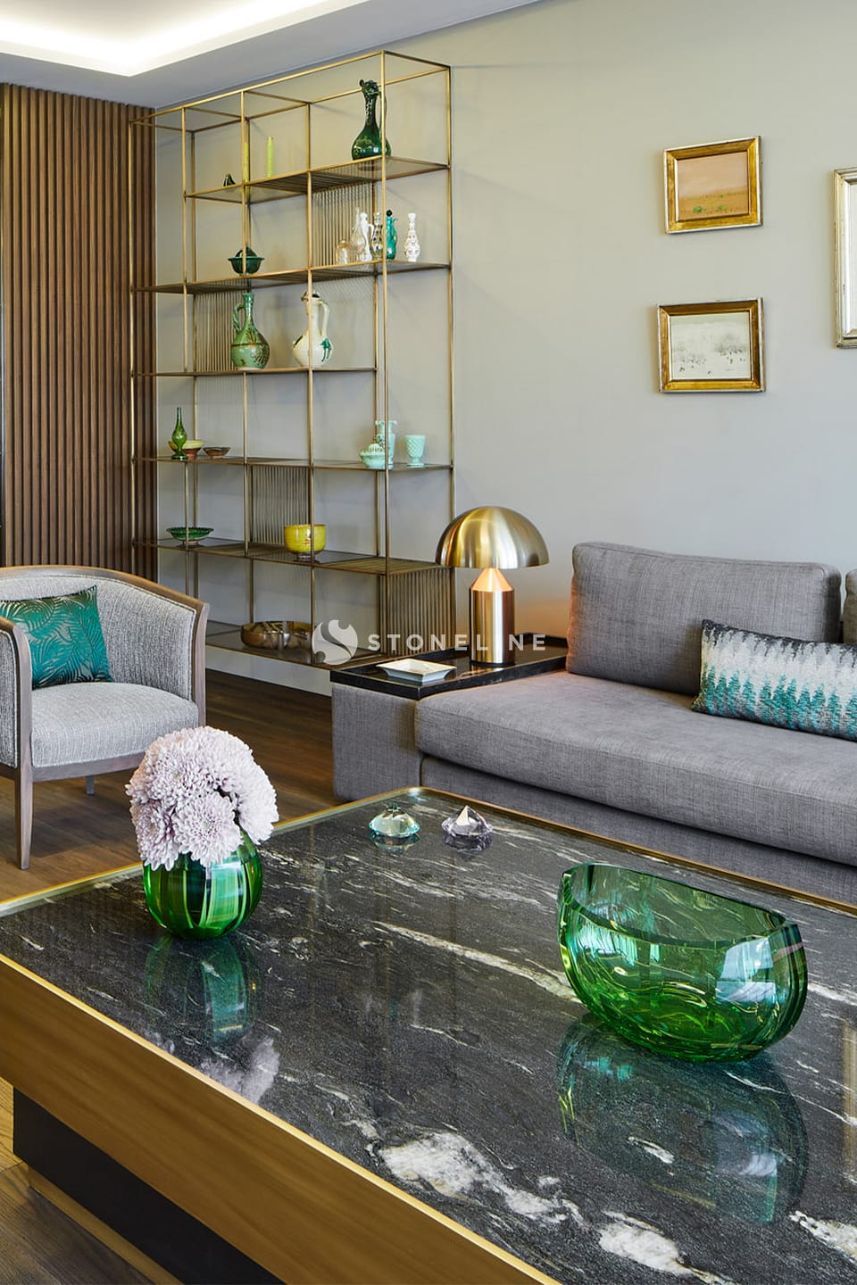 In this residence project, the fireplace is decorated with Nero Africano as a rare natural stone that brings together black and red. The coffee tables are made of Black Horse Extra and Nero Cordoba to reflect the nobility of black. The night tables in the bedroom are made of Calacatta Vogue that reflects the charm of natural stone. You can also discover hundreds of stones from the natural stone selection of Stoneline for your elegant designs.