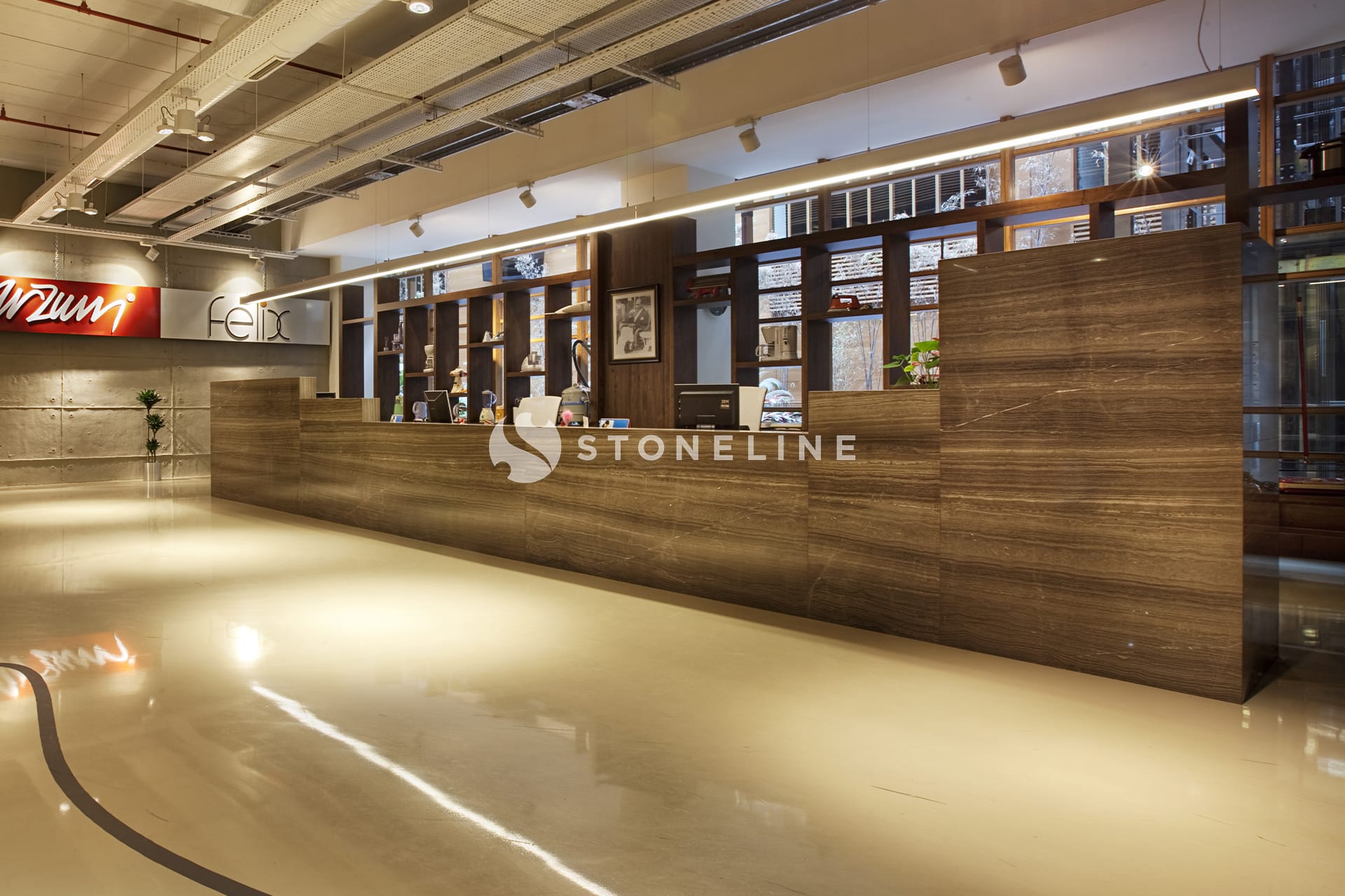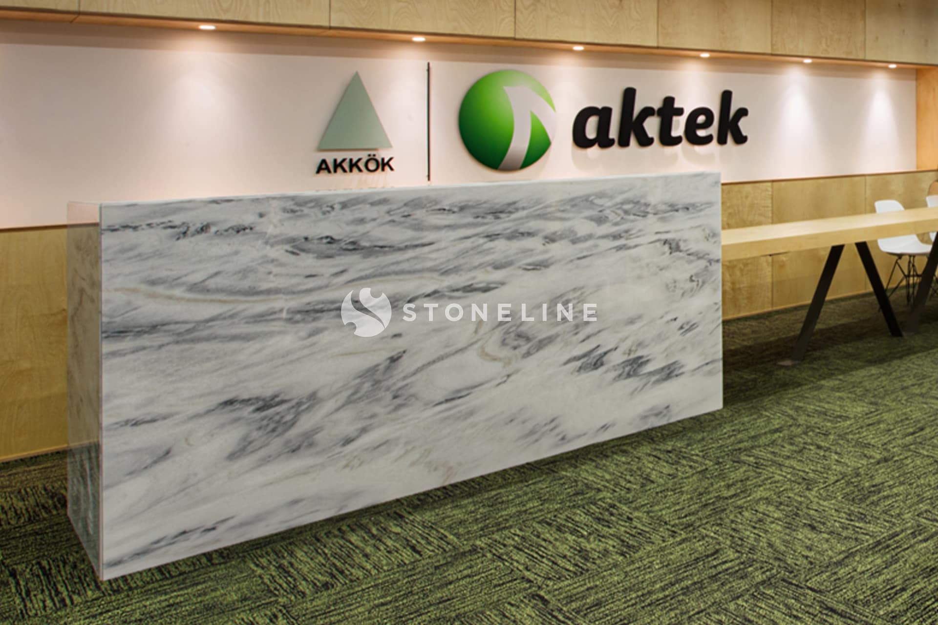 The table samples used in this office project… are designed with natural stone from Bianco Lasa, Brown Serpegiante and Cosmos Black Stoneline. Hundreds of natural stones from Stoneline’s natural stone collection are ready to inspire designers.