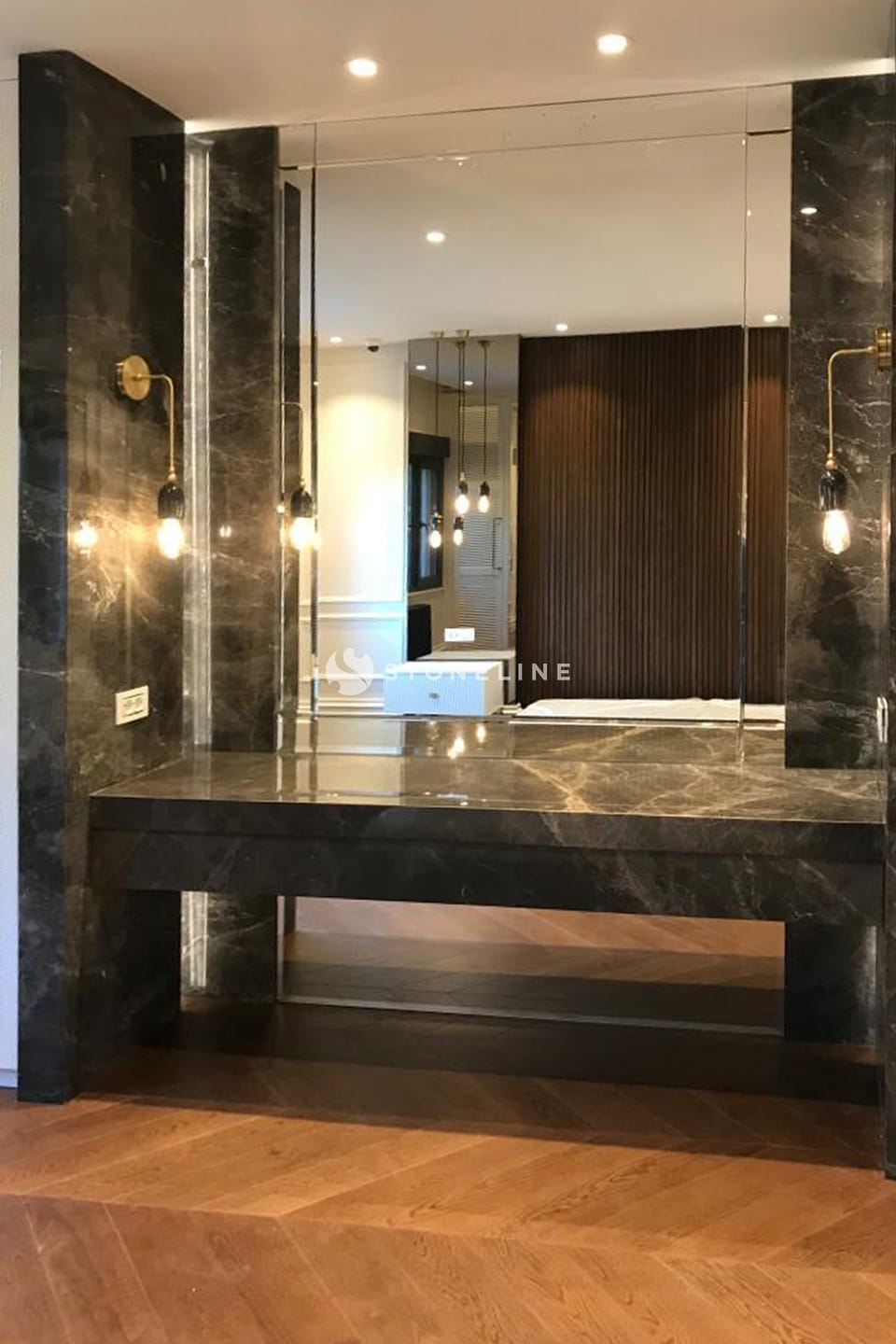 The combination of black and white comes to life with Polar White and King Black marbles as the indispensable element of timeless designs. This project is enriched with Elegant Grey that reflects the dance of colors on the make-up table. Hundreds of natural stones are ready to inspire designers from the natural stone collection of Stoneline.