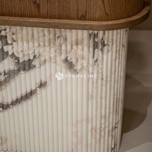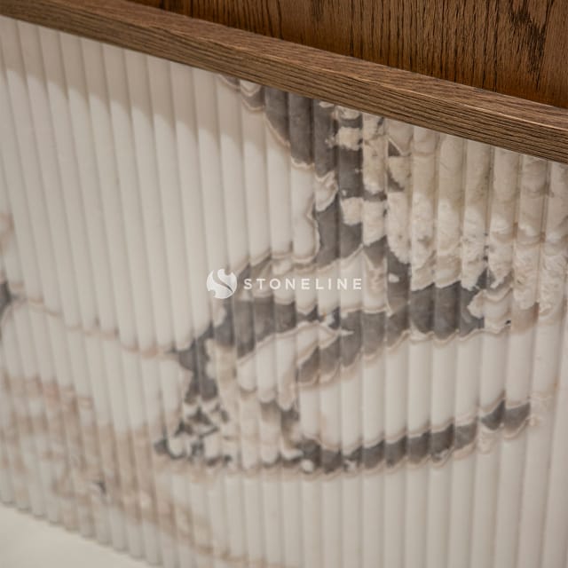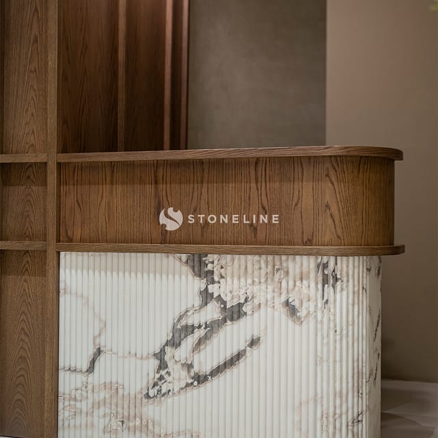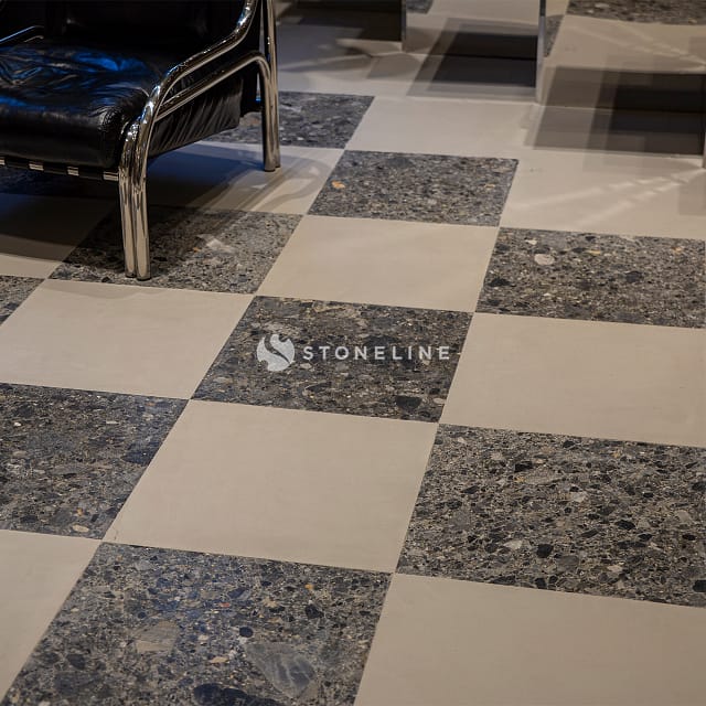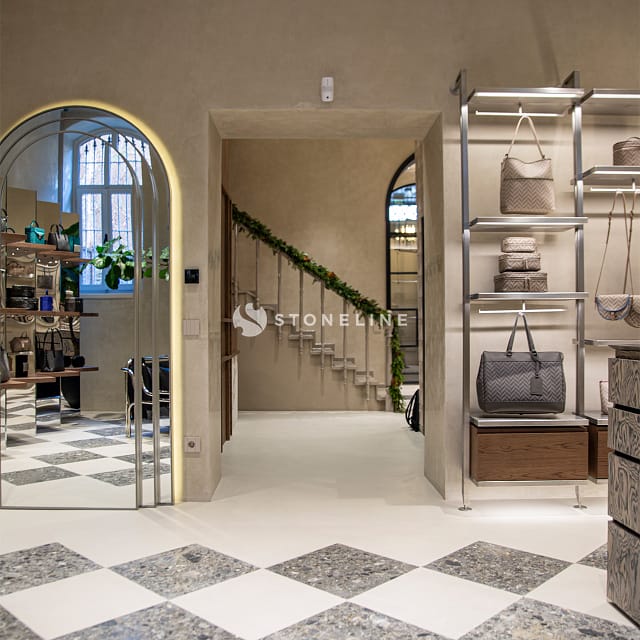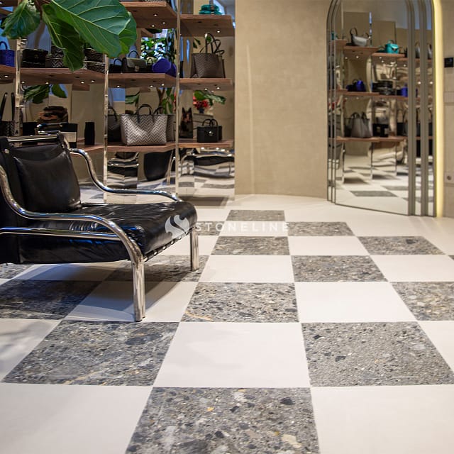 The unique Ceppo Grey and Dove White in Stoneline’s natural stone collection combine elegance and durability in modern store designs.