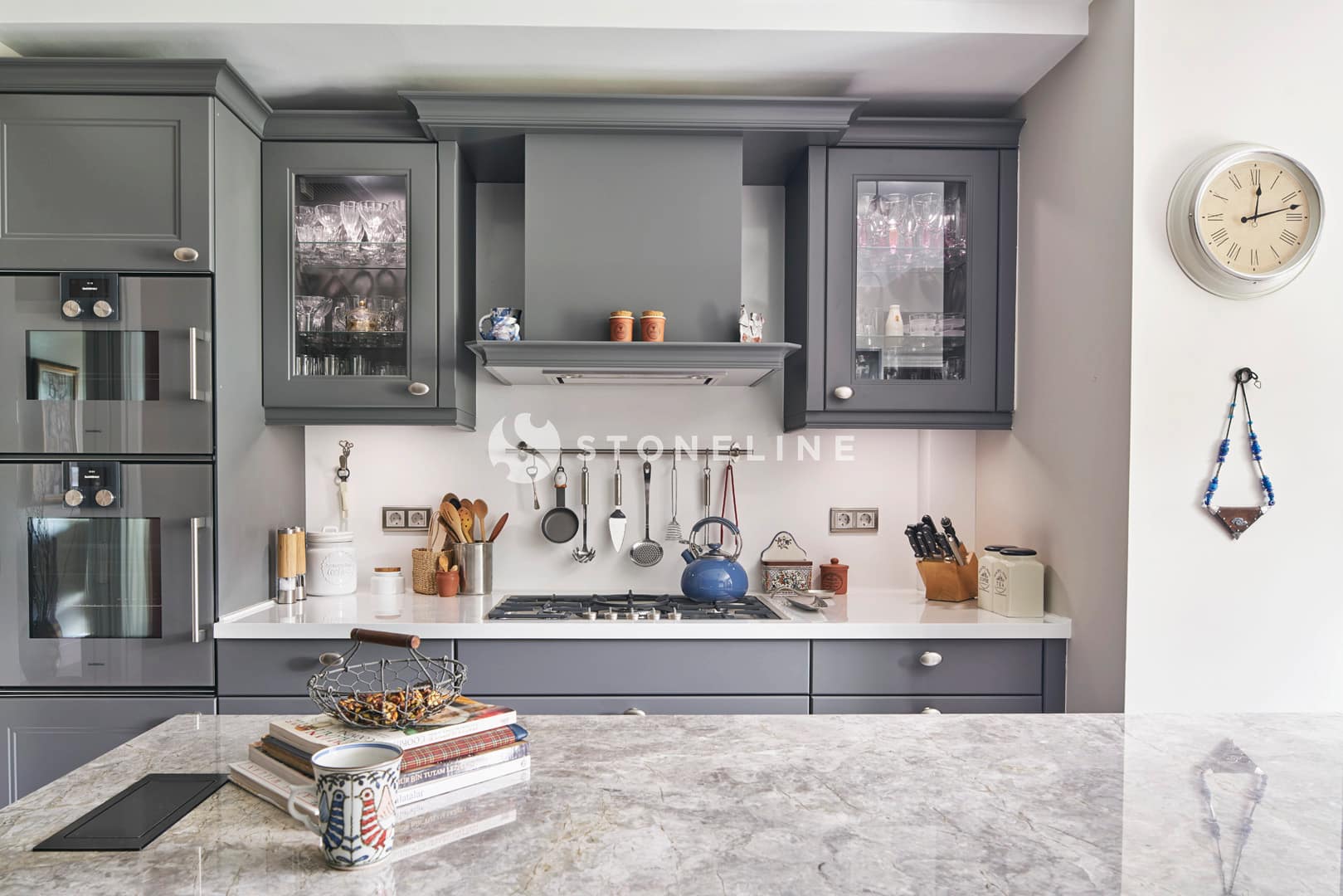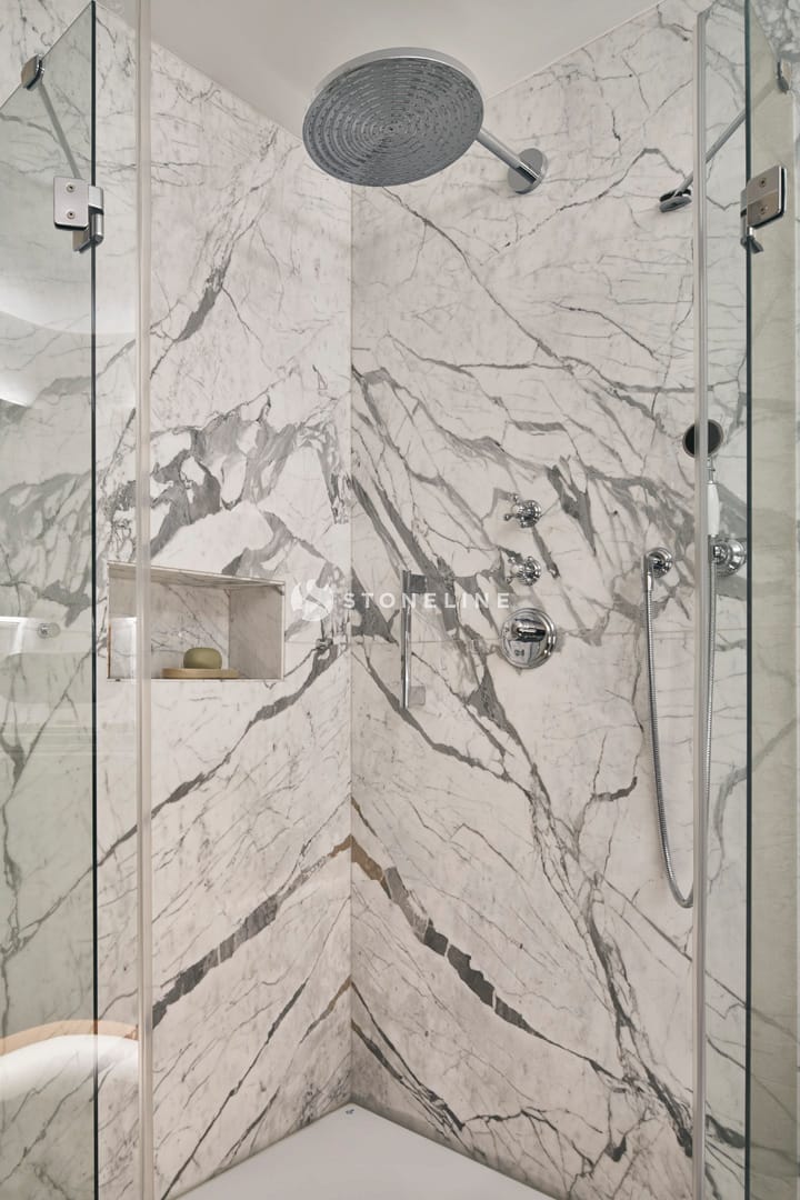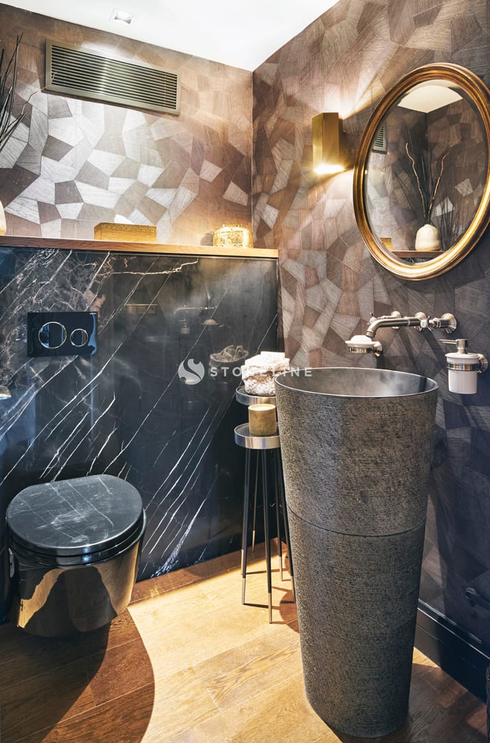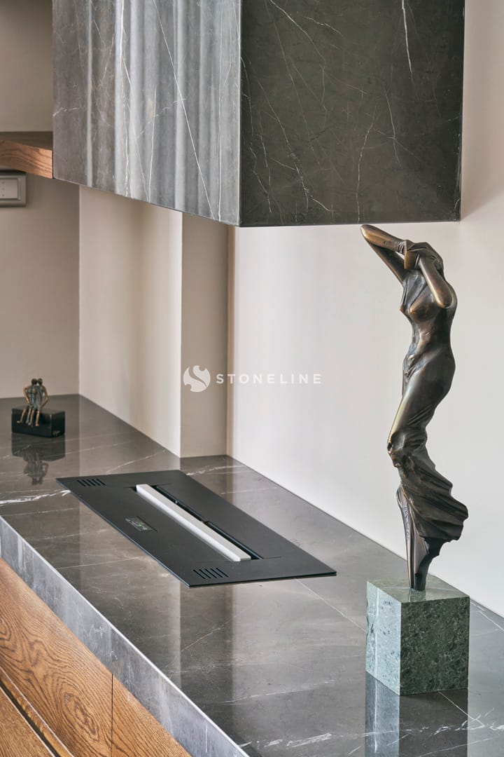 The bathrooms are decorated with Italian classics Statuairo and the nobles form of black King Black while kitchen is decorated with Tundra Grey and finally the fireplace shines out with Graphite that embodies all the attributes modern desings might need with the unique shades of green so far from monotony. Hundreds of natural stones are ready to inspire designers from the natural stone collection of Stoneline.