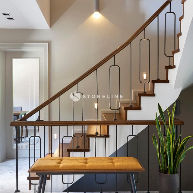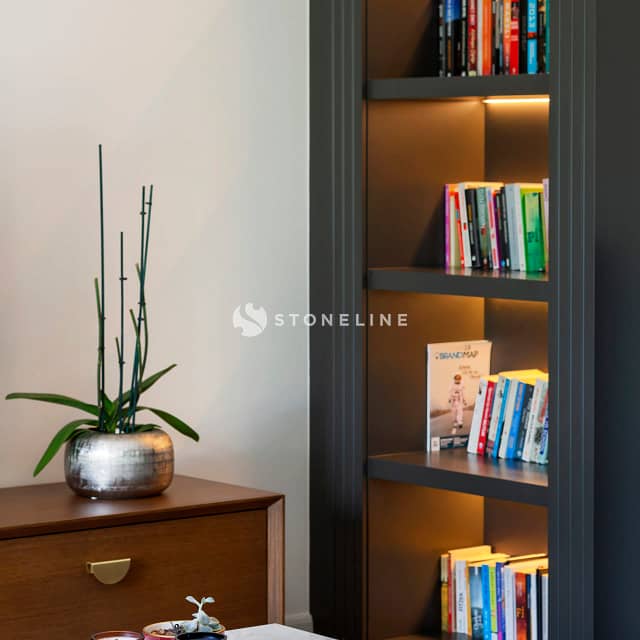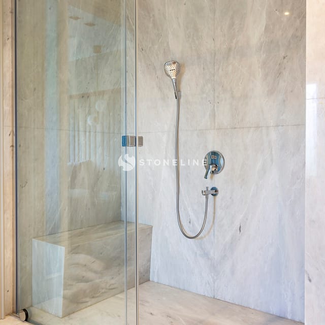 Designed by Monlab Design, this residence project is decorated with Tundra Grey, Polar White and Valentino Grey in the bathrooms for their soft colors and Tundra Grey in the kitchen. The fireplace is decorated with Graphite and Gothic Grey for its modern lines. You can make use of Stoneline’s natural stone collection in your fireplace designs.