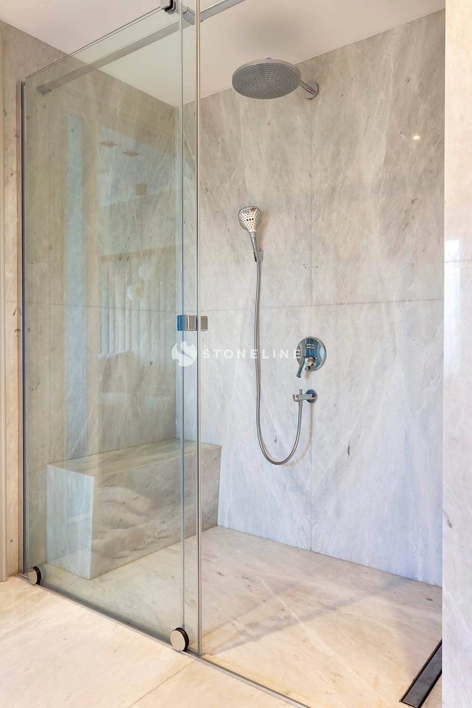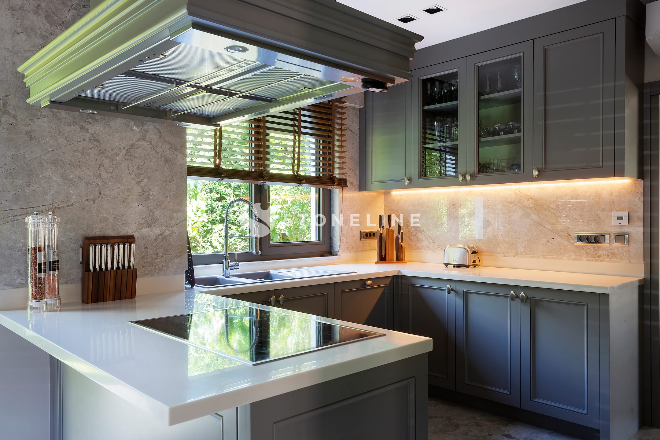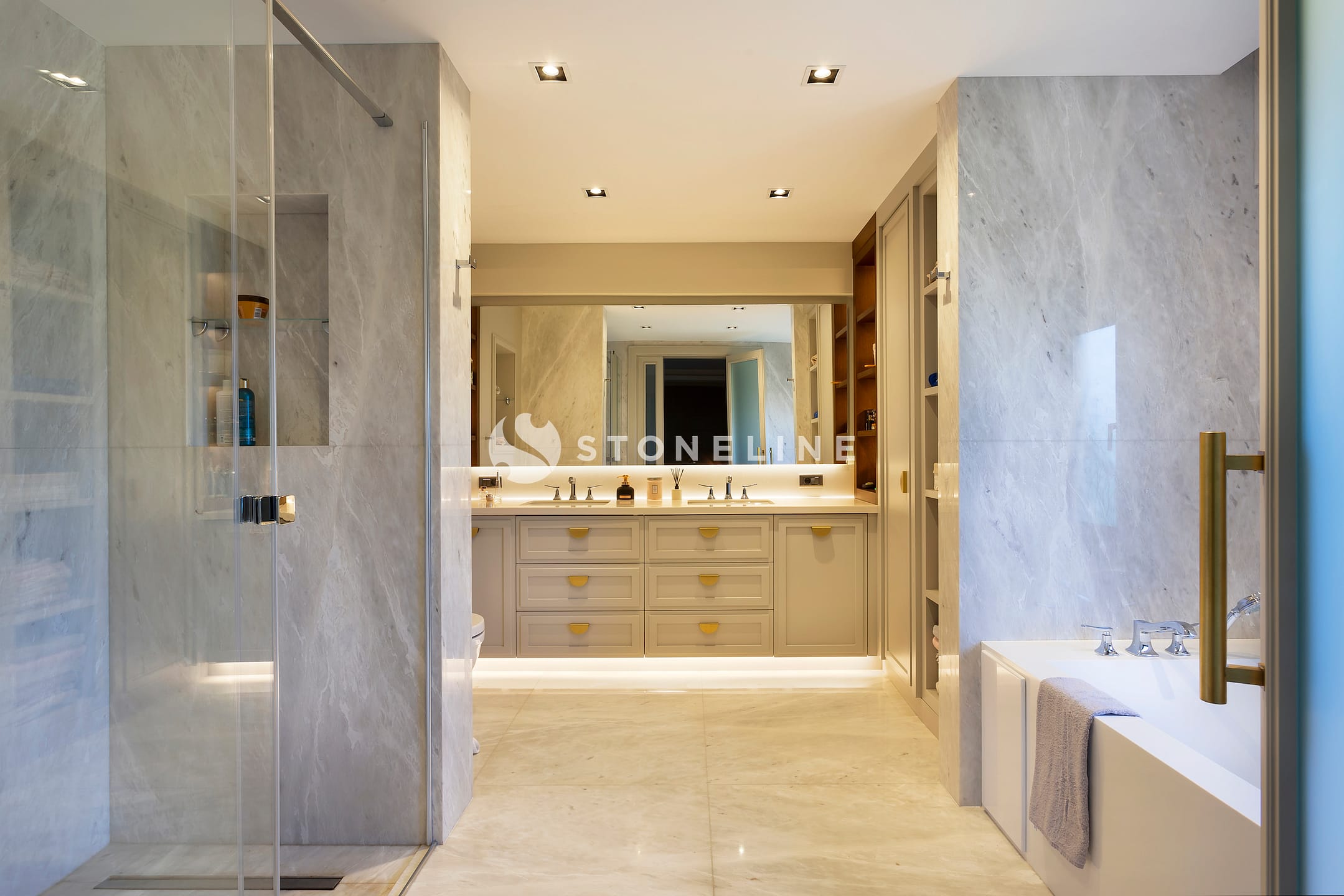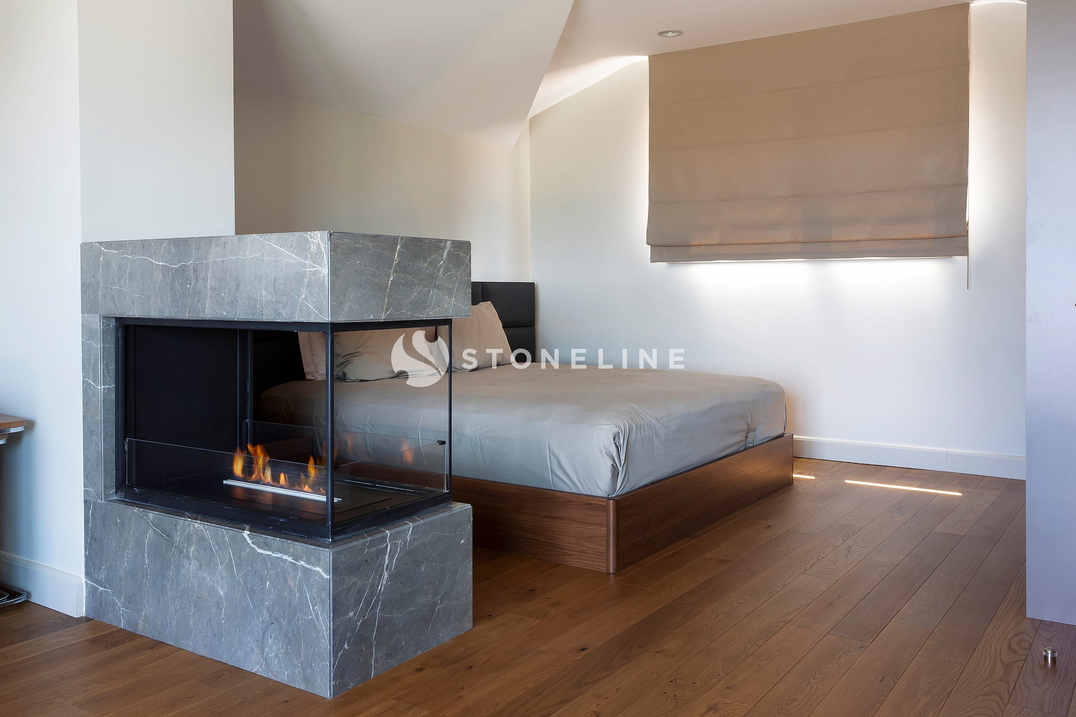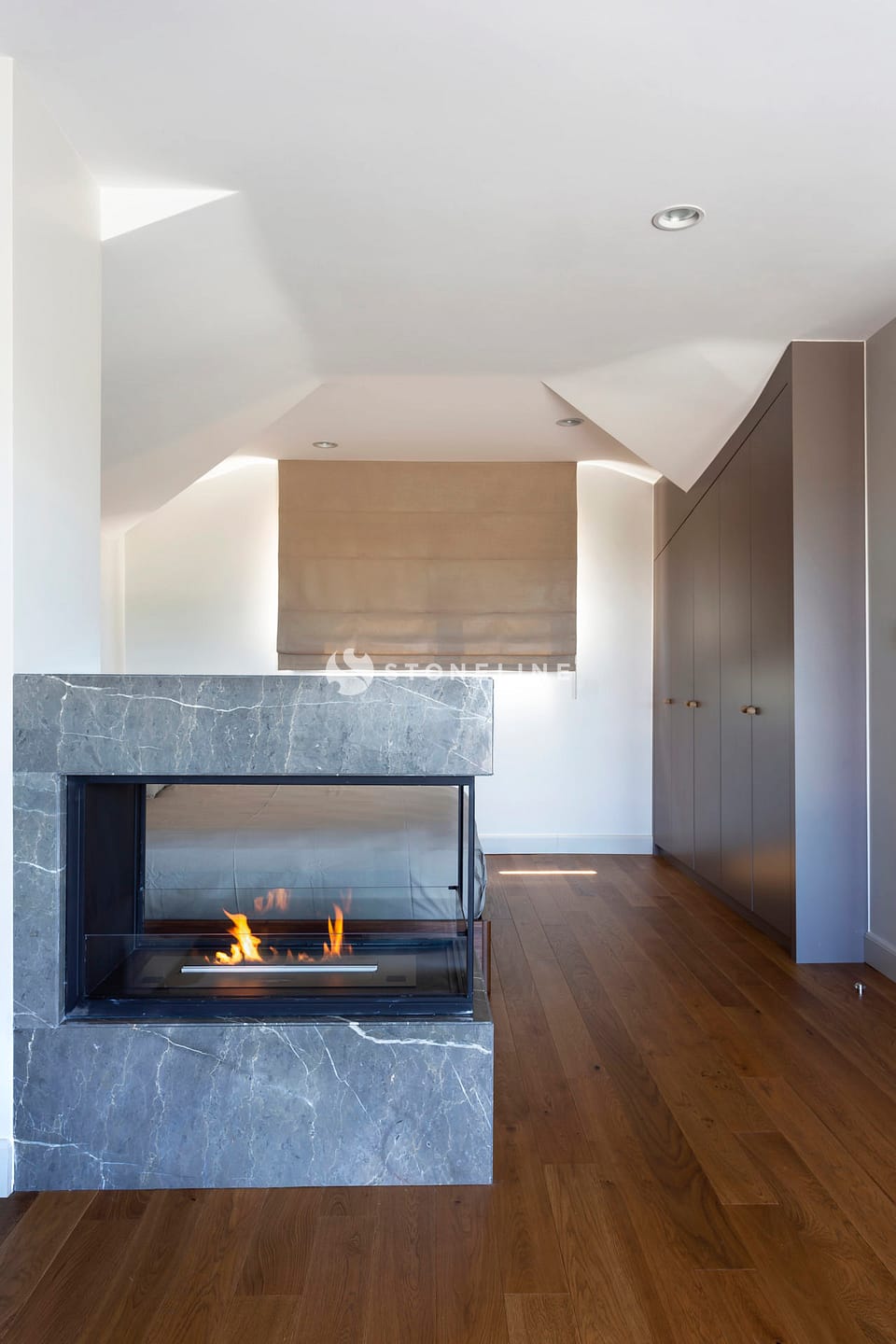 This residence project is decorated with Tundra Grey, Polar White and Valentino Grey in the bathrooms for their soft colors and Tundra Grey in the kitchen. The fireplace features Graphite and Gothic Grey with modern lines, showcasing Stoneline’s elegant natural stone collection.