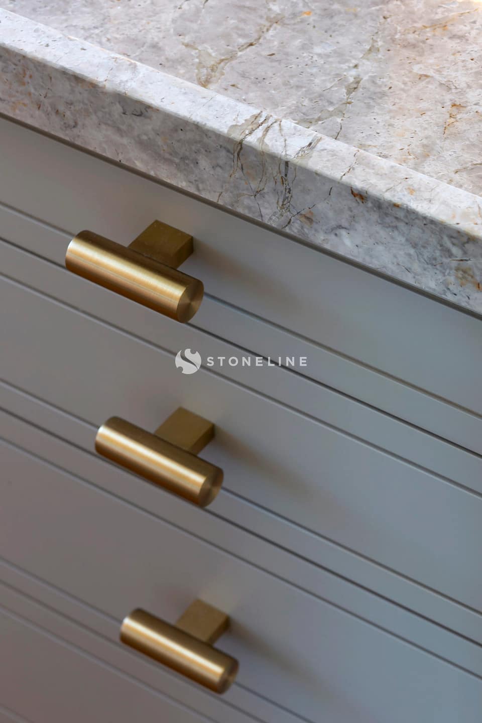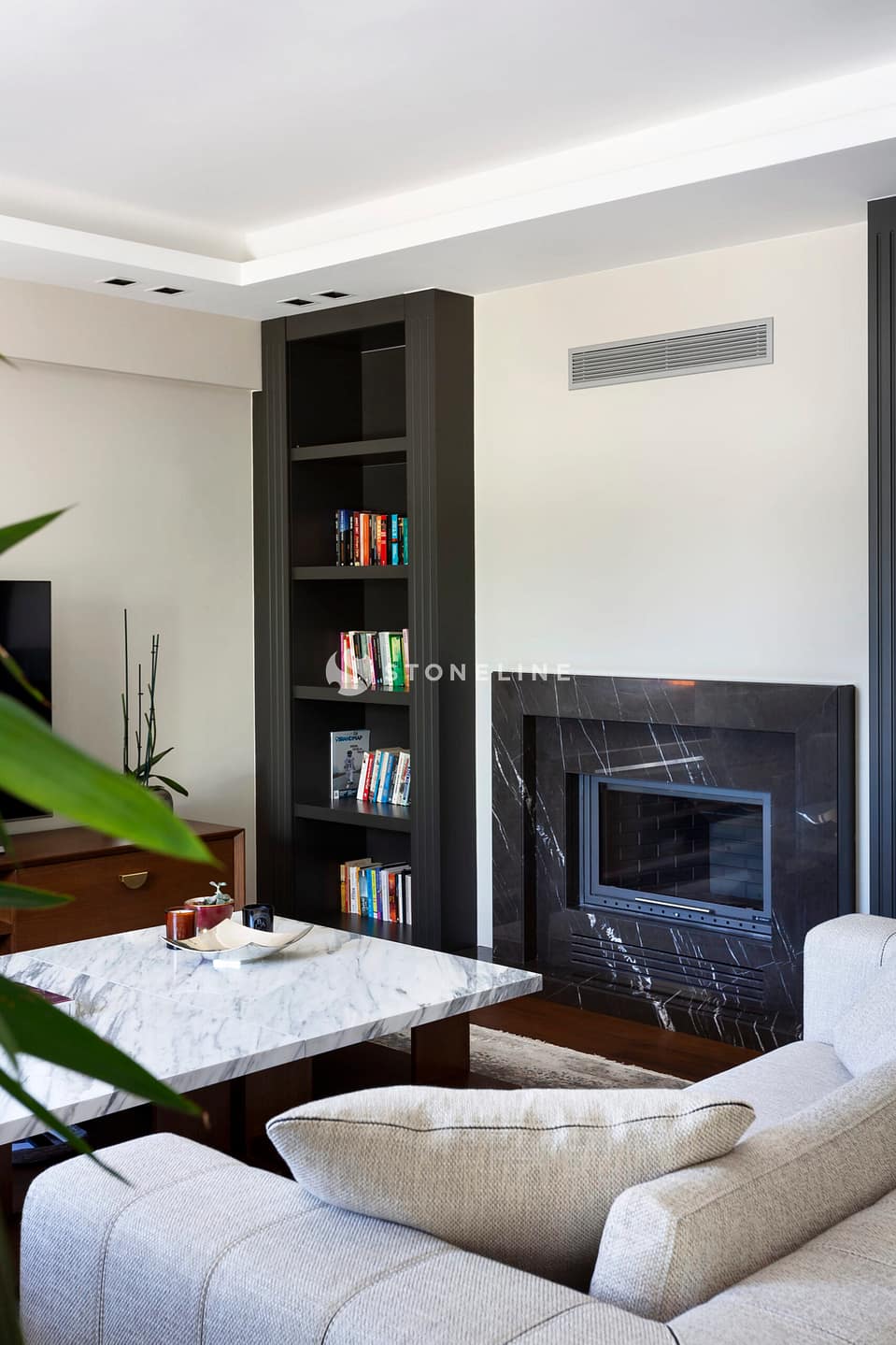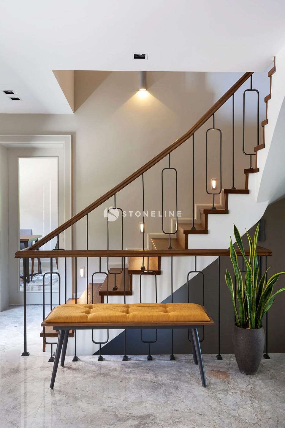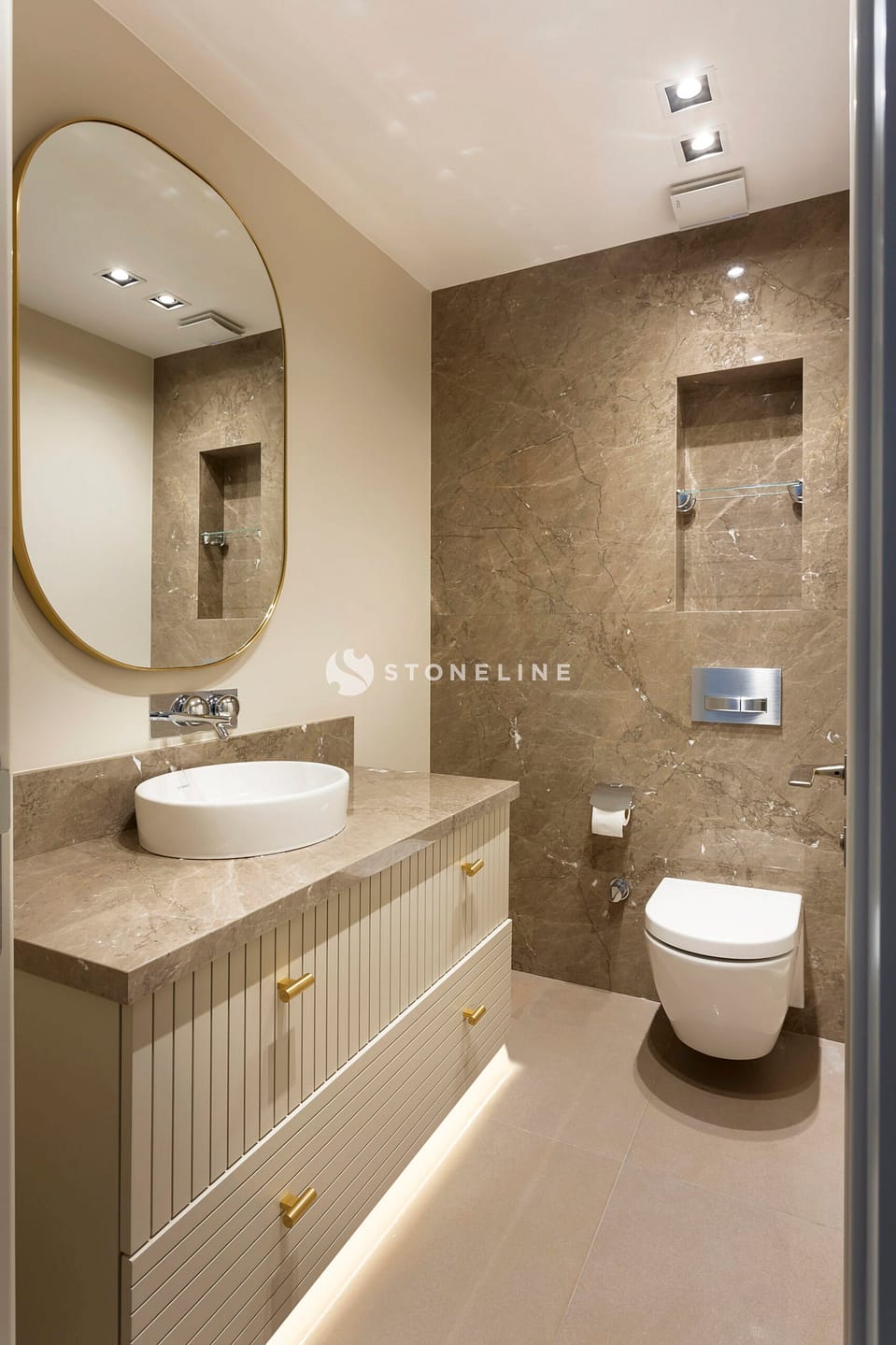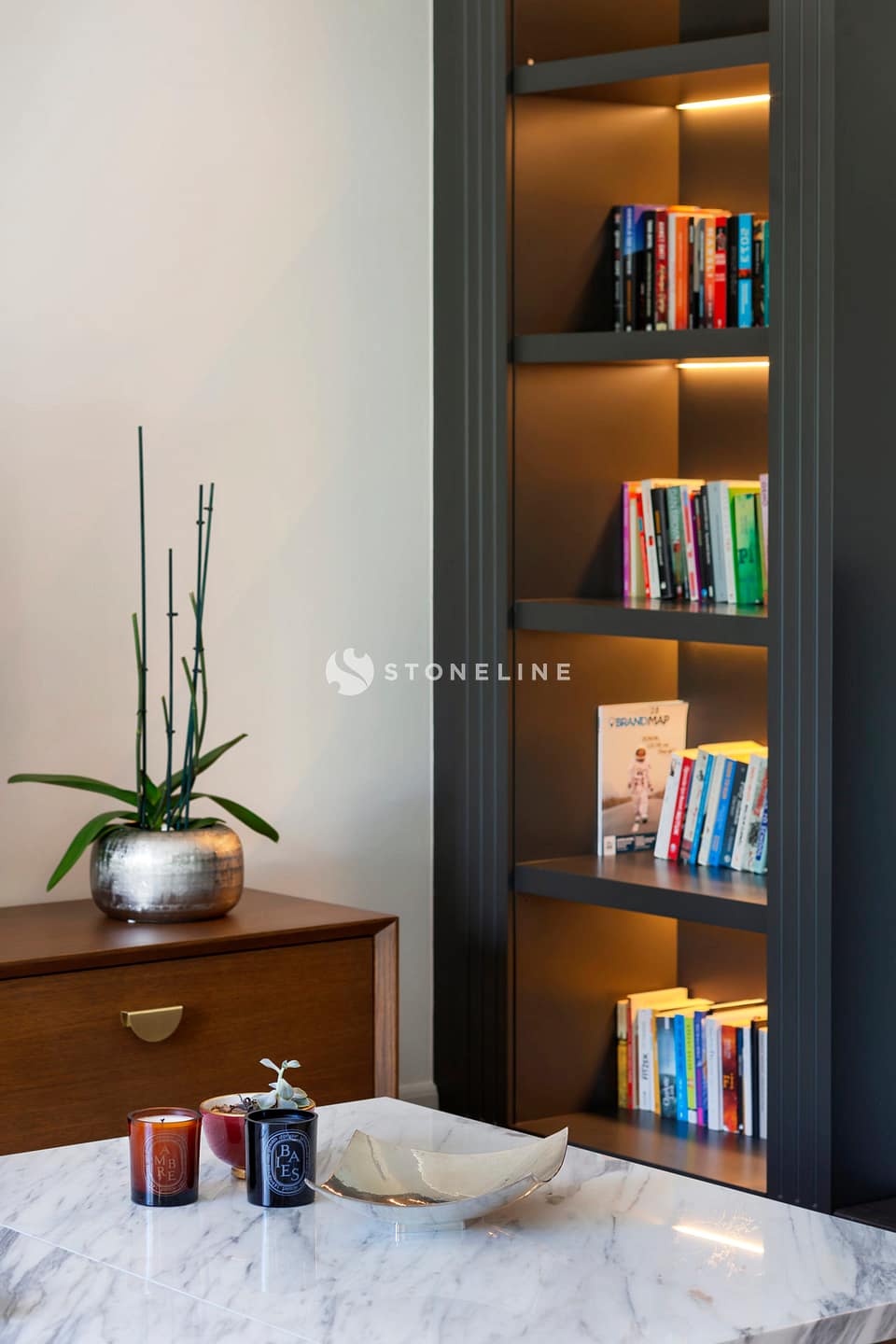 This residence project is decorated with Tundra Grey, Polar White and Valentino Grey in the bathrooms for their soft colors and Tundra Grey in the kitchen. The fireplace features Graphite and Gothic Grey with modern lines, showcasing Stoneline’s elegant natural stone collection.