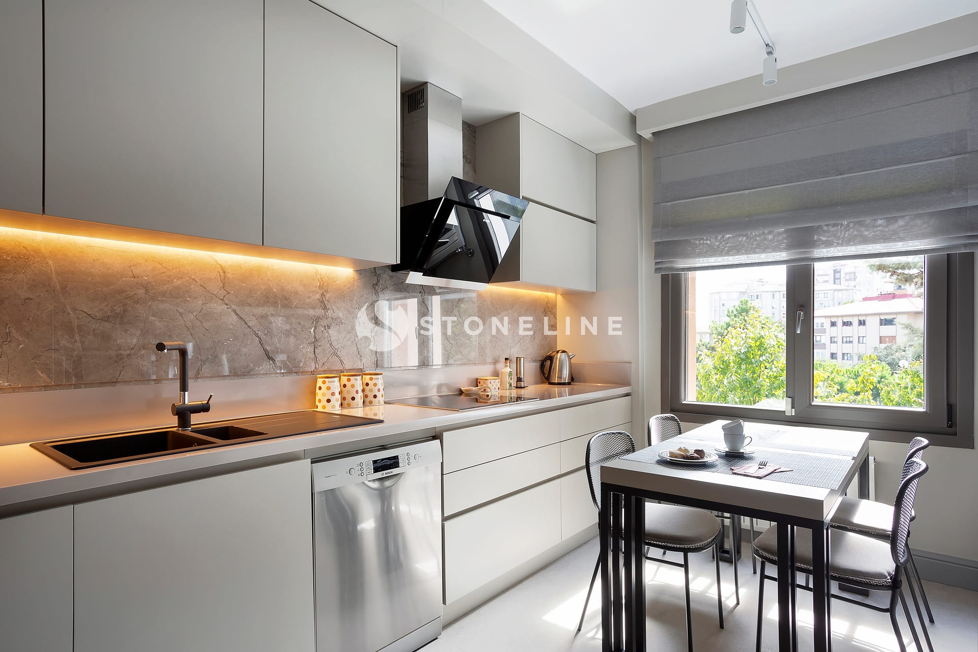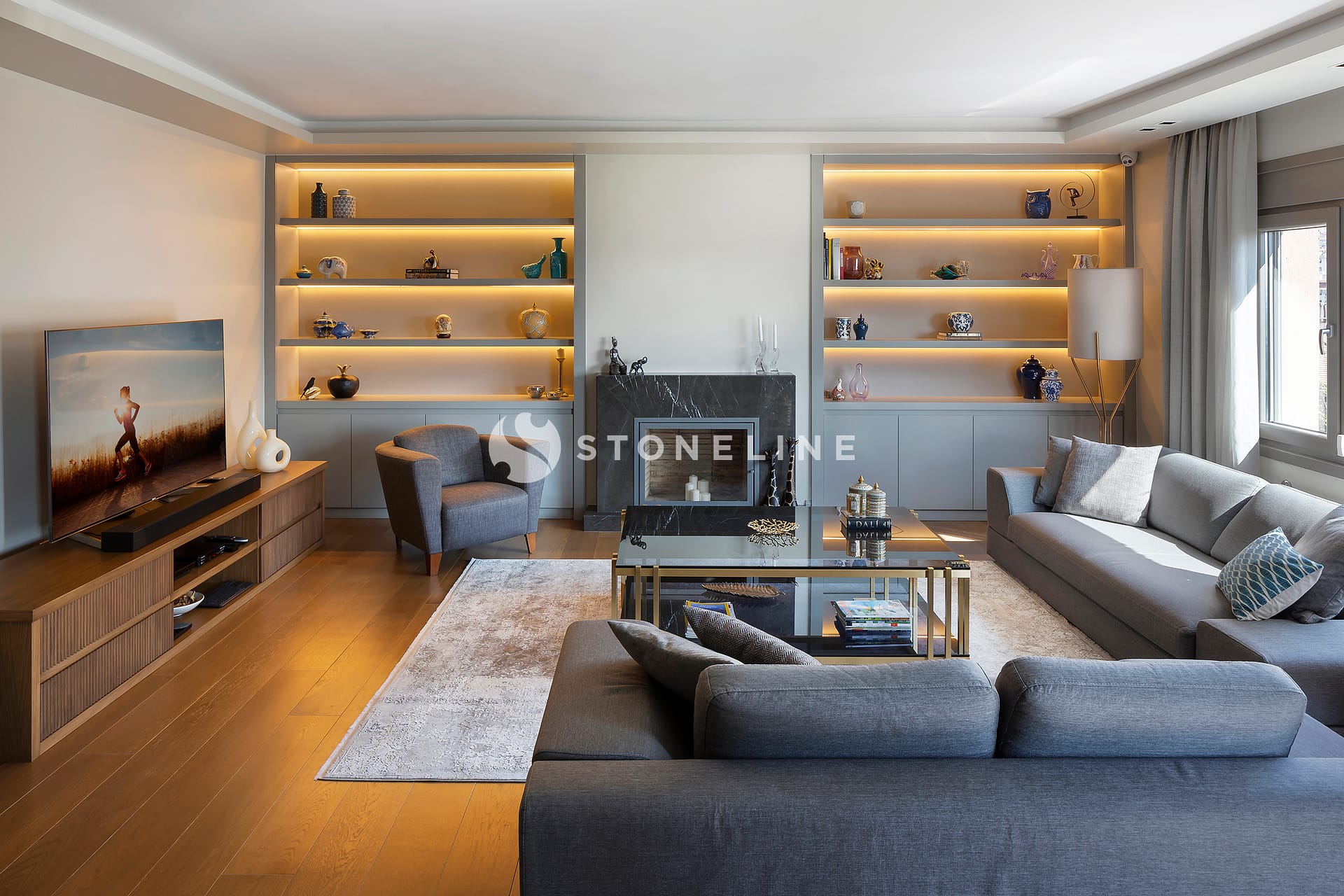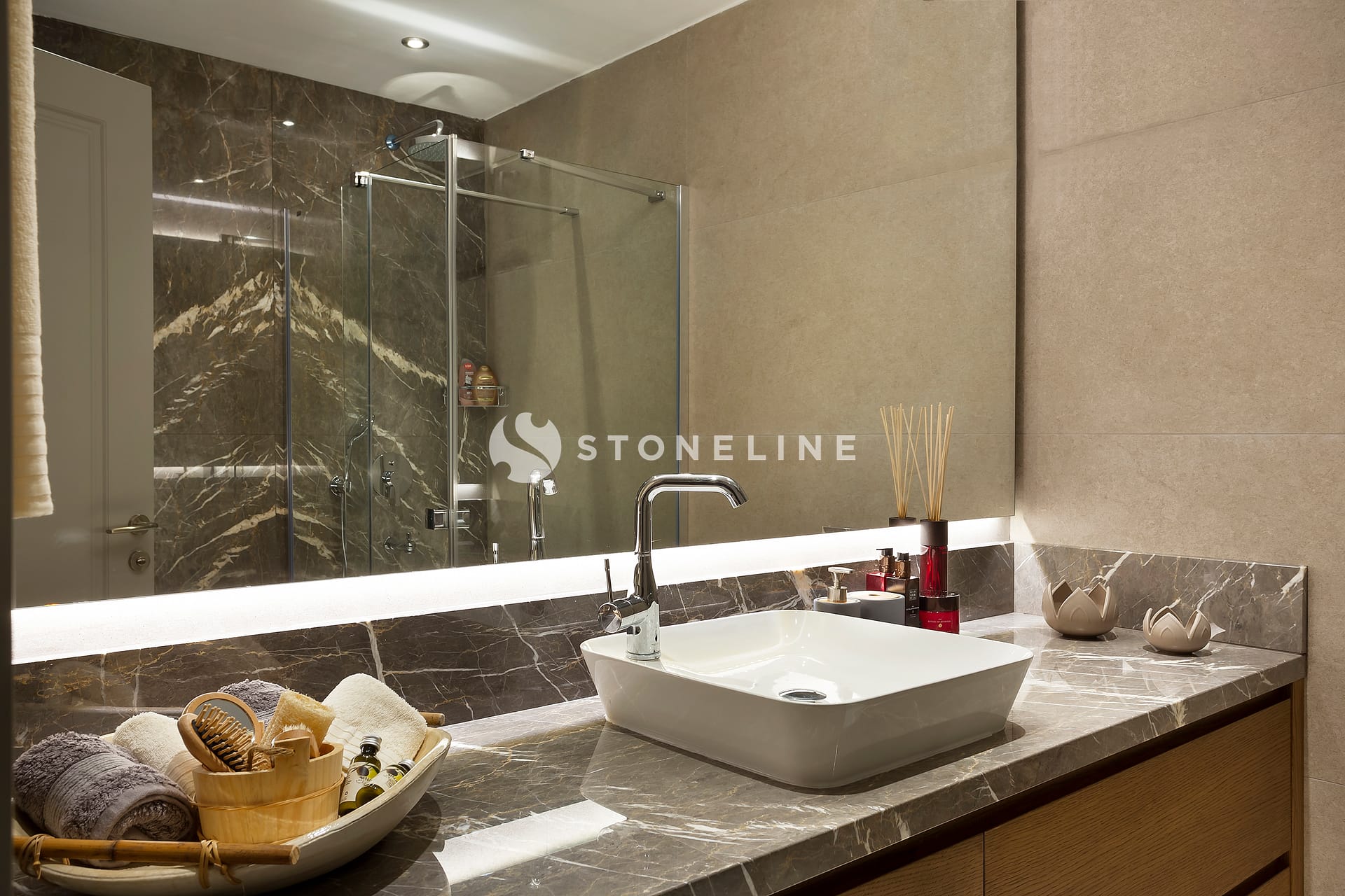 Graphite is preferred in the fireplace for its soft lines and noble color while Valentino Grey decorates the kitchen as one of the rare beauties in nature. Gothic Grey, on the other hand, is preferred in the bathroom as it also offers the possibility of bookmatch. You can make use of Stoneline’s natural stone collection in your fireplace designs.