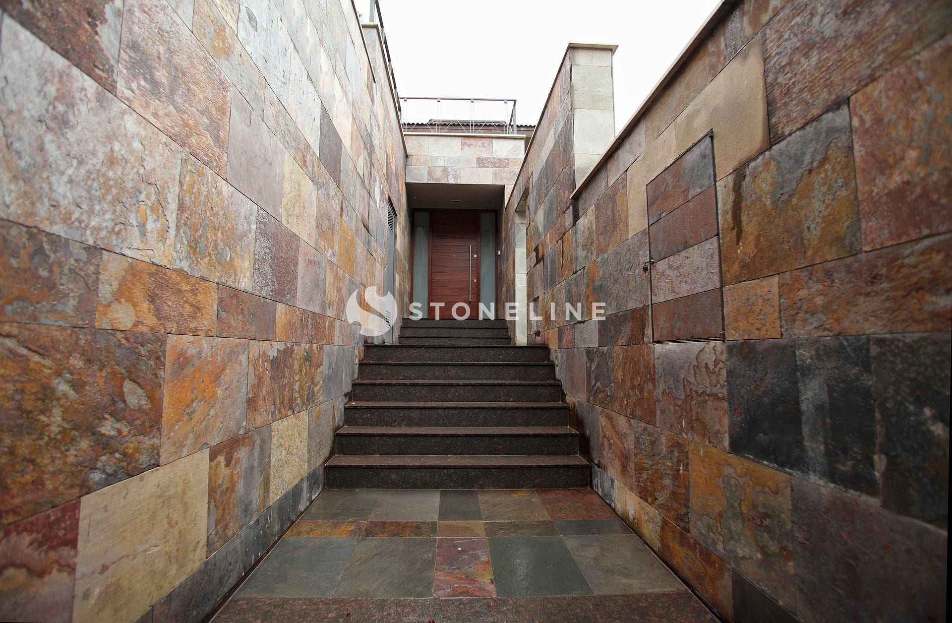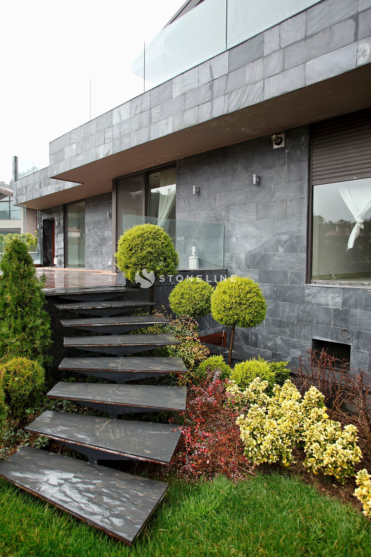 The outer façade and landscaping of this private residence are covered with Slate stone. Slate is a widely preferred natural stone in wet areas, parks and gardens for its anti-slip texture. There are black, yellow, brown, grey, green, maroon and varieties as well as combination of all these colors in Stoneline’s natural stone collection. You can also discover hundreds of stones from the natural stone selection of Stoneline for your elegant designs.