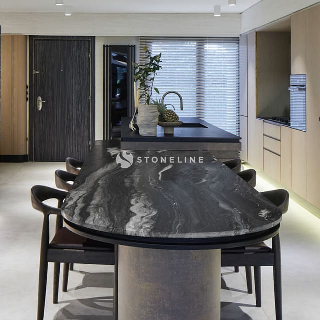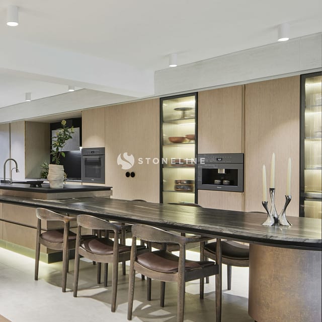Fusion Black was mined from where it had been waiting for thousands of years to play the lead role in such unique design. Its color, vein texture and structure are the main elements complementing this office project. You can also discover hundreds of stones from the natural stone selection of Stoneline for your elegant office designs.